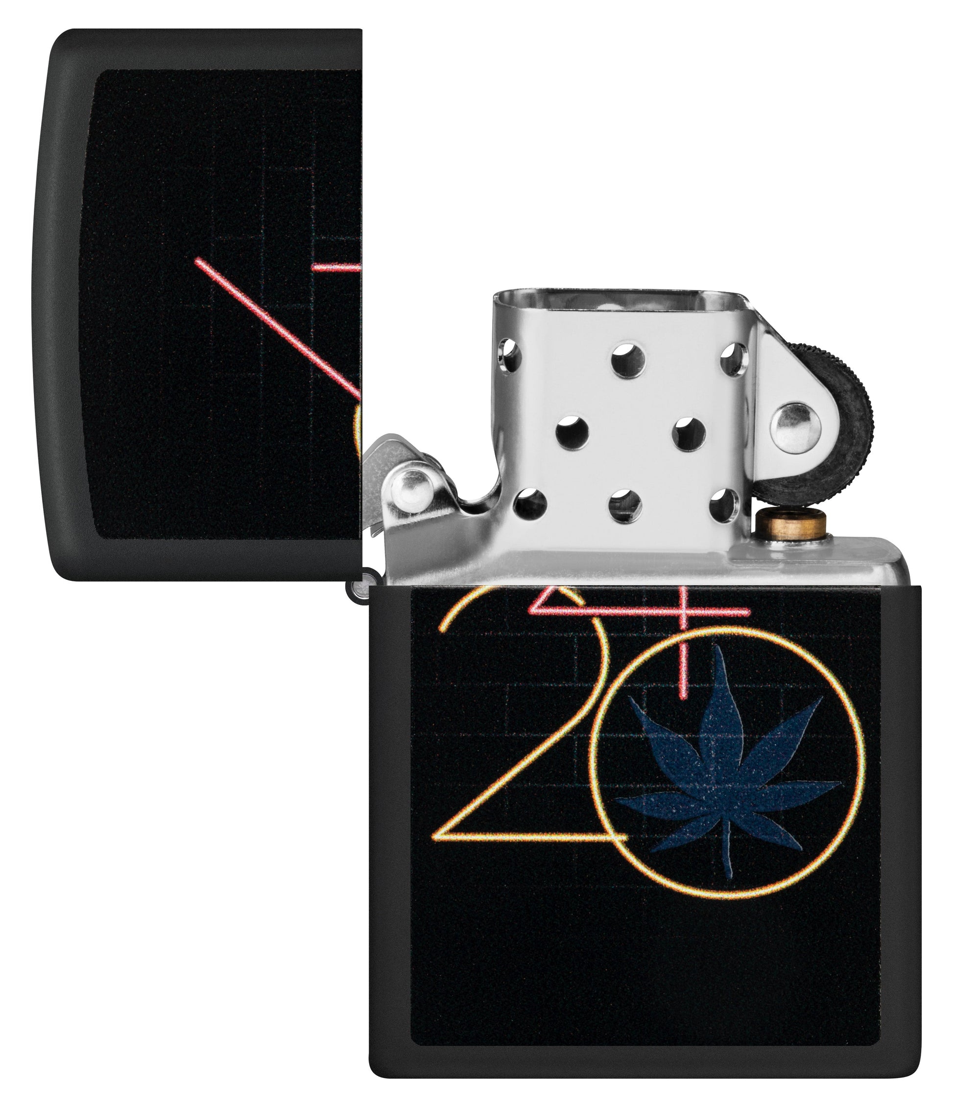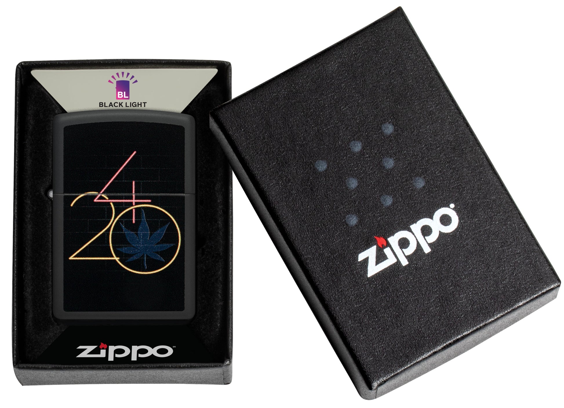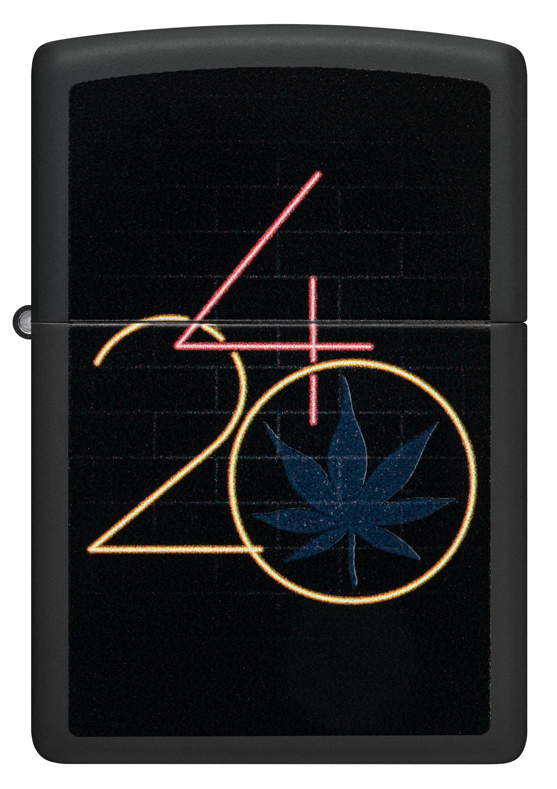 Feiern Sie 420, wann immer Sie wollen, mit diesem eleganten Feuerzeug in Black Matte. Das Color Image-Design mit der Aufschrift „420“ erinnert an Neonlichter, während ein Cannabisblatt mit unserem Black Light-Verfahren unter ultraviolettem Licht zum Vorschein kommt.