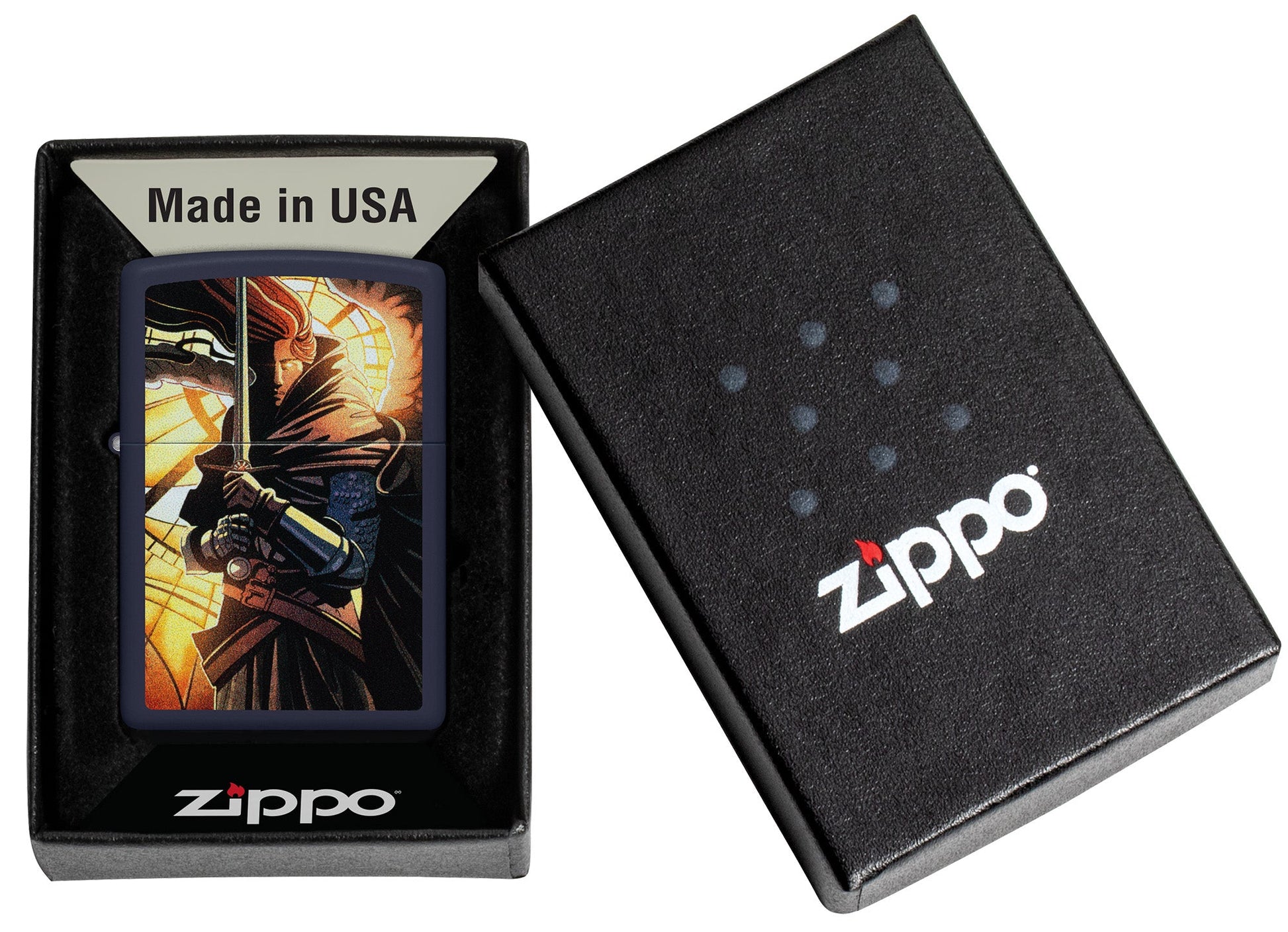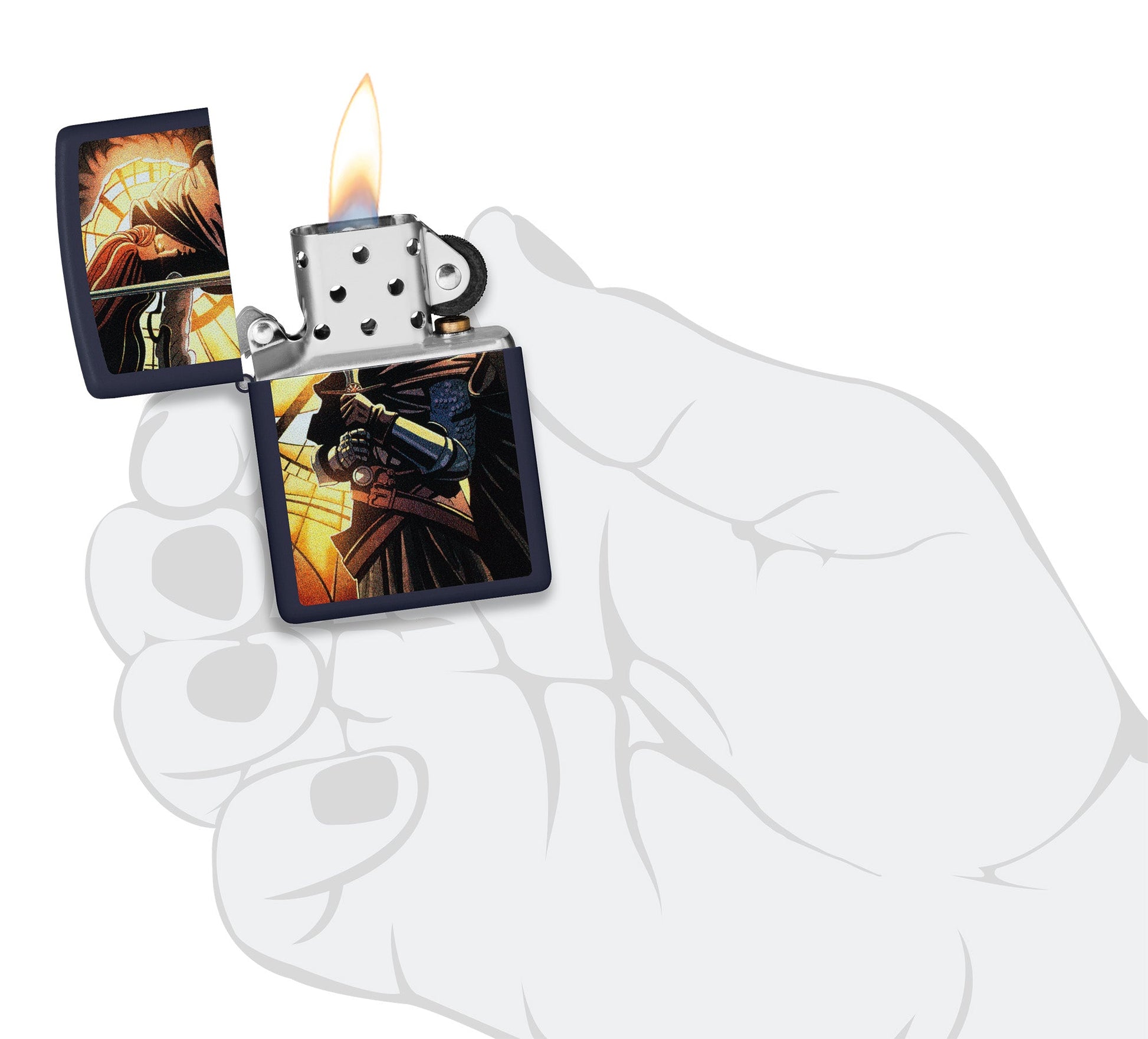 Moderne trifft Mittelalter bei diesem klassischen Feuerzeug in mattem Marineblau. Vor einem leuchtenden Hintergrund steht ein gepanzerter Krieger in einem abstrakten Farbbilddesign bereit für den Kampf.