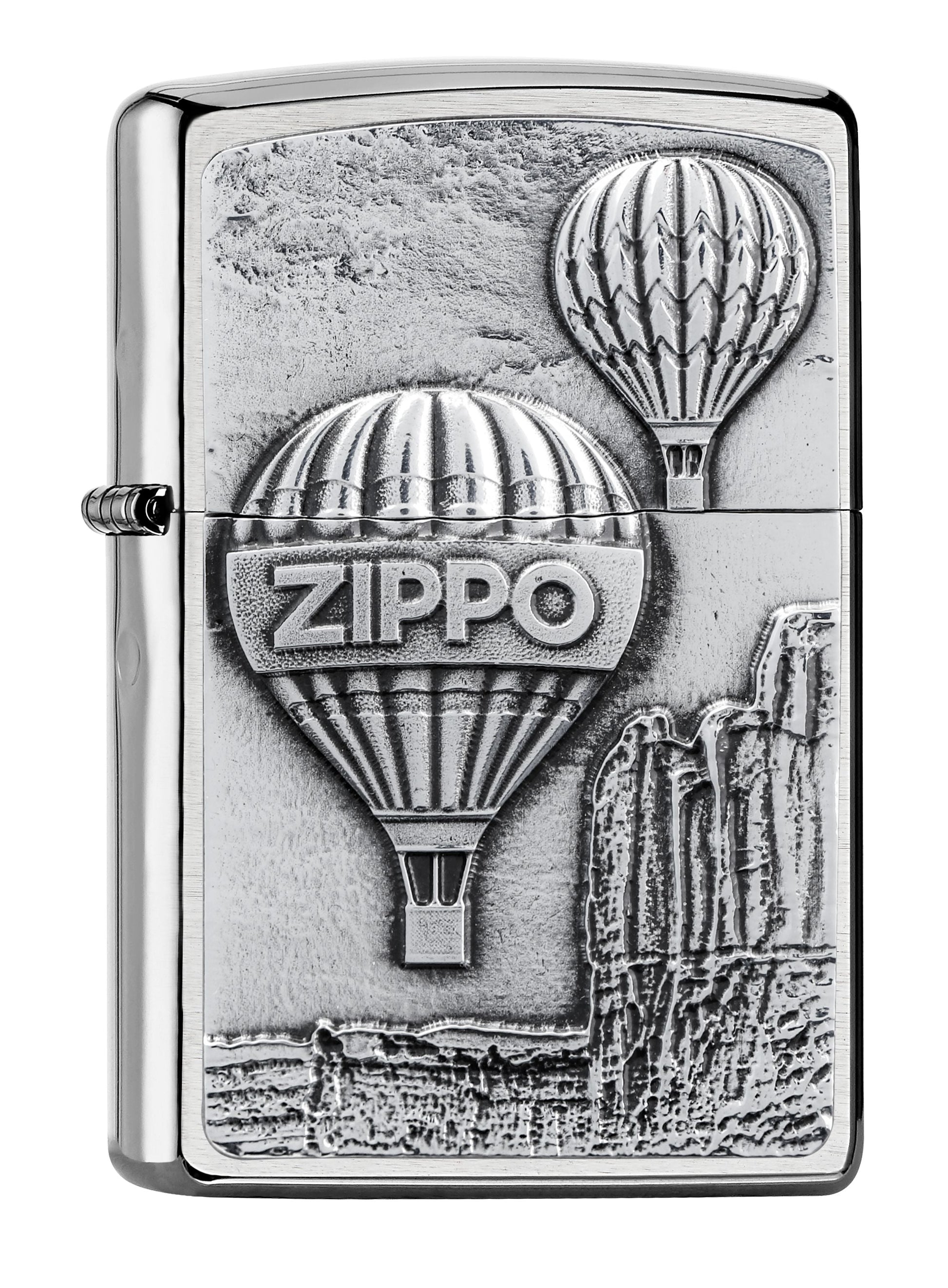 Zwei Heißluftballons, einer davon mit der Aufschrift „Zippo“, schweben auf diesem klassischen Feuerzeug in Brushed Chrome mit einem aufwendig eingravierten Metallemblem anmutig über felsige Klippen.