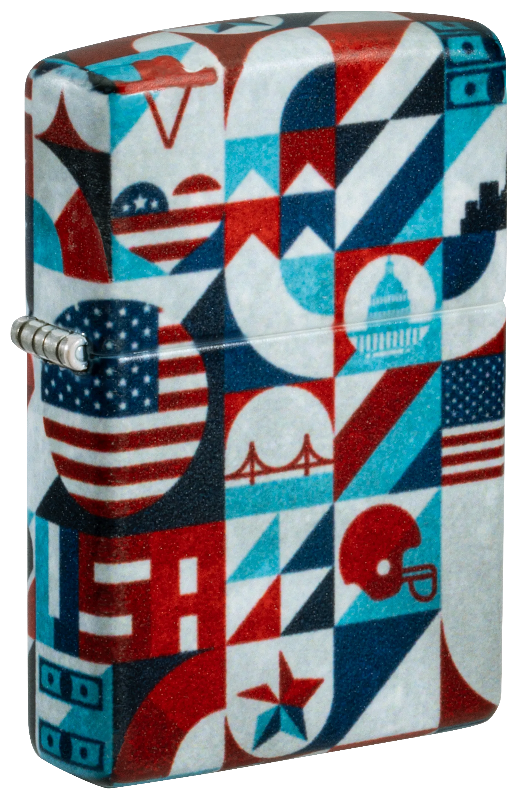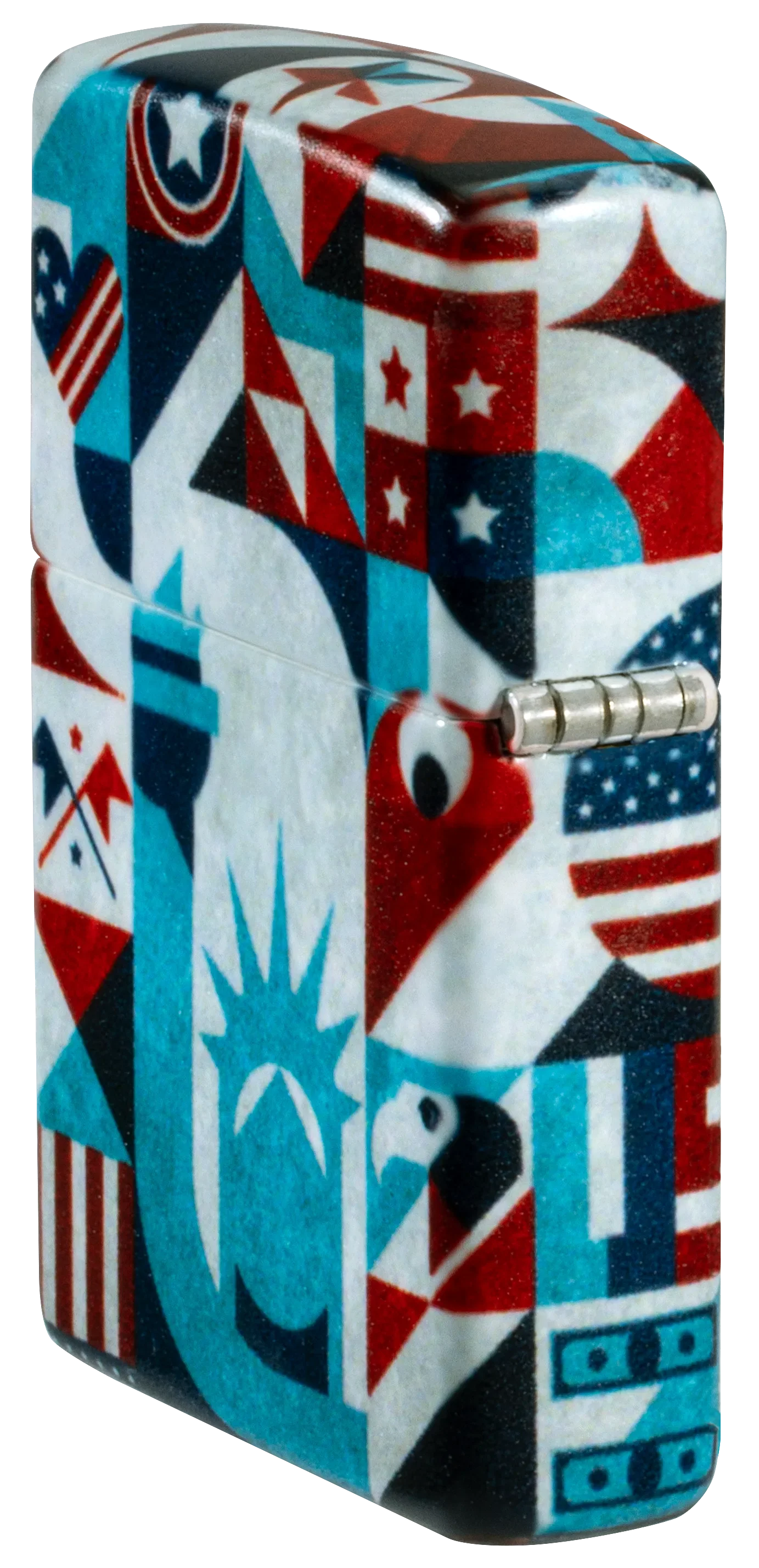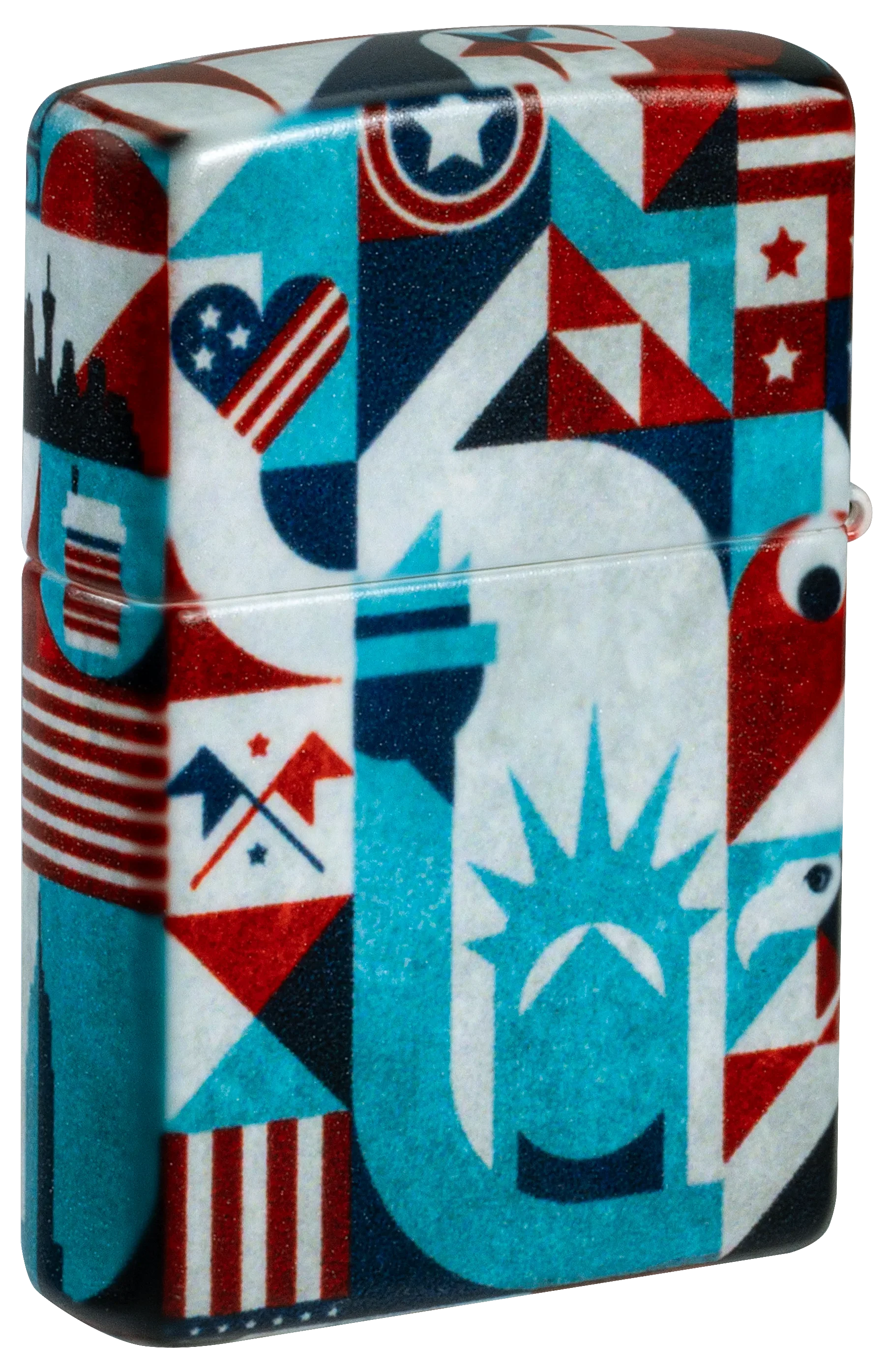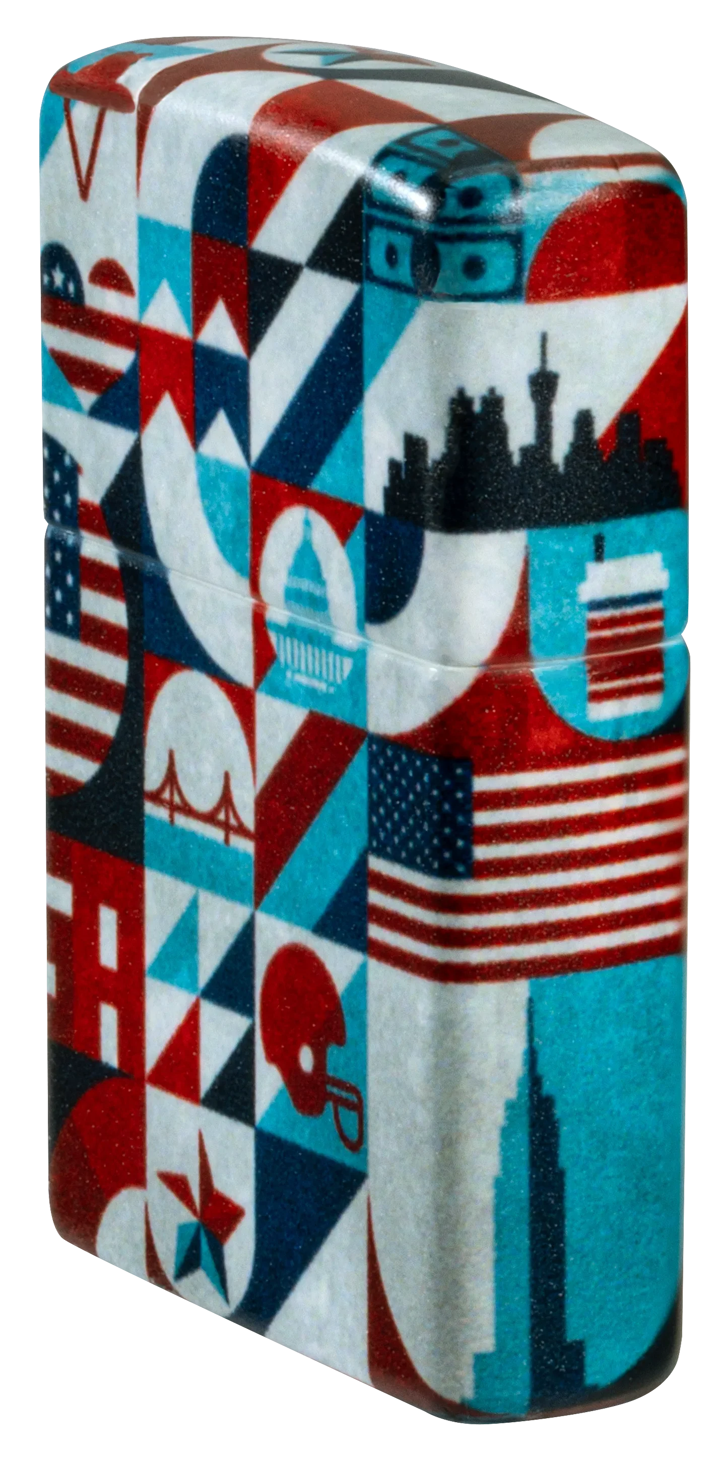 Alle Seiten dieses klassischen 540 Color-Feuerzeugs sind mit Wahrzeichen und Symbolen der USA in lebendigem, patriotischem Design bedeckt.