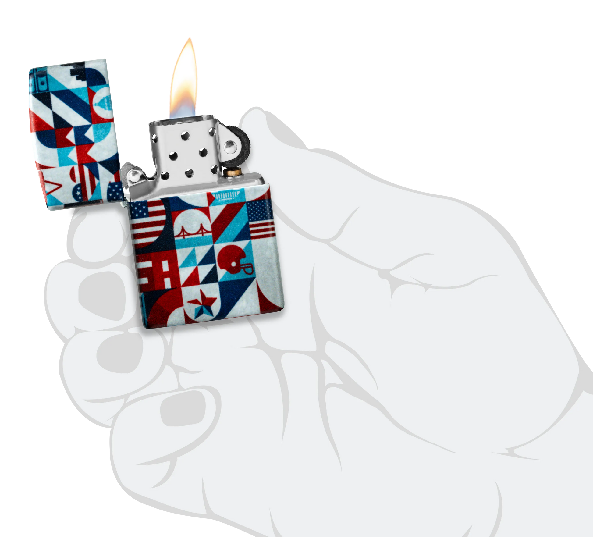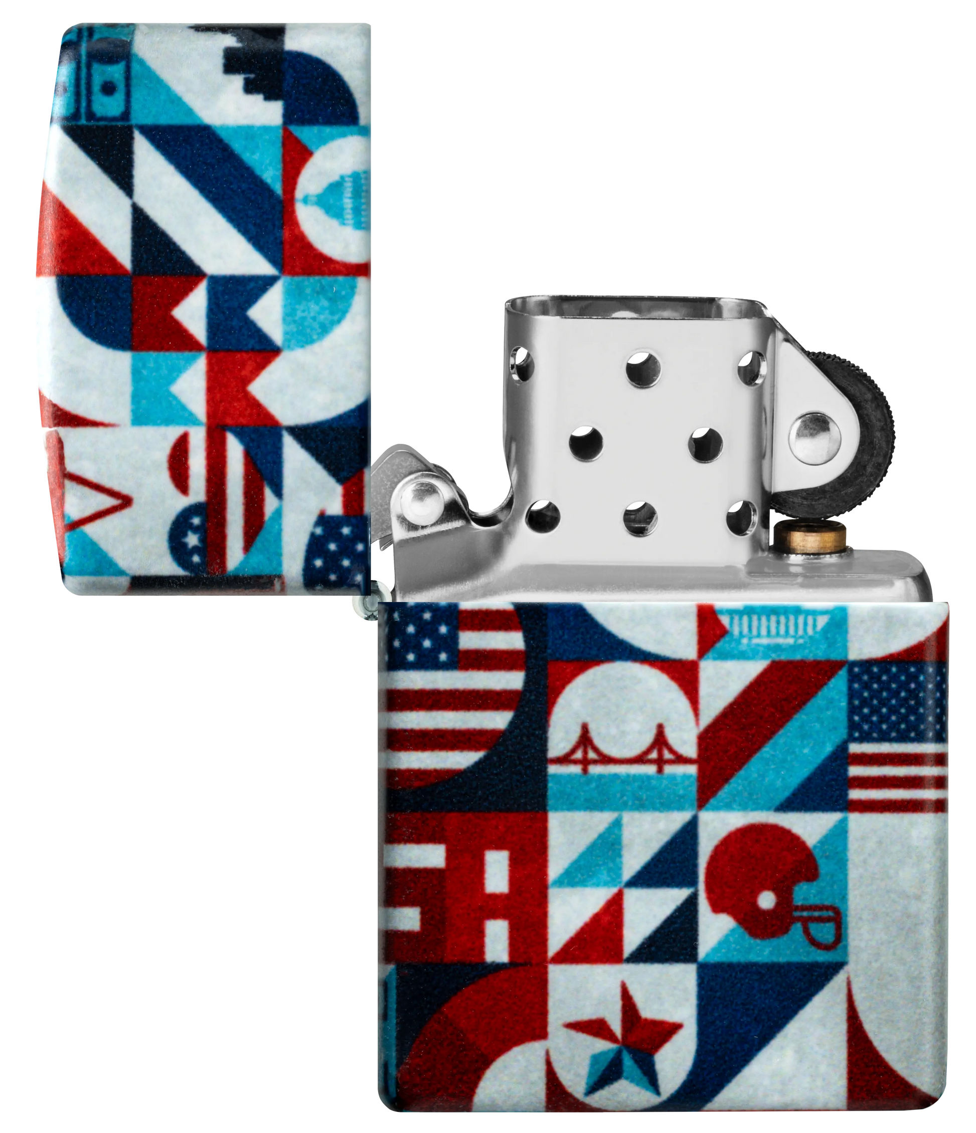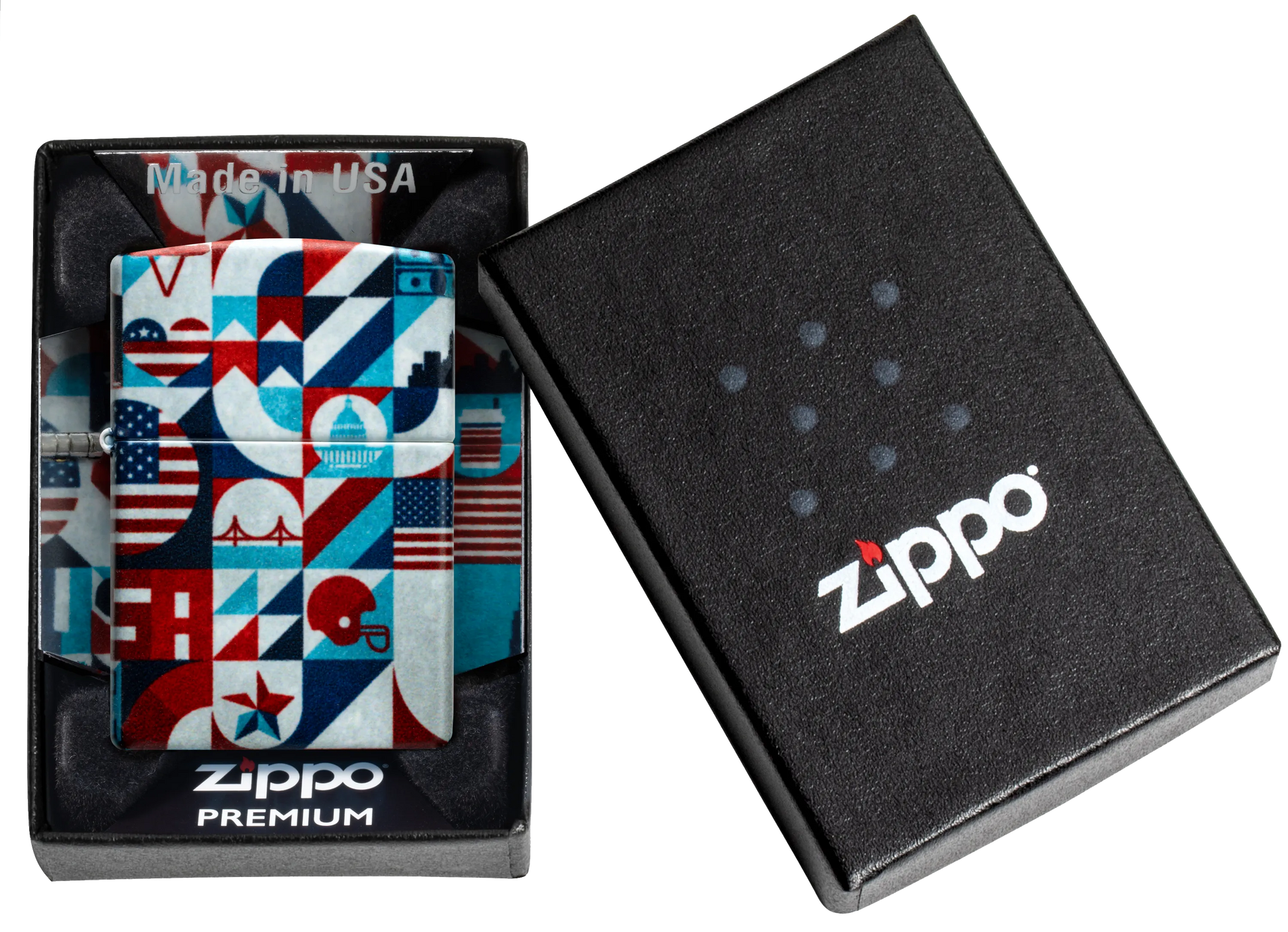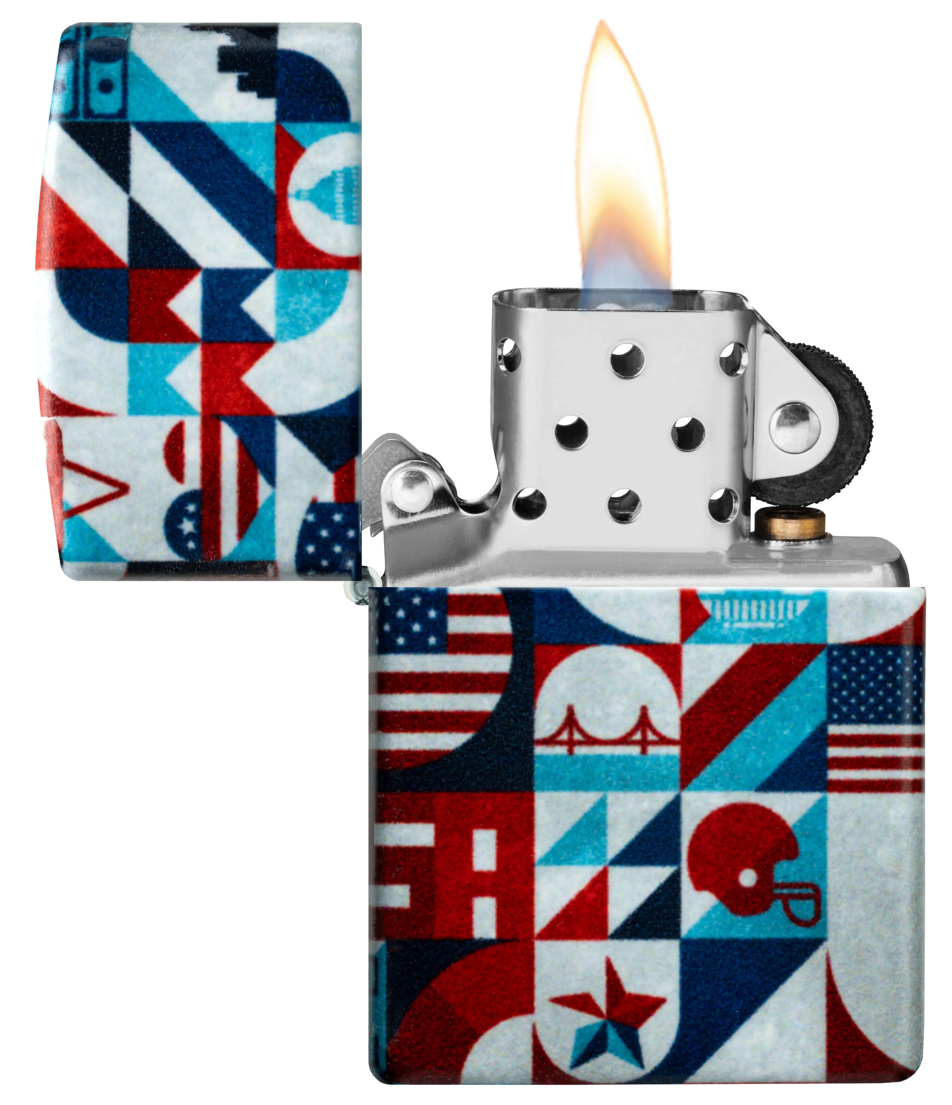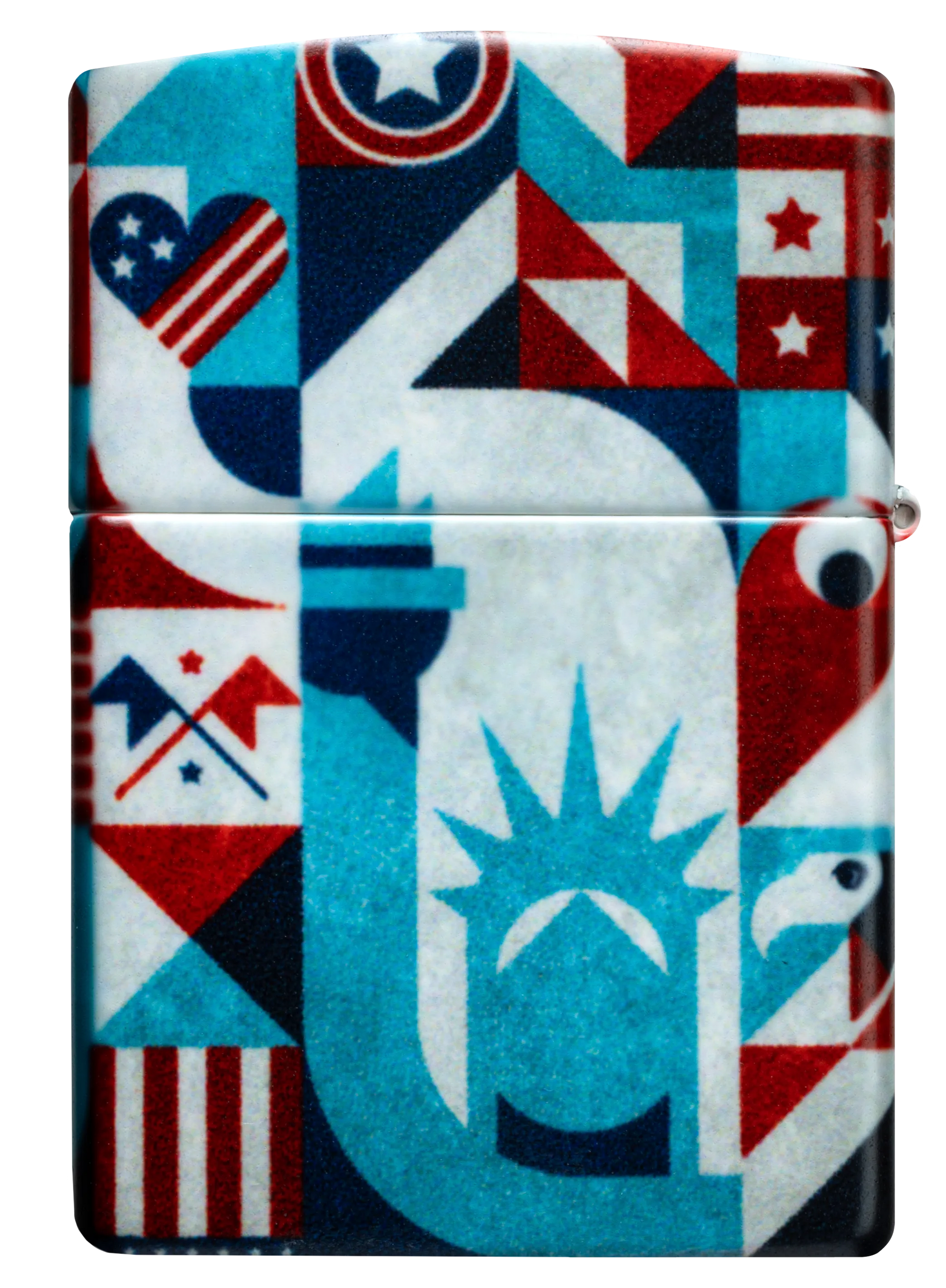 Alle Seiten dieses klassischen 540 Color-Feuerzeugs sind mit Wahrzeichen und Symbolen der USA in lebendigem, patriotischem Design bedeckt.
