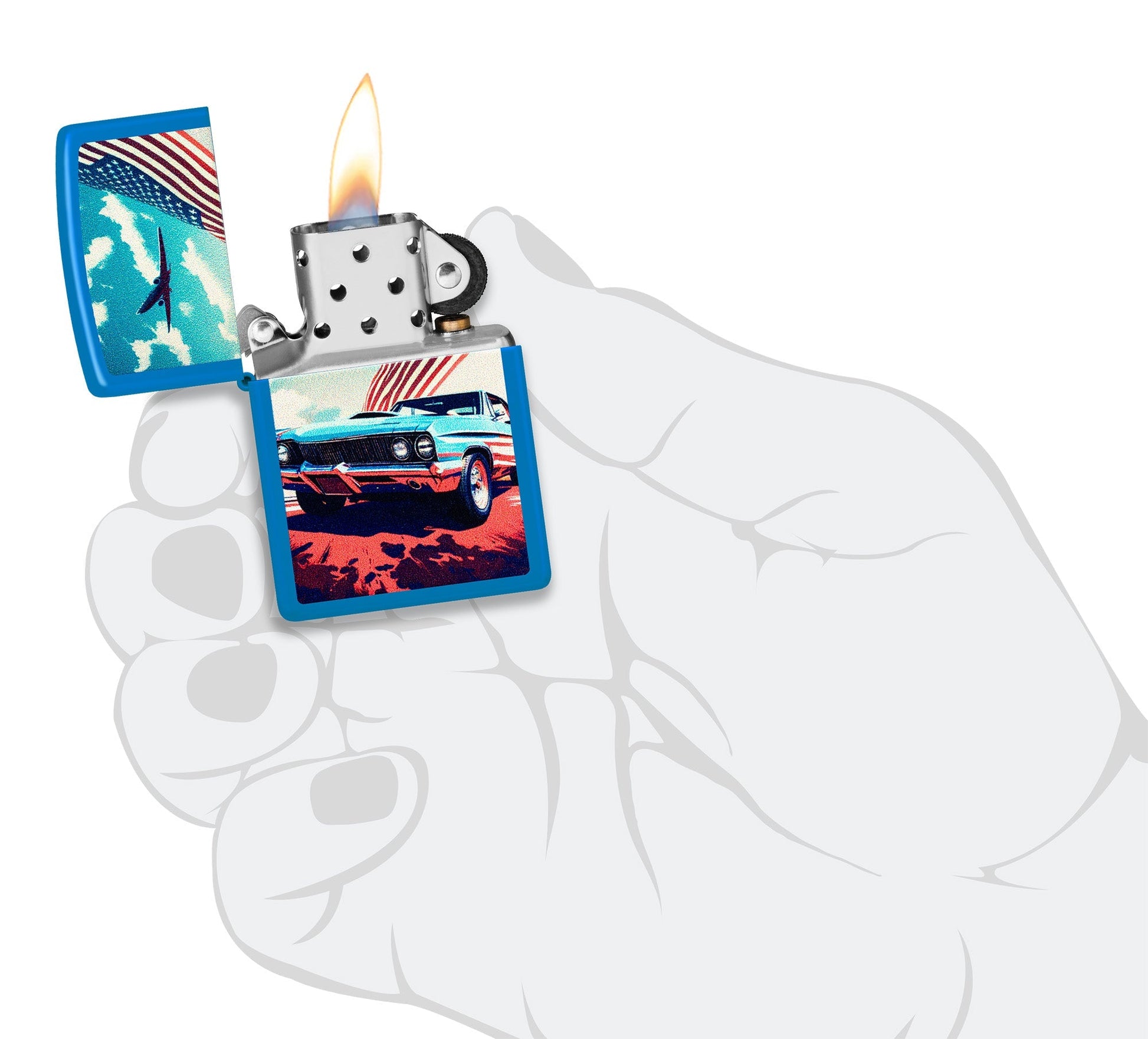 Dieses klassische Feuerzeug in mattem Himmelblau mit seinem leuchtend blauen Muscle-Car unter der amerikanischen Flagge in einem lebendigen Farbbilddesign ist bereit für deinen nächsten Roadtrip.