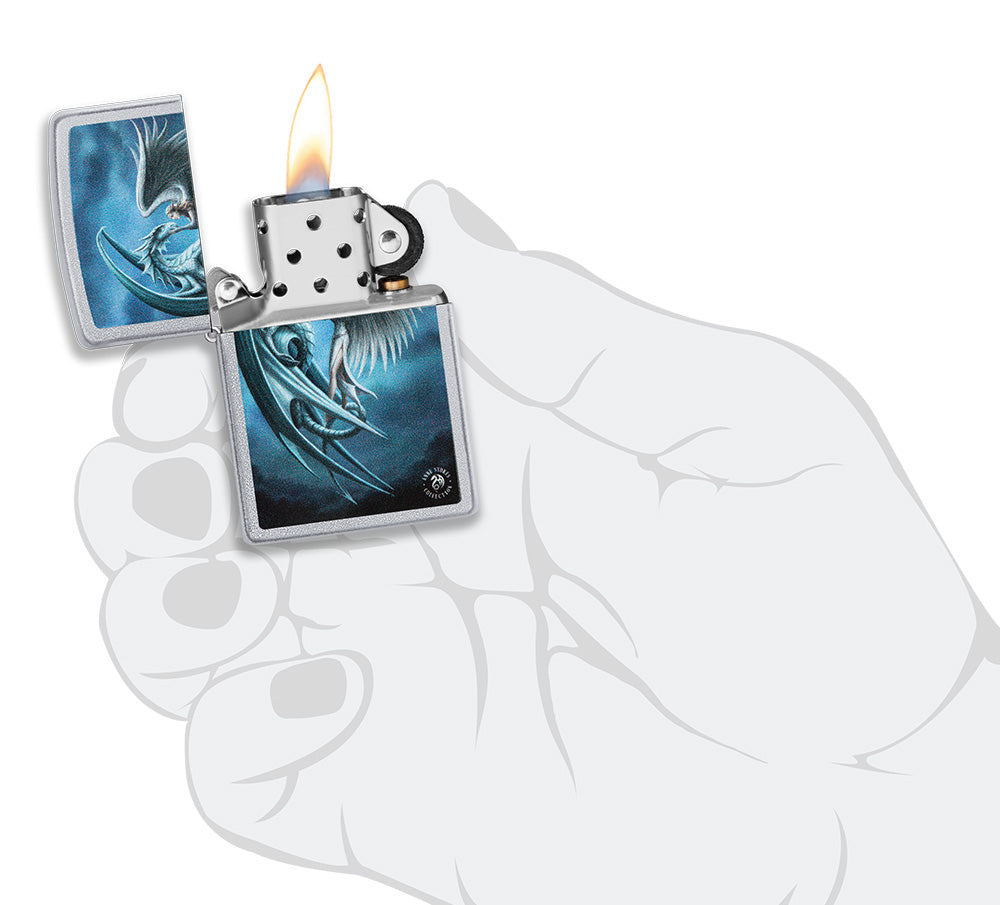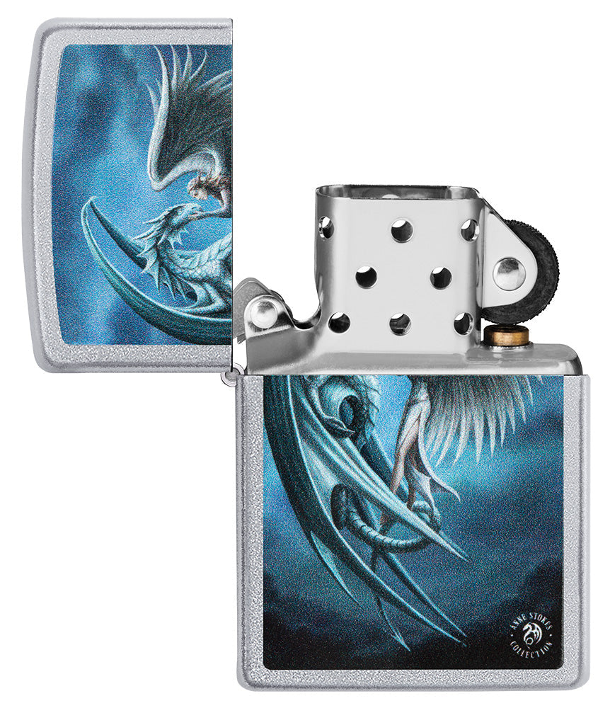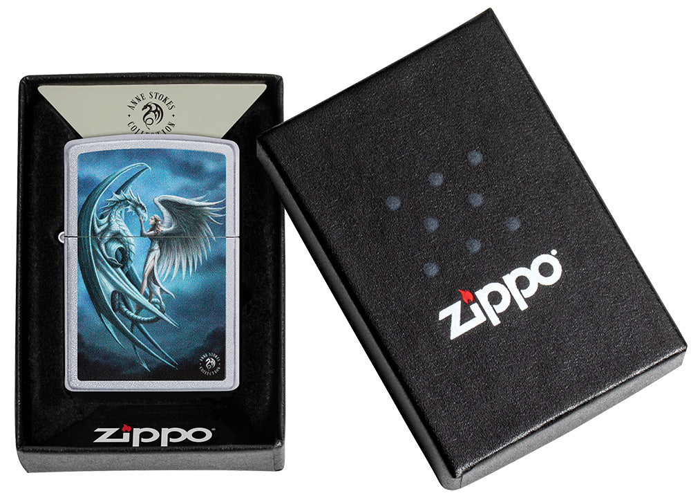 Das Zippo Feuerzeug mit Satin Chrome-Finish präsentiert ein faszinierendes Design, auf dem ein majestätischer Drache und eine Frau mit Engelsflügeln zu sehen sind. Das farbige Bild zeigt die Frau, die zärtlich das Gesicht des Drachen streichelt, während beide sich liebevoll betrachten. Die Kombination aus dem glänzenden Satin Chrome-Finish und dem lebendigen Farbbild verleiht diesem Feuerzeug eine einzigartige und ästhetisch ansprechende Optik.