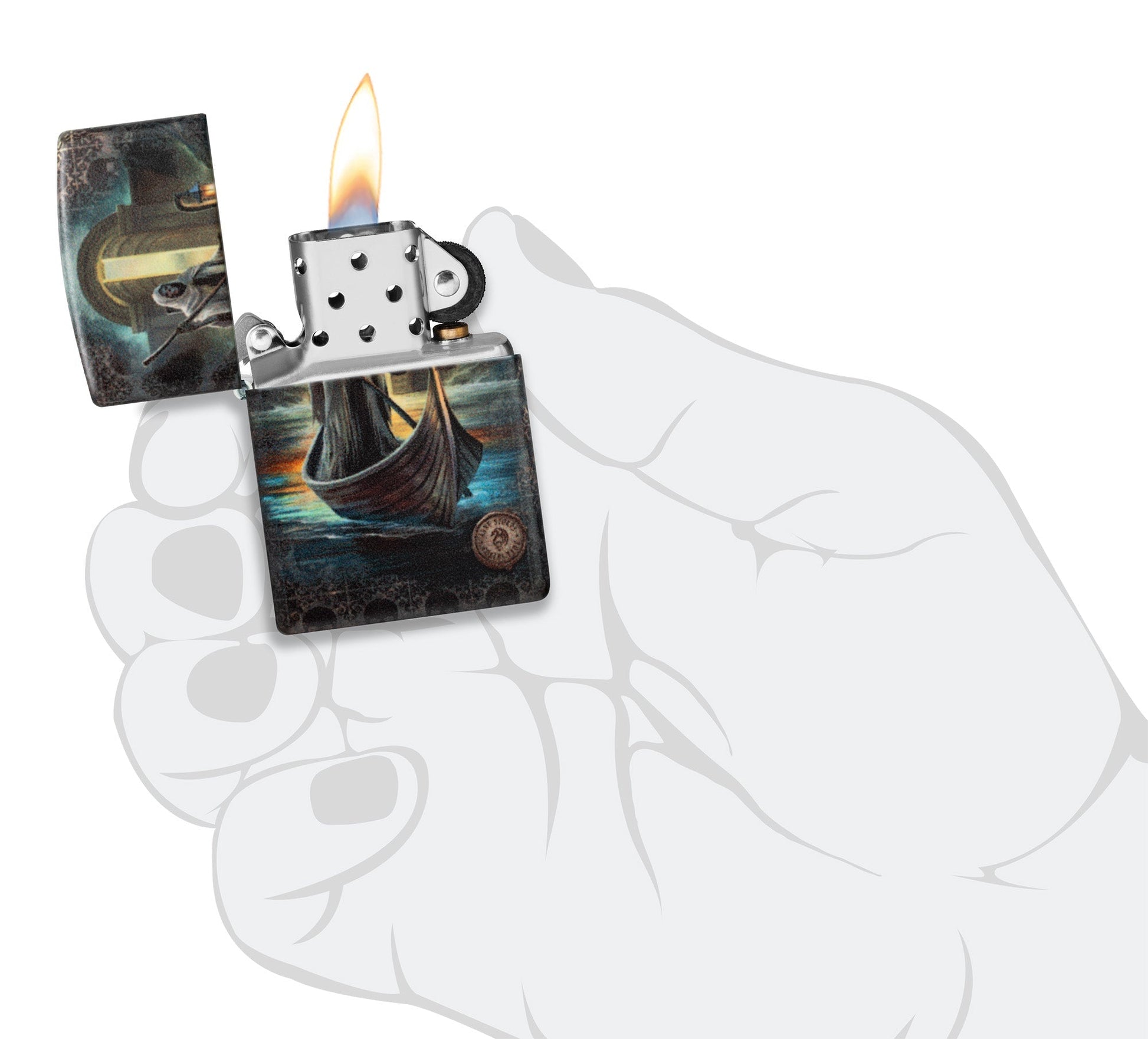 Die mystische Kunst von Anne Stokes erwacht auf diesem klassischen 540°Color Image Feuerzeug zum Leben. Von griechischen Legenden inspiriert stellt „The Ferryman“ die Figur dar, die die Seelen der kürzlich Verstorbenen transportiert. Das gespenstische Bild ist von einem subtilen Totenkopfmotiv umgeben, das auf der Rückseite des Feuerzeugs mittig eine Sanduhr als Erinnerung an die Sterblichkeit zeigt.