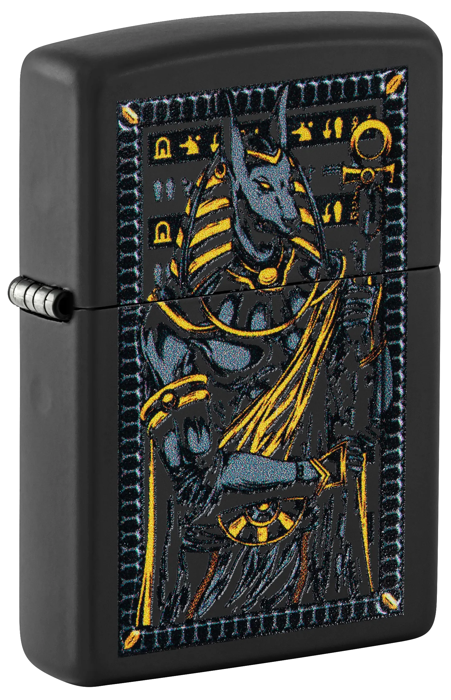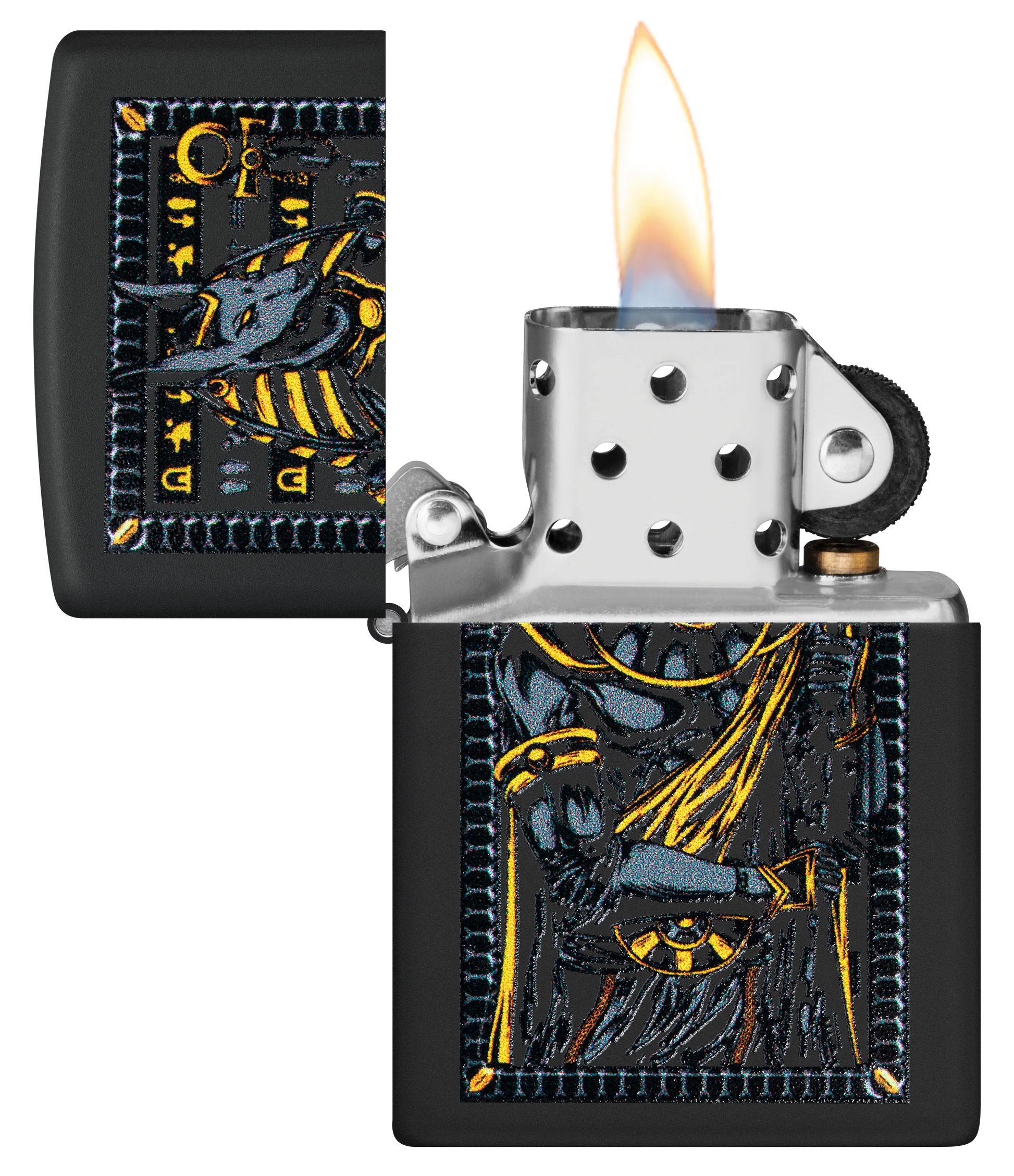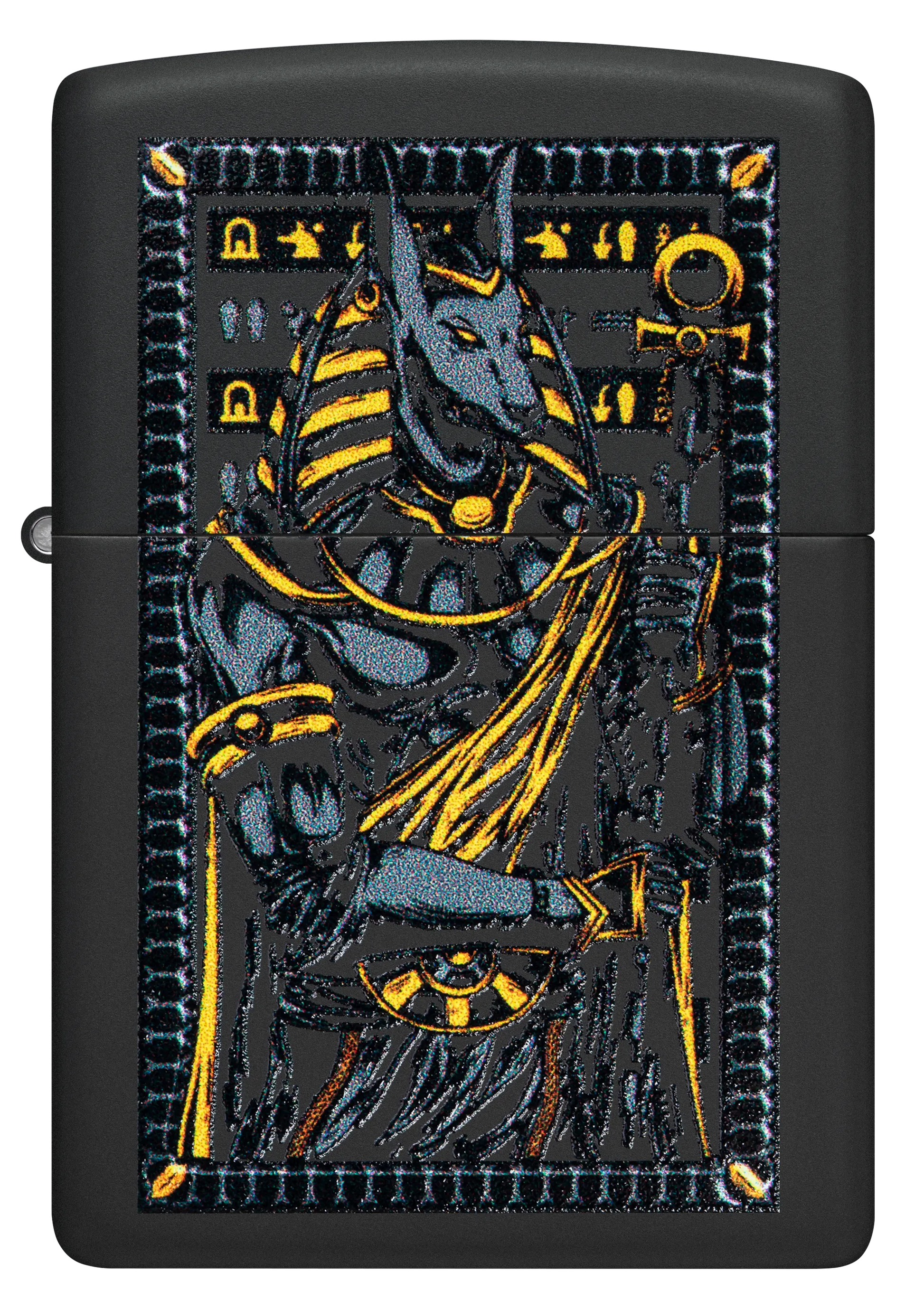 Auf diesem klassischen Feuerzeug in Black Matte erscheint der ägyptische Gott Anubis, Beschützer der Gräber und des Jenseits, in kräftigem, geheimnisvollem Color Image-Design.
