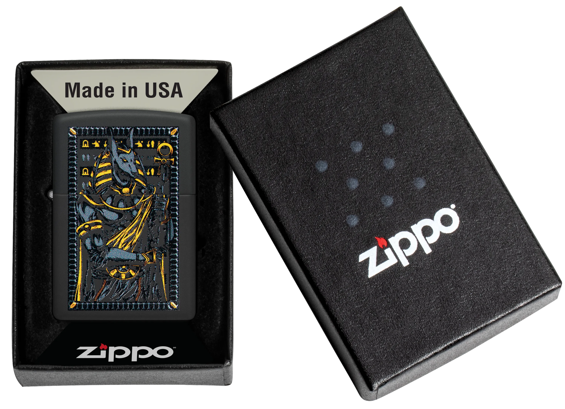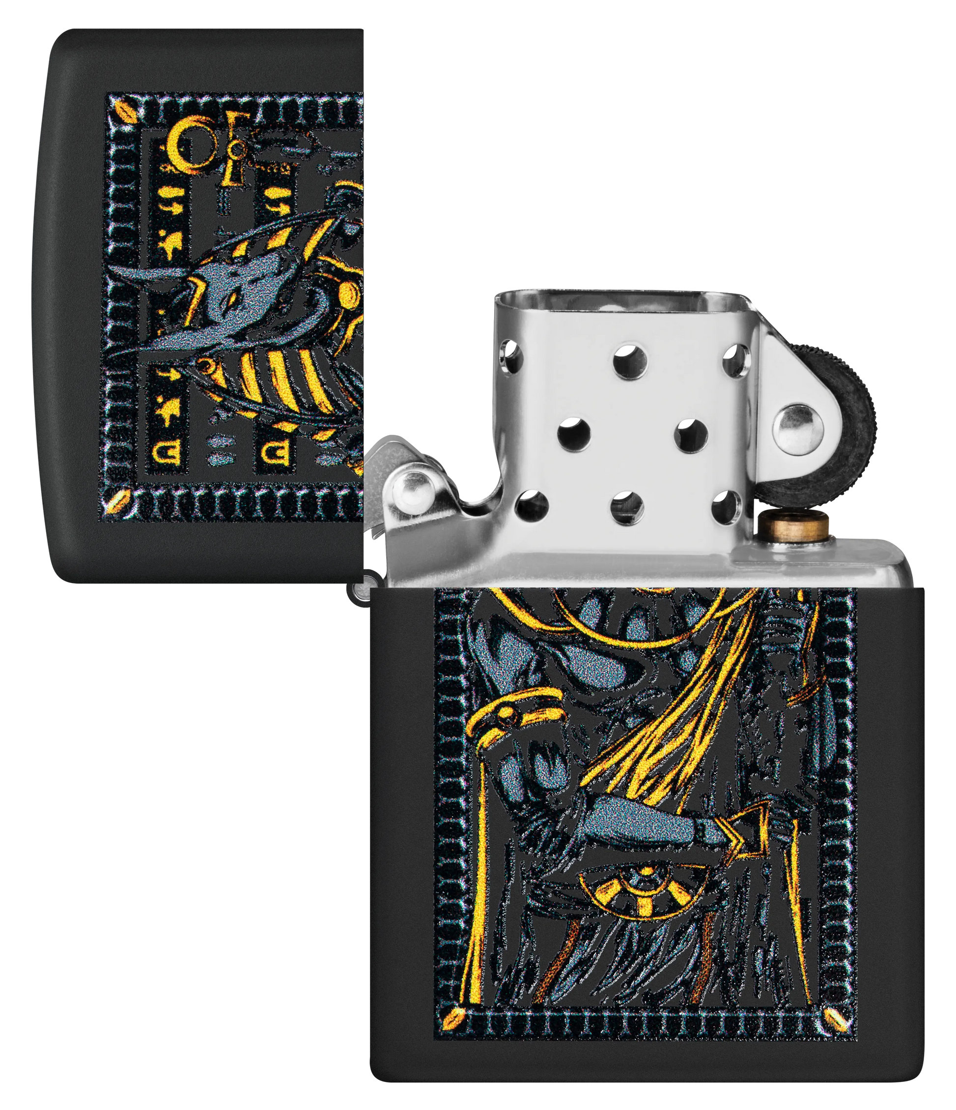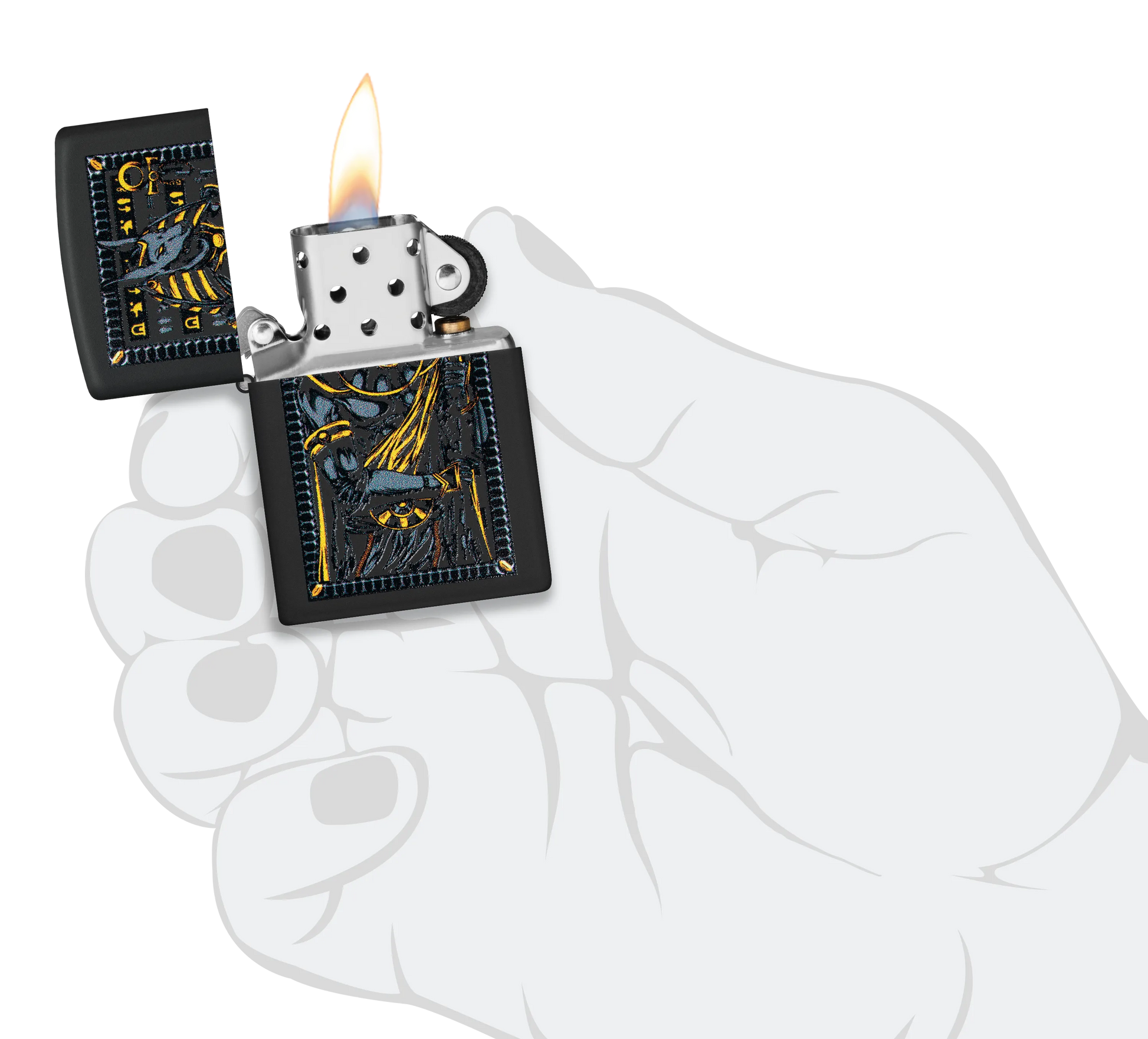 Auf diesem klassischen Feuerzeug in Black Matte erscheint der ägyptische Gott Anubis, Beschützer der Gräber und des Jenseits, in kräftigem, geheimnisvollem Color Image-Design.