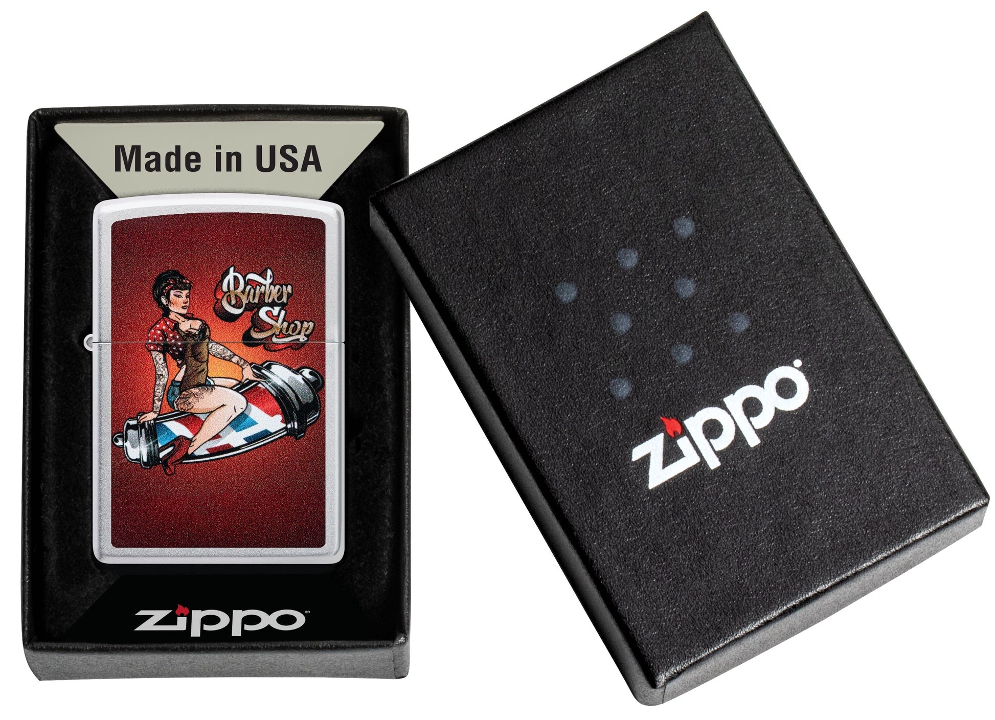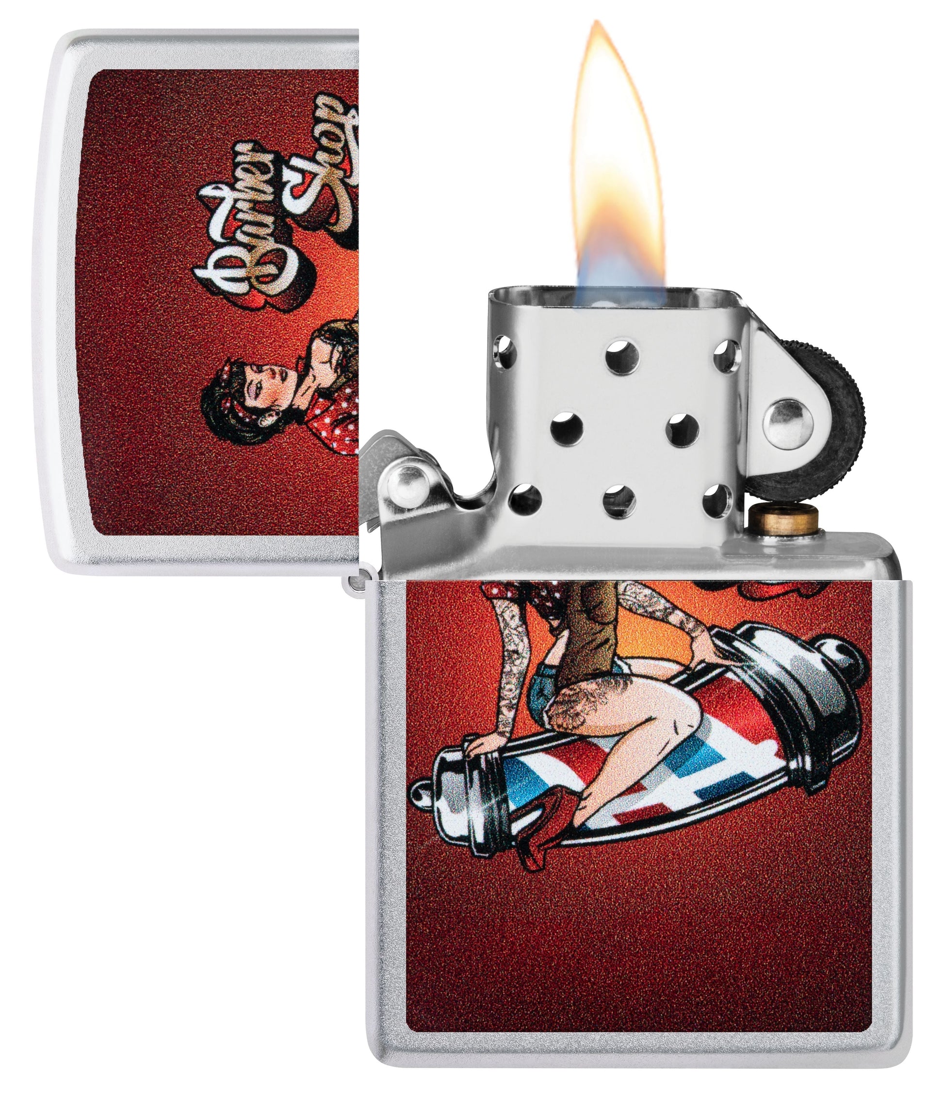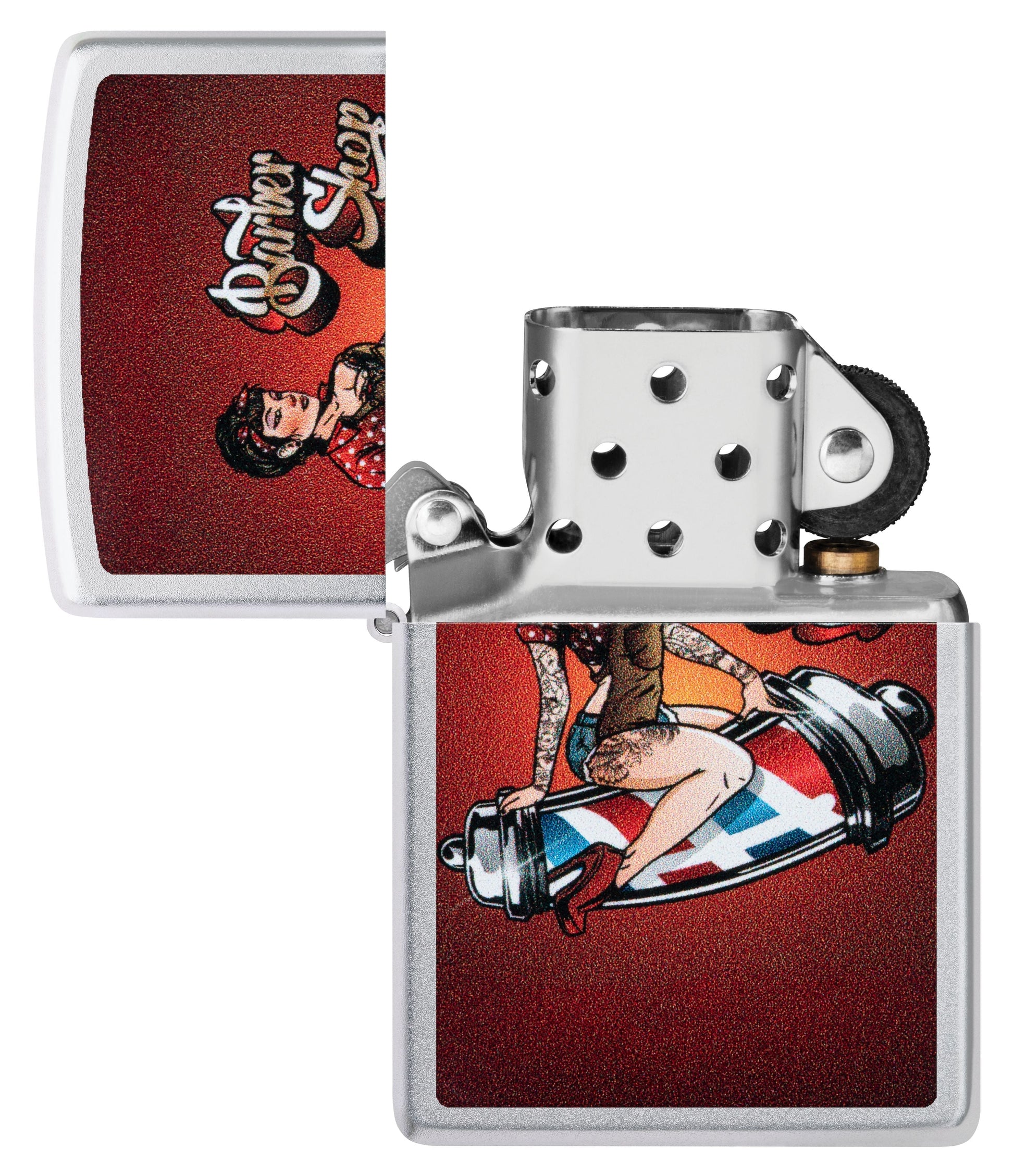 Auf diesem Satin Chrome-Feuerzeug posiert in einem Vintage-inspirierten Color Image-Design ein klassisches Pinup-Model auf einer Friseurstange.