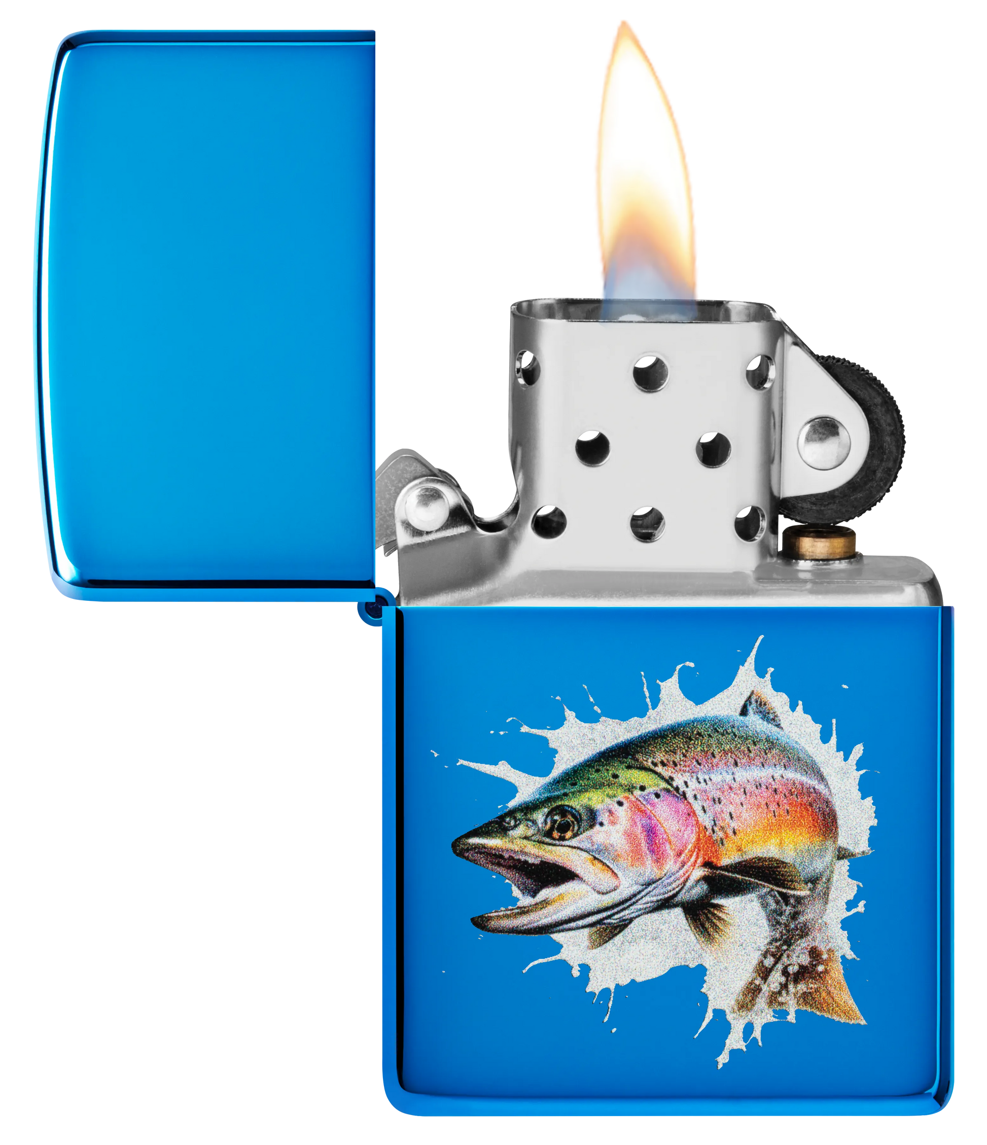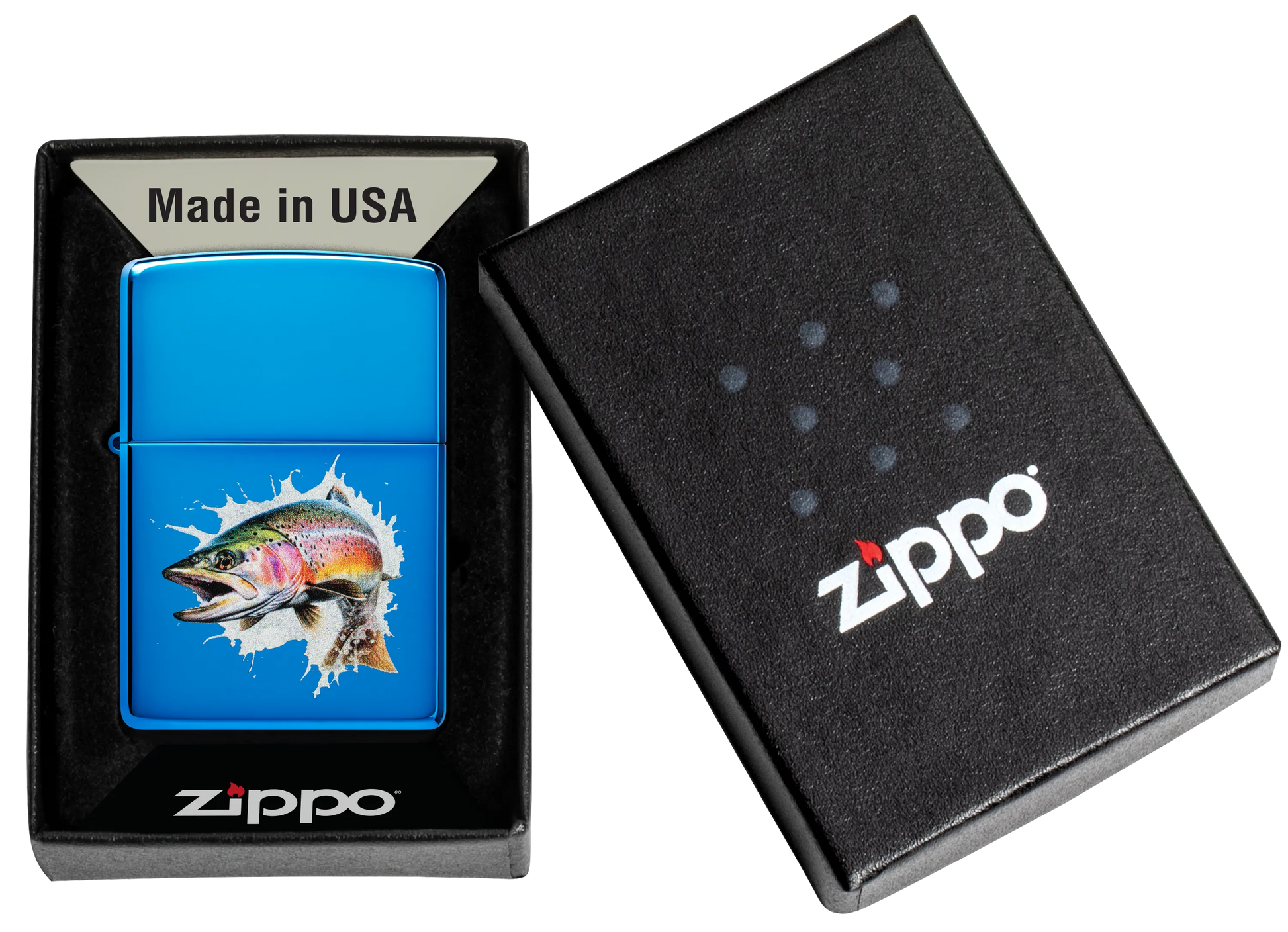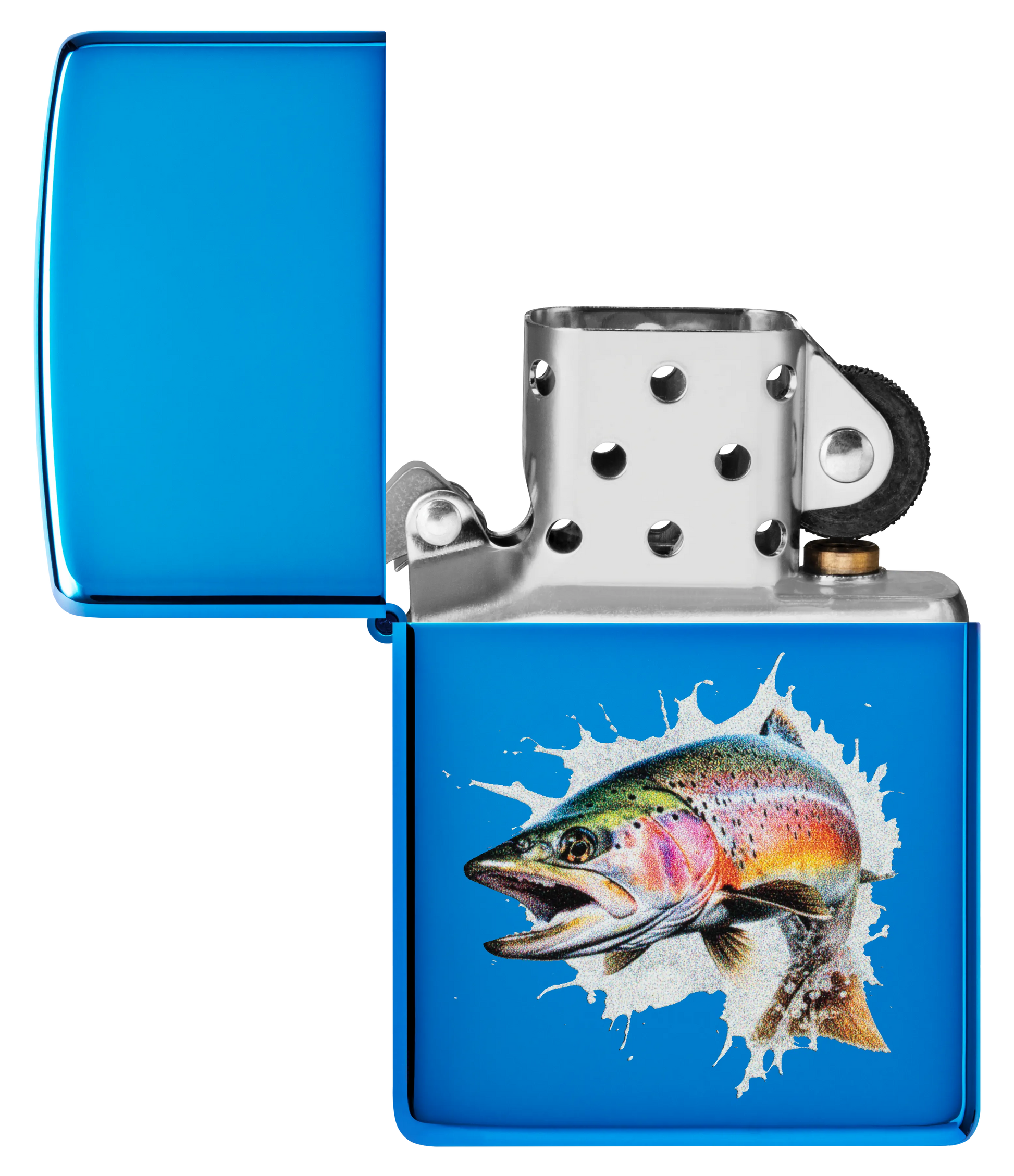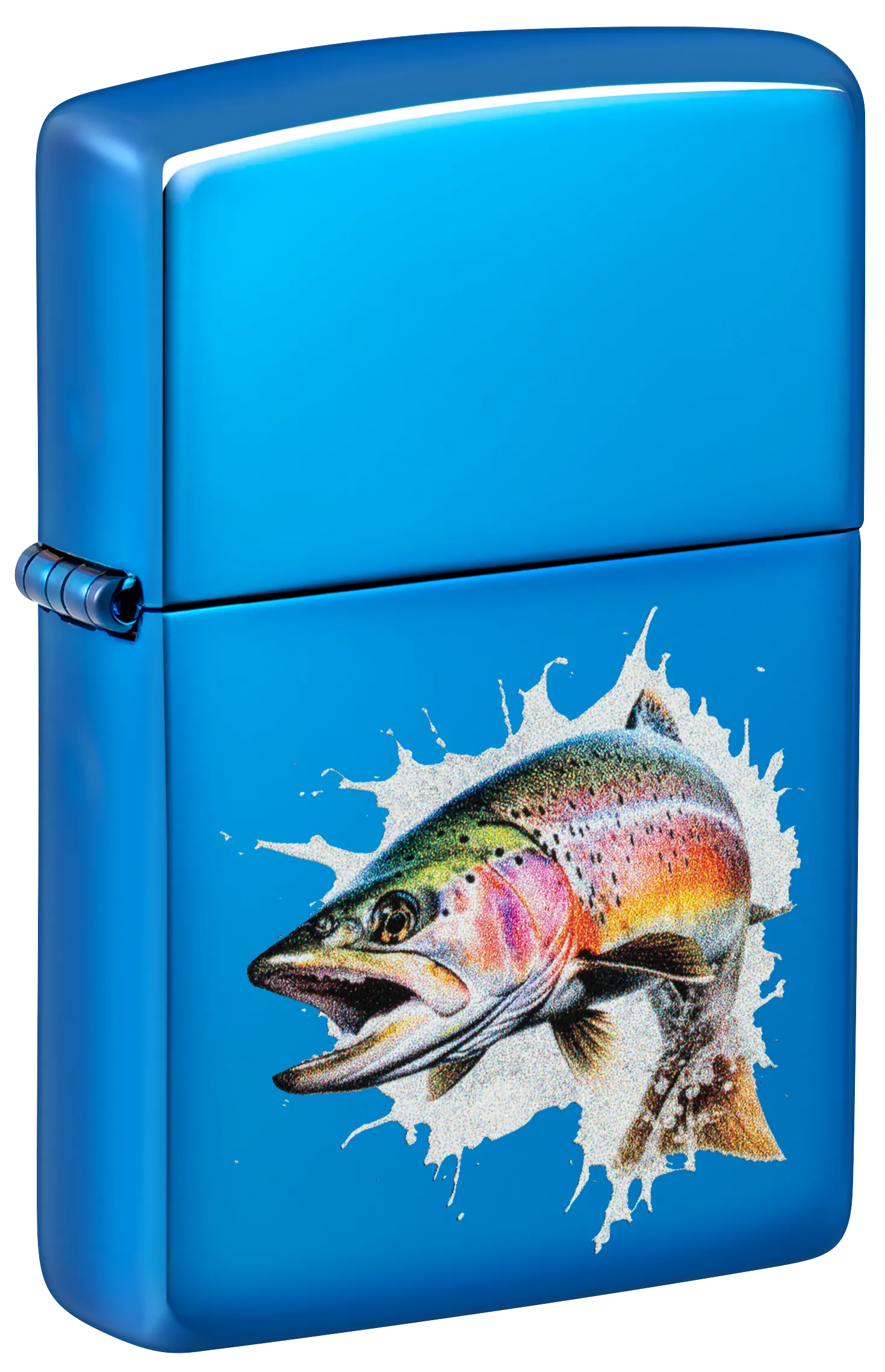 Eine leuchtende Regenbogenforelle scheint in einem lebensechten Color Image-Design aus der Oberfläche dieses klassischen Feuerzeugs in High Polish Blue herauszuspringen.