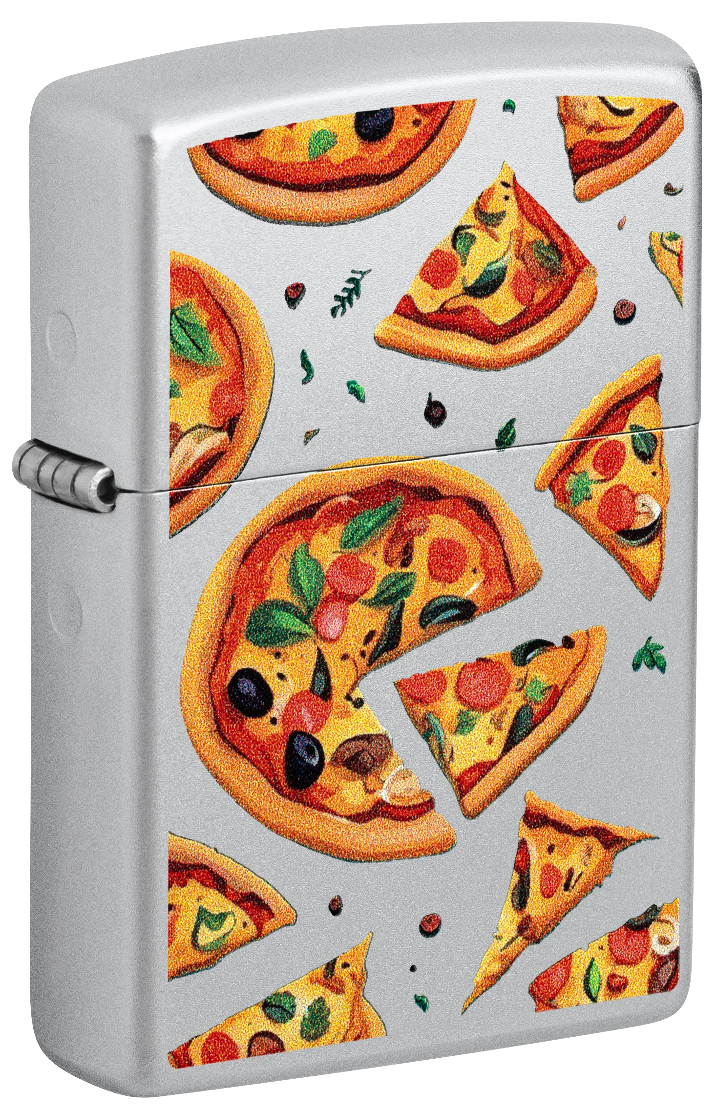Pizza ist immer gut! Köstliche Scheiben mit allen Belägen schweben in einem verlockenden Color Image-Design über die Oberfläche dieses klassischen Feuerzeugs in Satin Chrome.