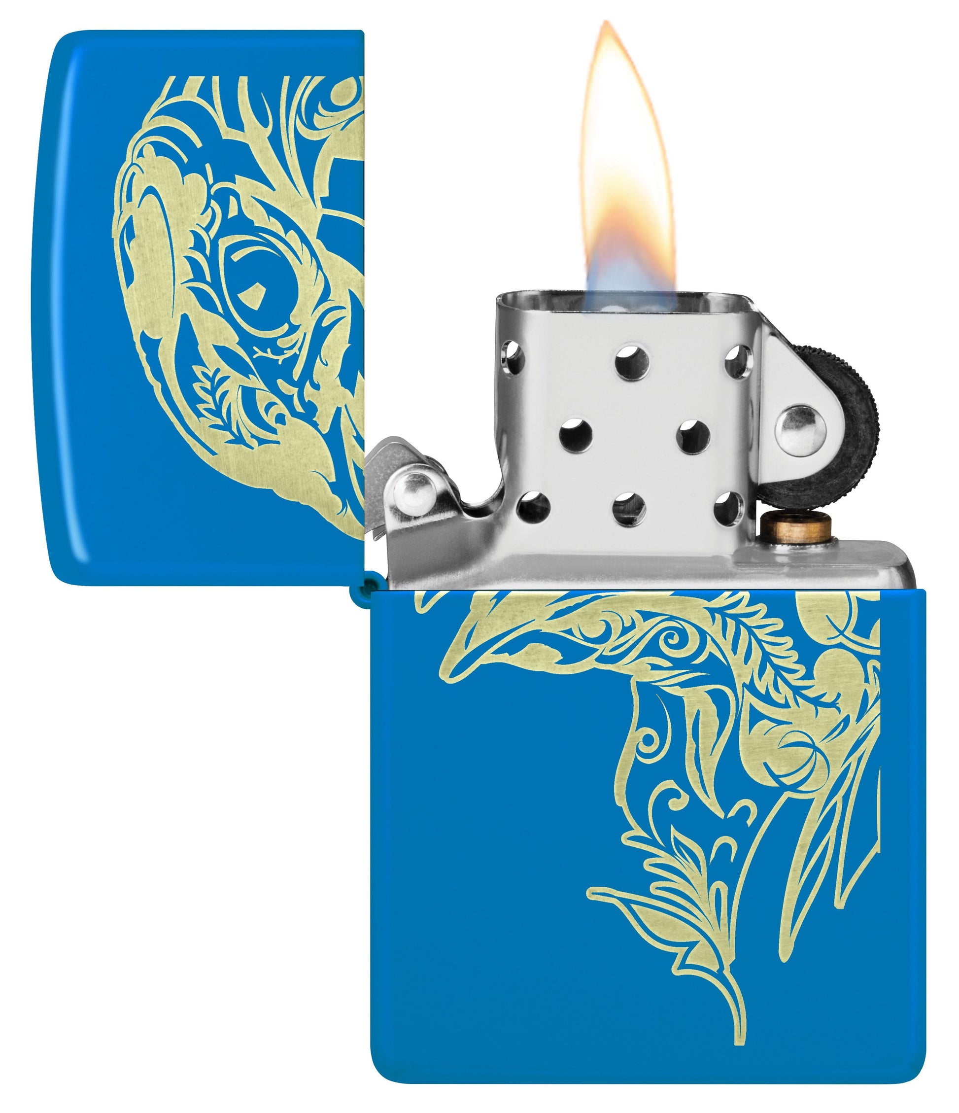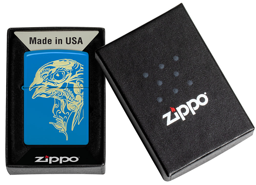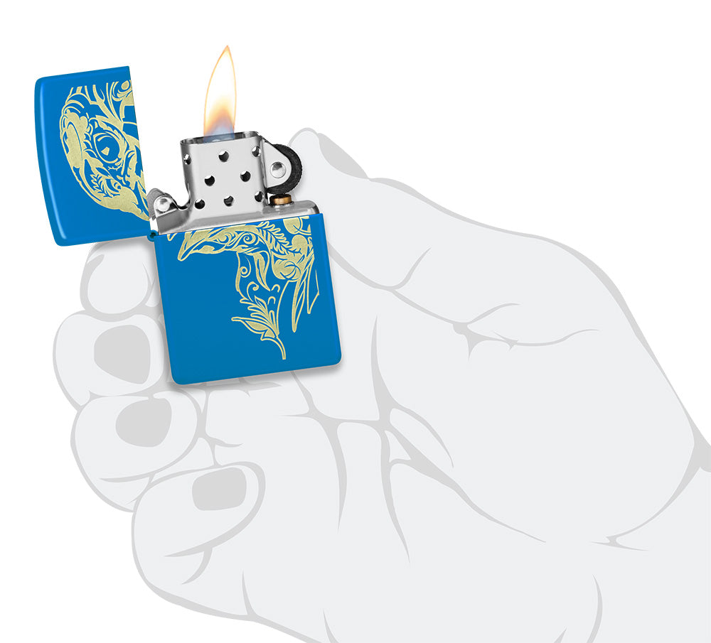 Das wunderschöne, filigrane Porträt eines Vogels ziert die Oberfläche dieses Feuerzeugs in Sky Blue Matte, das mit einem aufwendigen Laser Engrave-Design versehen ist.