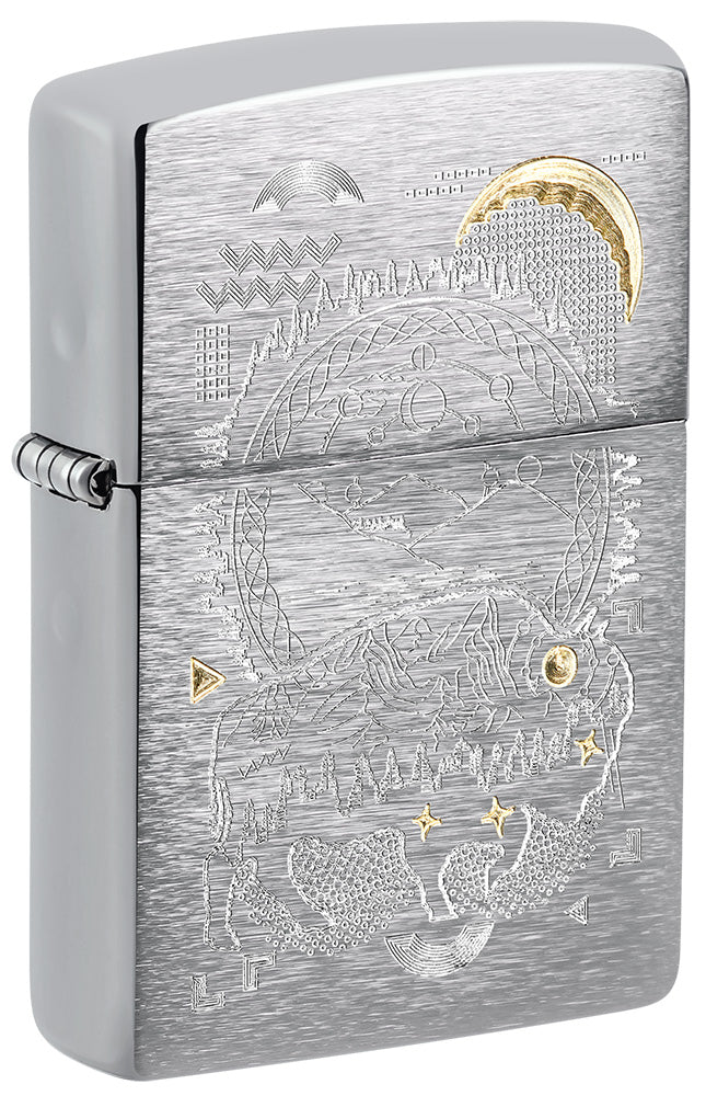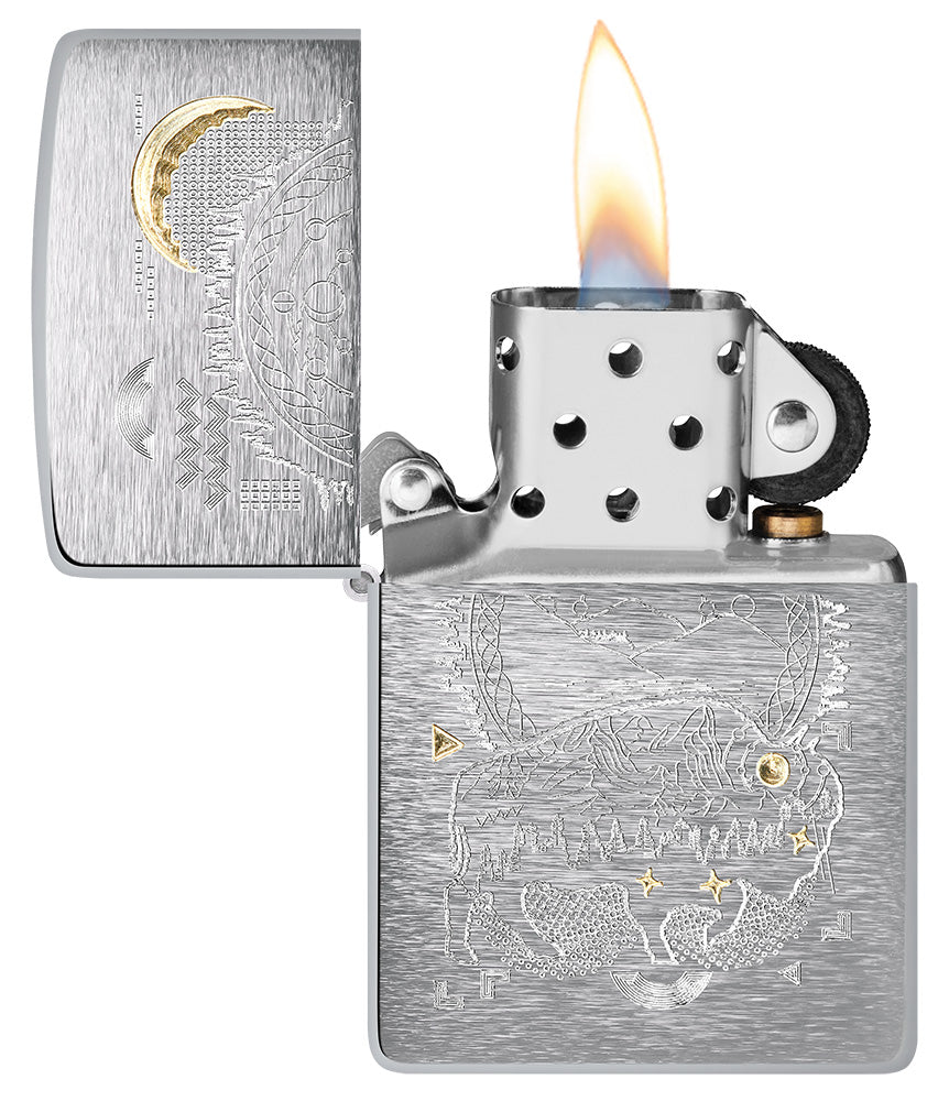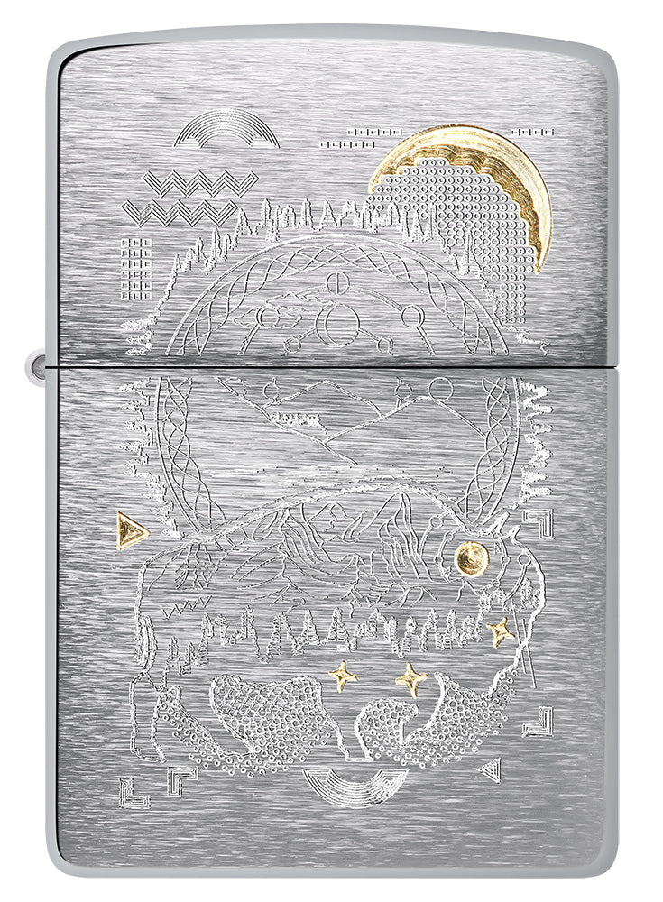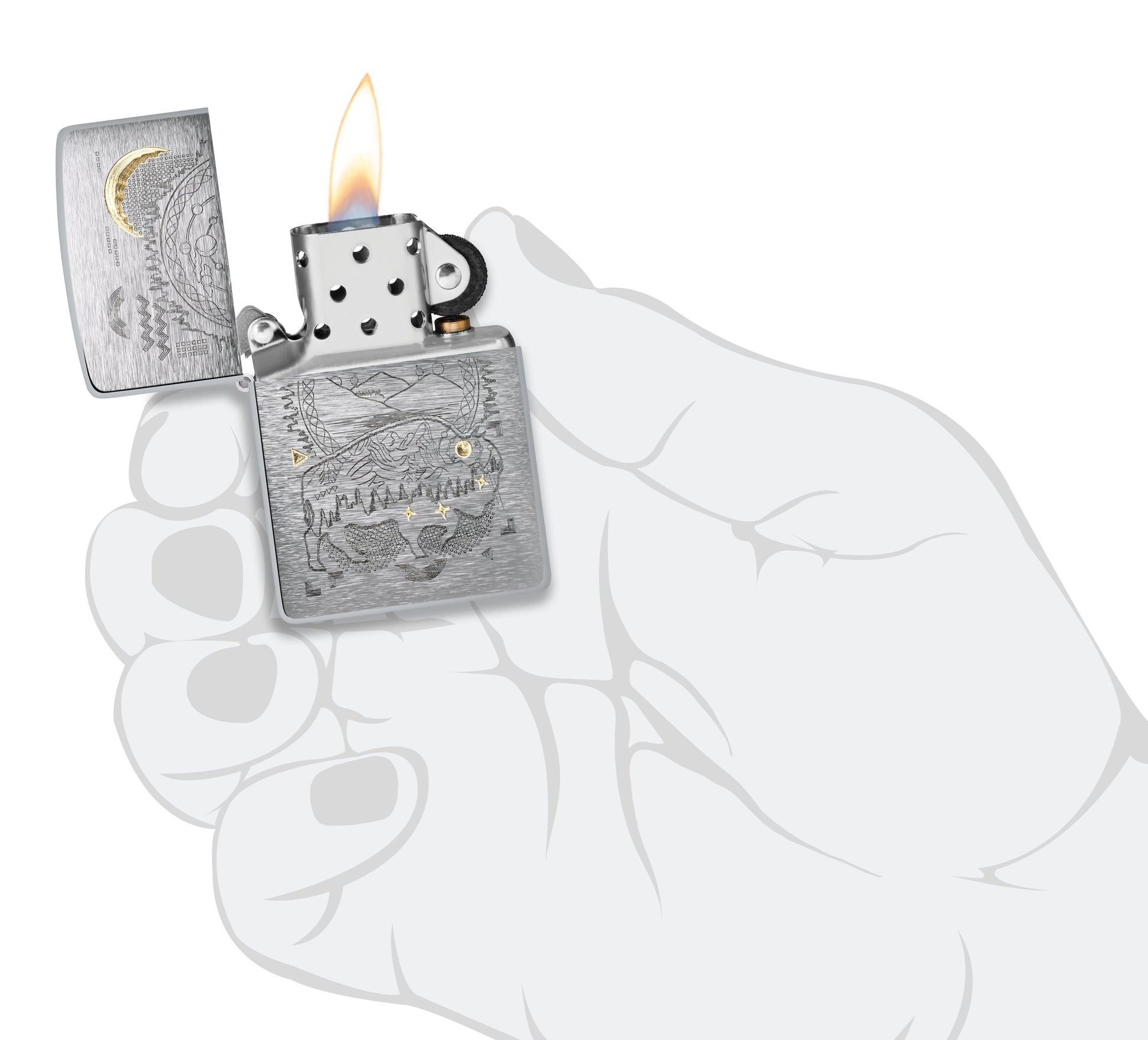 Dieses klassische Feuerzeug in Brushed Chrome ist vom Wilden Westen inspiriert und zeigt einen Bison, der unter der strahlenden Sonne die Prärie erkundet. Unser Auto Two-Tone-Verfahren fügt dem komplizierten Design leuchtende Messingakzente hinzu.