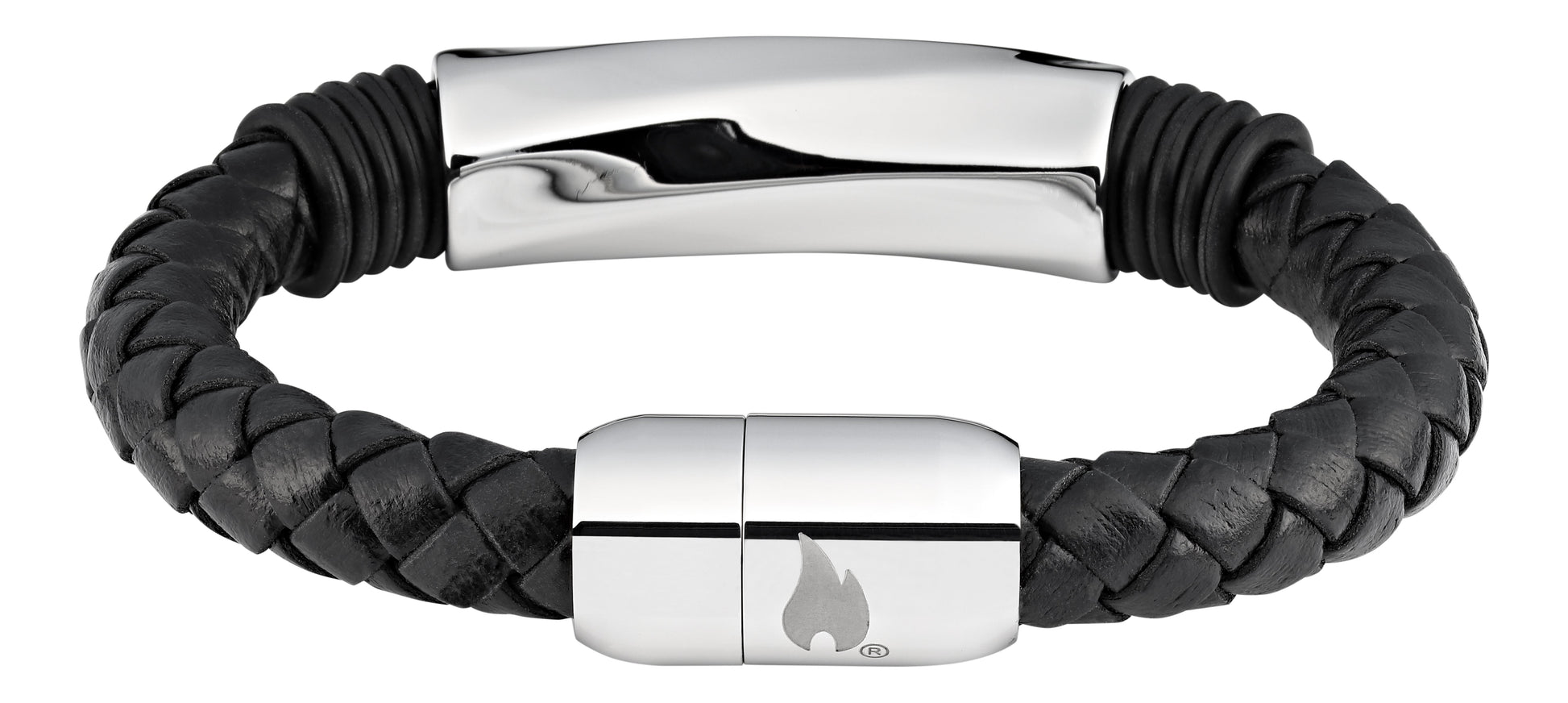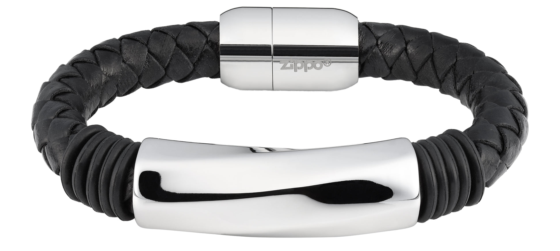 Armband aus echtem Leder, bestehend aus einem einzelnen, geflochtenen Armband aus feinem Leder, das mit einem Gehäuse aus Edelstahl verziert ist. Der flache Verschluss des Armbands verfügt über einen eingebauten Magneten. Drücken Sie einfach auf jedes Ende, um es am Handgelenk zu befestigen. Die Innenseite des Verschlusses ist mit dem originalen Zippo-Logo und die Außenseite mit der Zippo-Flamme verziert.