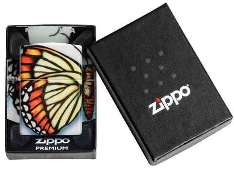 Ein wunderschöner Schmetterling, der zum ersten Flug bereit ist, breitet seine Flügel zart um alle Seiten dieses atemberaubenden 540° Feuerzeugs aus.
