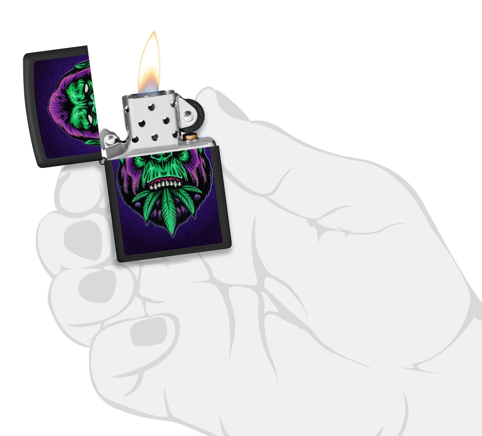 Der faszinierende Cannabis Gorilla leuchtet unter Schwarzlicht und zieht so alle Blicke auf sich. Dieses kraftvolle Bild symbolisiert Stärke, Naturverbundenheit und eine gewisse Wildheit. Mit seiner detaillierten Farbgebung und dem leuchtenden Schwarzlicht-Motiv bietet das Feuerzeug eine beeindruckende Darstellung. Die Schwarzlicht-Eigenschaft verleiht dem Motiv eine zusätzliche Dimension, während es unter UV-Licht mit einem faszinierenden Leuchten zum Leben erweckt wird. Ein wahrer Blickfang für jeden, der die einzigartige Kombination von Kunst, Natur und Technologie schätzt.