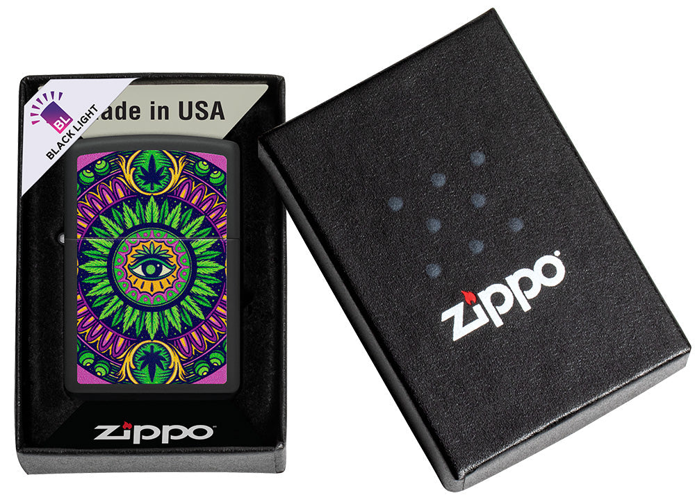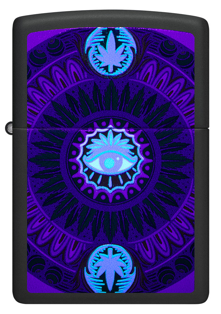 Ein allsehendes Auge wacht aus der Mitte dieses Farbbild-Mandala-Motivs. Cannabisblätter formen einen Lorbeerkranz und sind der obere und untere Anker für das Design auf dem eleganten mattschwarzen Hintergrund. Diese Modell wird abschließend mit unserem hauseigenen Schwarzlicht-Verfahren behandelt, durch das es unter ultraviolettem Licht leuchtet.