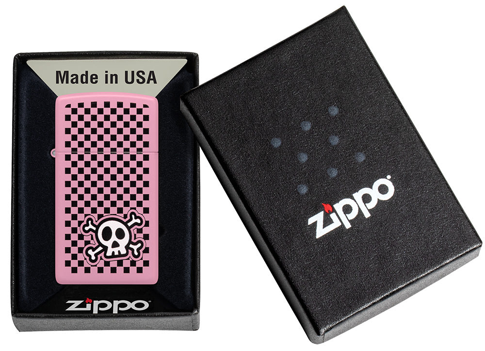 Dieses Slim® Pink Matte-Feuerzeug ist nicht ganz so niedlich, wie es auf den ersten Blick scheint. Ein von einem Tattoo inspirierter kleiner Totenkopf sitzt auf einem Schachbrettmuster in einem frischen und verspielten Color Image-Design.