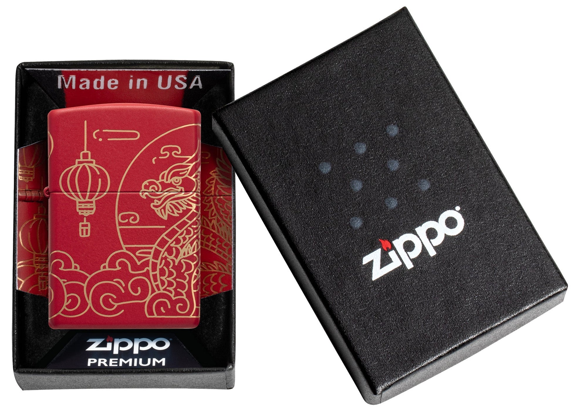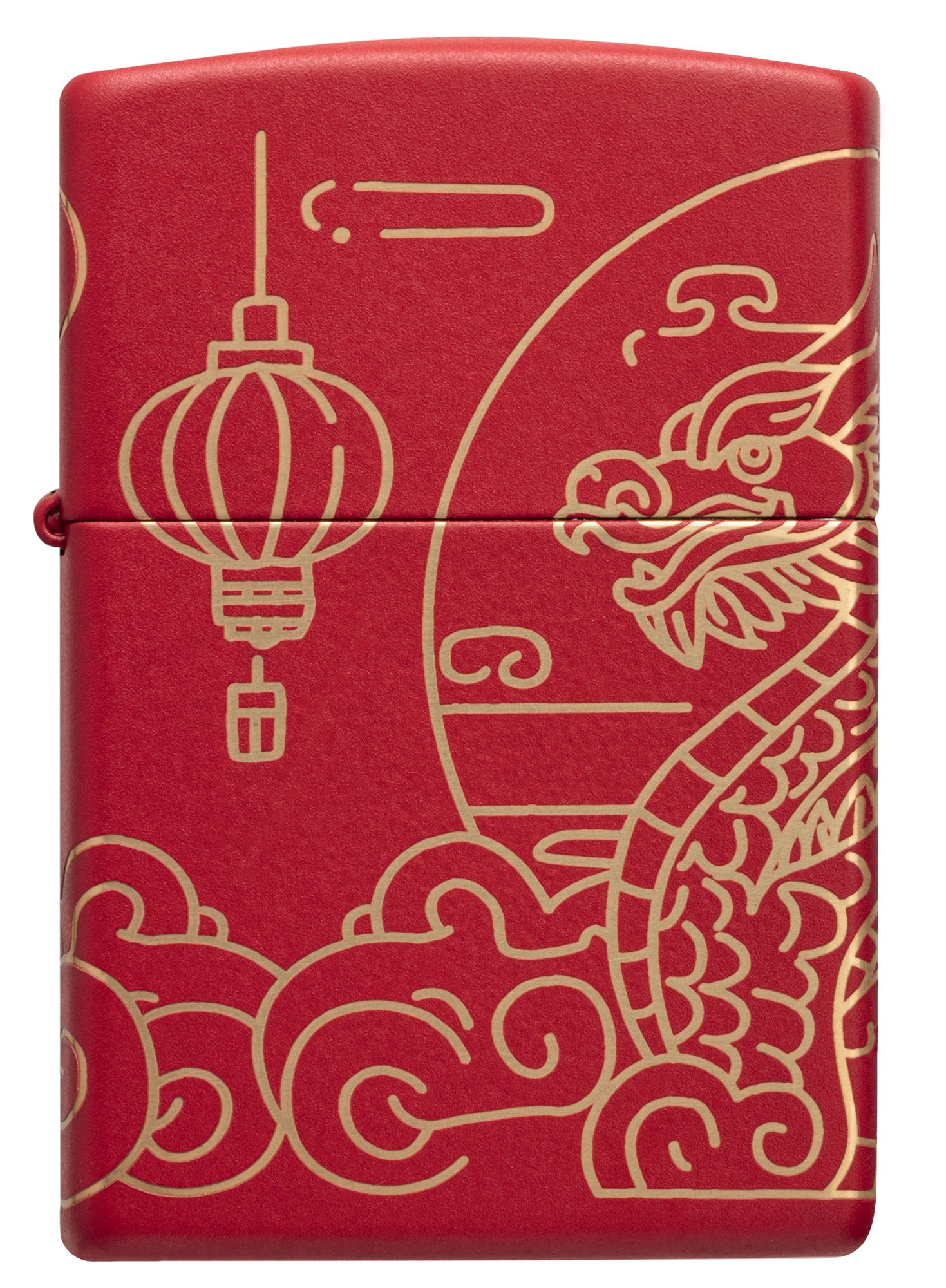 Feiere die Hoffnung und Schönheit des Chinesischen Neujahrs mit diesem klassischen Feuerzeug in mattem Rot. Ein atemberaubender Drache und Laternen ziehen sich nahtlos über das gesamte Feuerzeug in einem eleganten Laser 360°-Design.