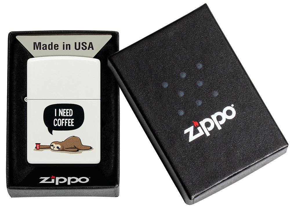 Die meisten von uns fühlen sich durch dieses verrückte Farbbild-Motiv angesprochen! Ein müdes Faultier schleppt sich auf der Suche nach einer Tasse Kaffee über dieses mattweiße Feuerzeug.