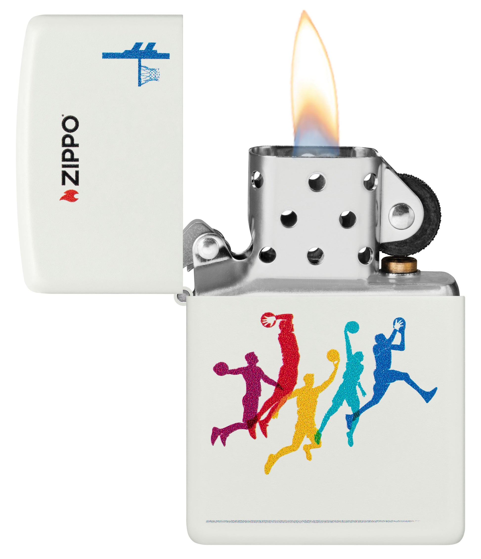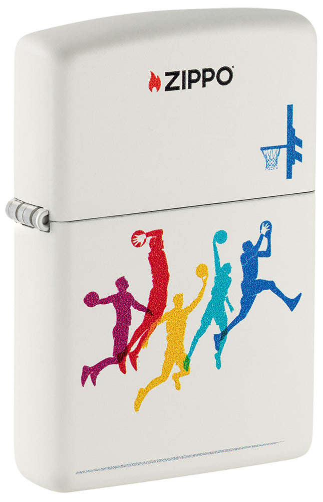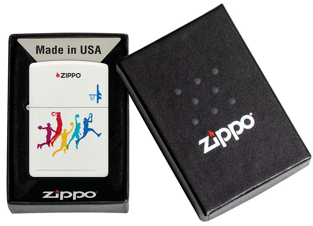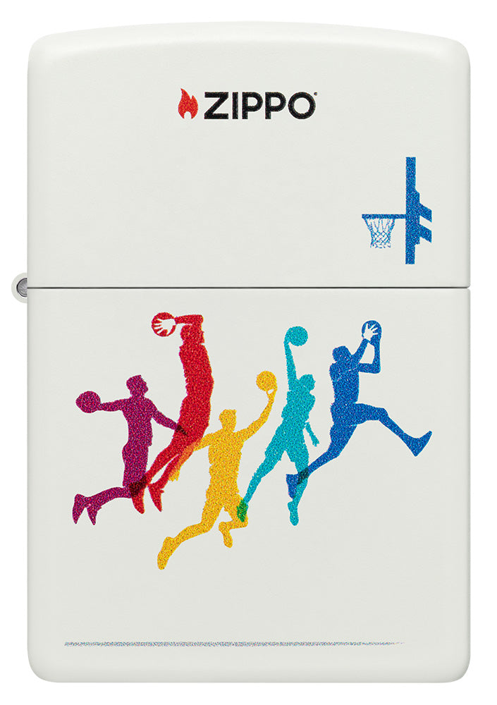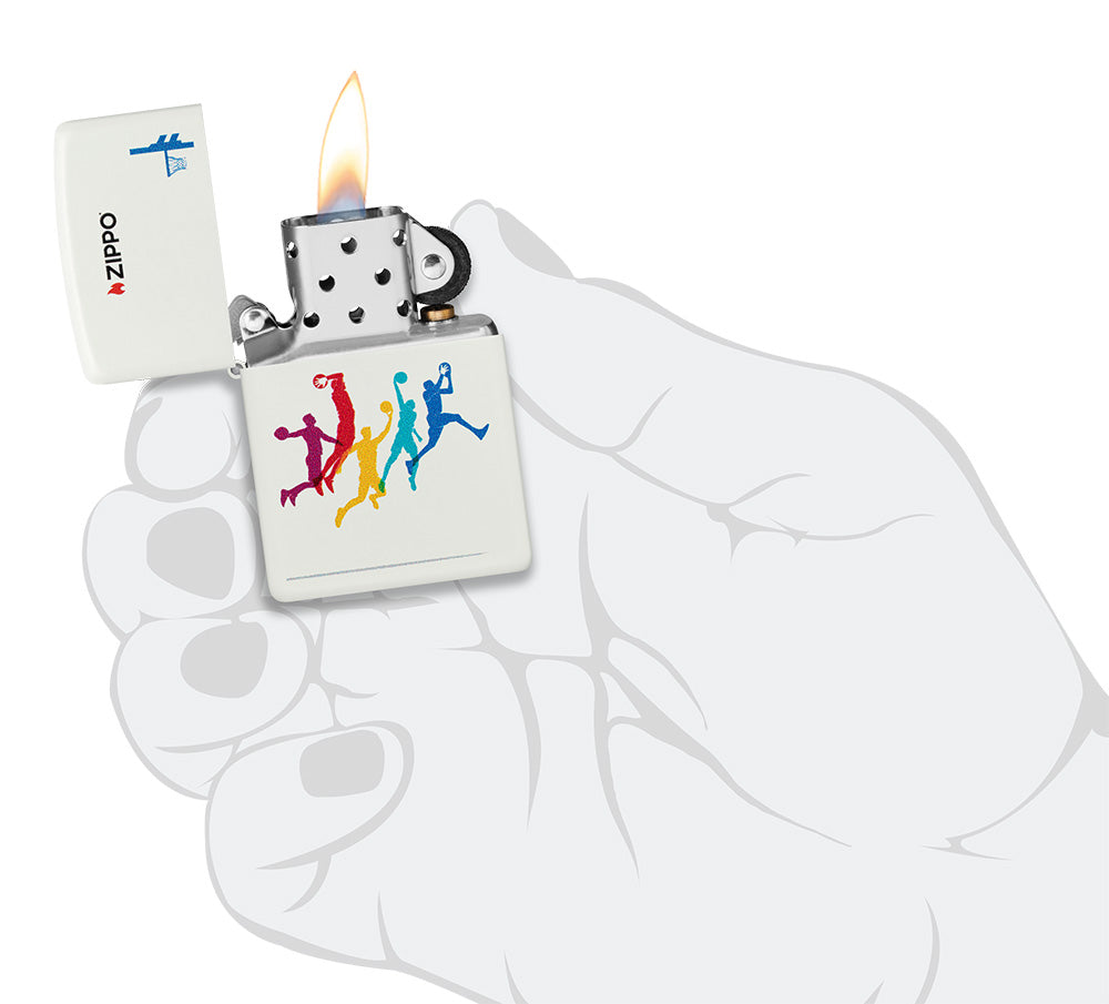 Erleben Sie die Intensität des großen Spiels mit diesem Feuerzeug in White Matte. Unter dem Zippo Logo werfen und punkten Basketballspieler im aufregenden Color Image-Design.