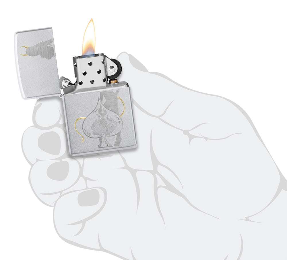 Auf diesem verspielten Feuerzeug in Satin Chrome lockt eine teuflische Figur hinter einem Pik-Ass. Das verschlungene Design und die edlen Messingtöne entstehen durch unser Auto Two-Tone-Verfahren.