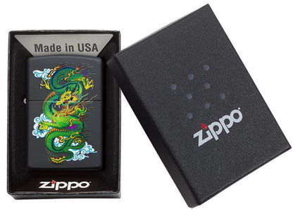 Ein asiatisch inspiriertes Drachendesign gleitet über dieses Black Matte Feuerzeug. Das Design wird im Color Image Verfahren erstellt.