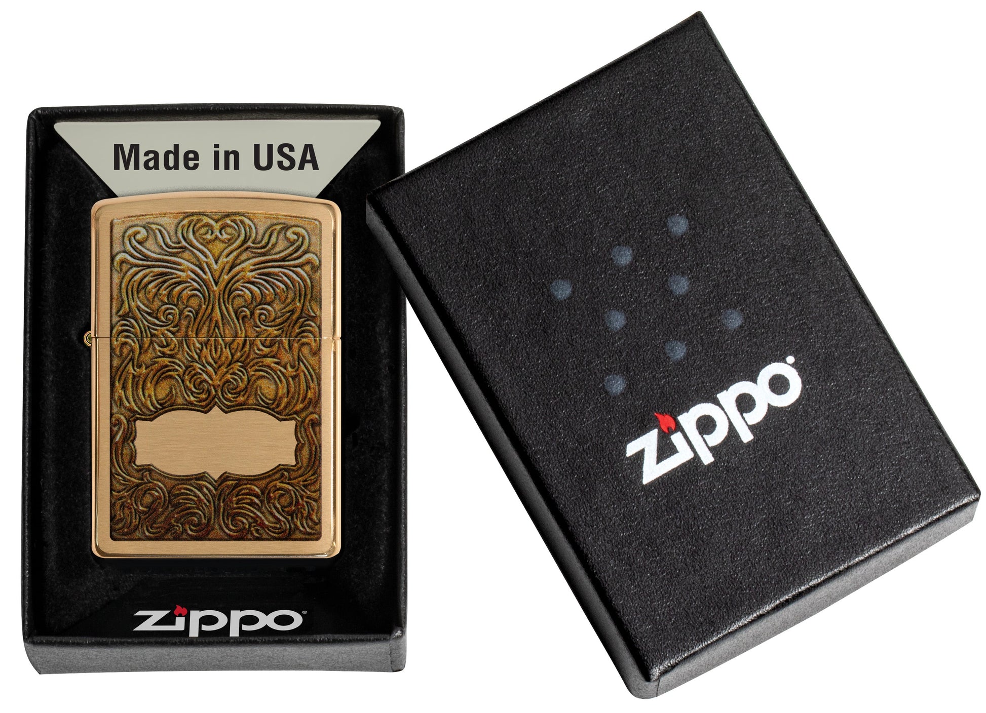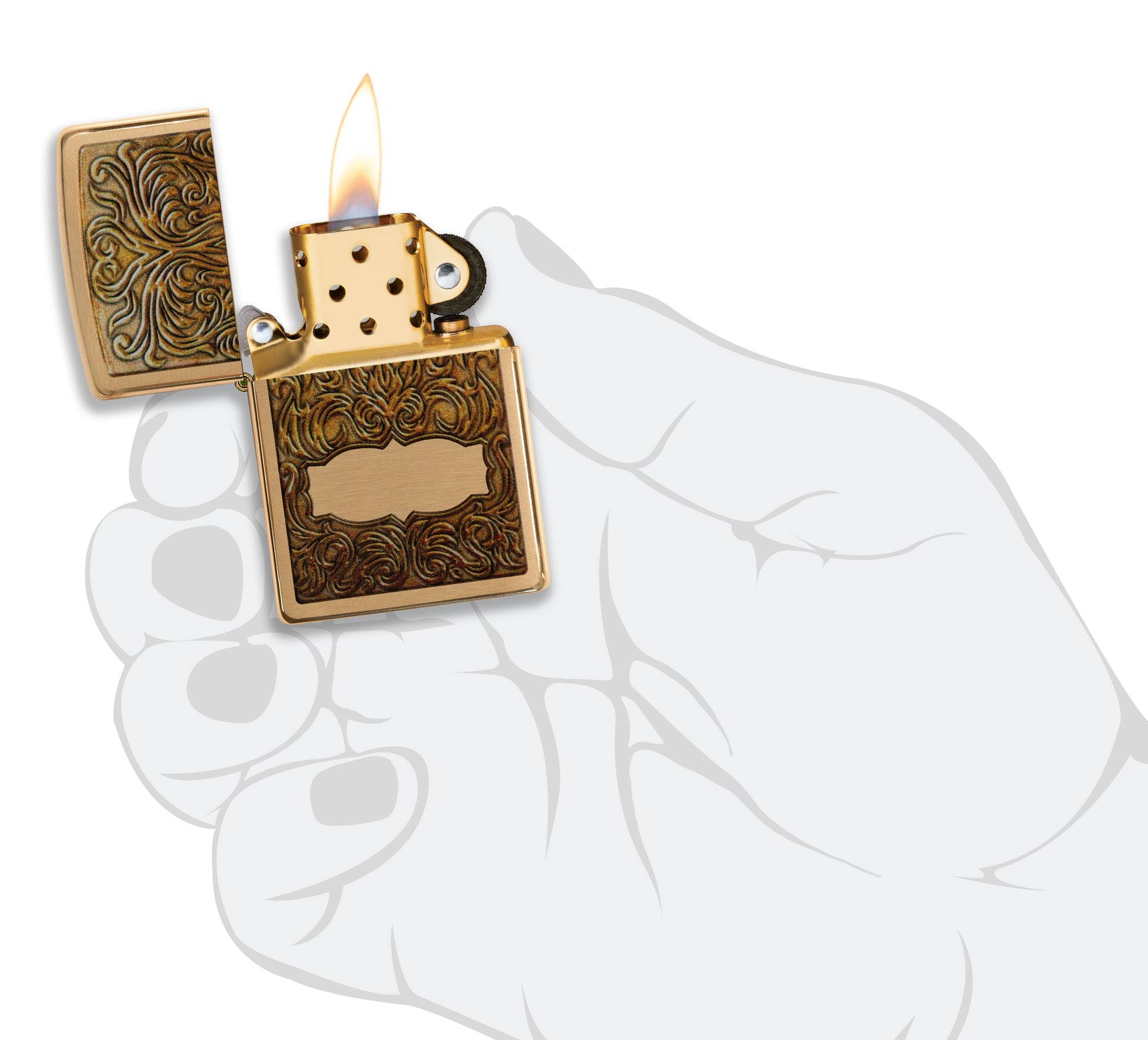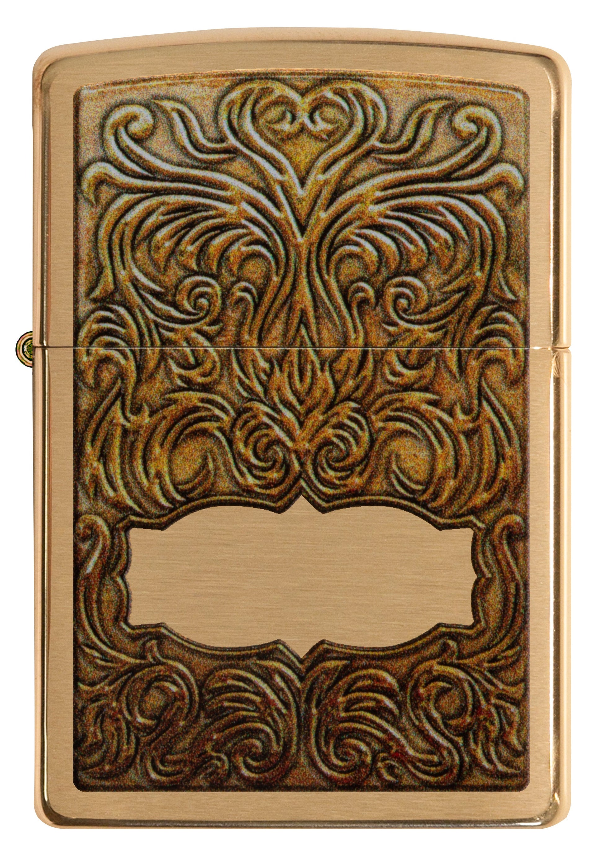 Dieses Feuerzeug aus gebürstetem Messing verfügt über ein elegantes Color Image Design mit einem leeren Feld, das für einen Namen oder Initialen verwendet werden kann.