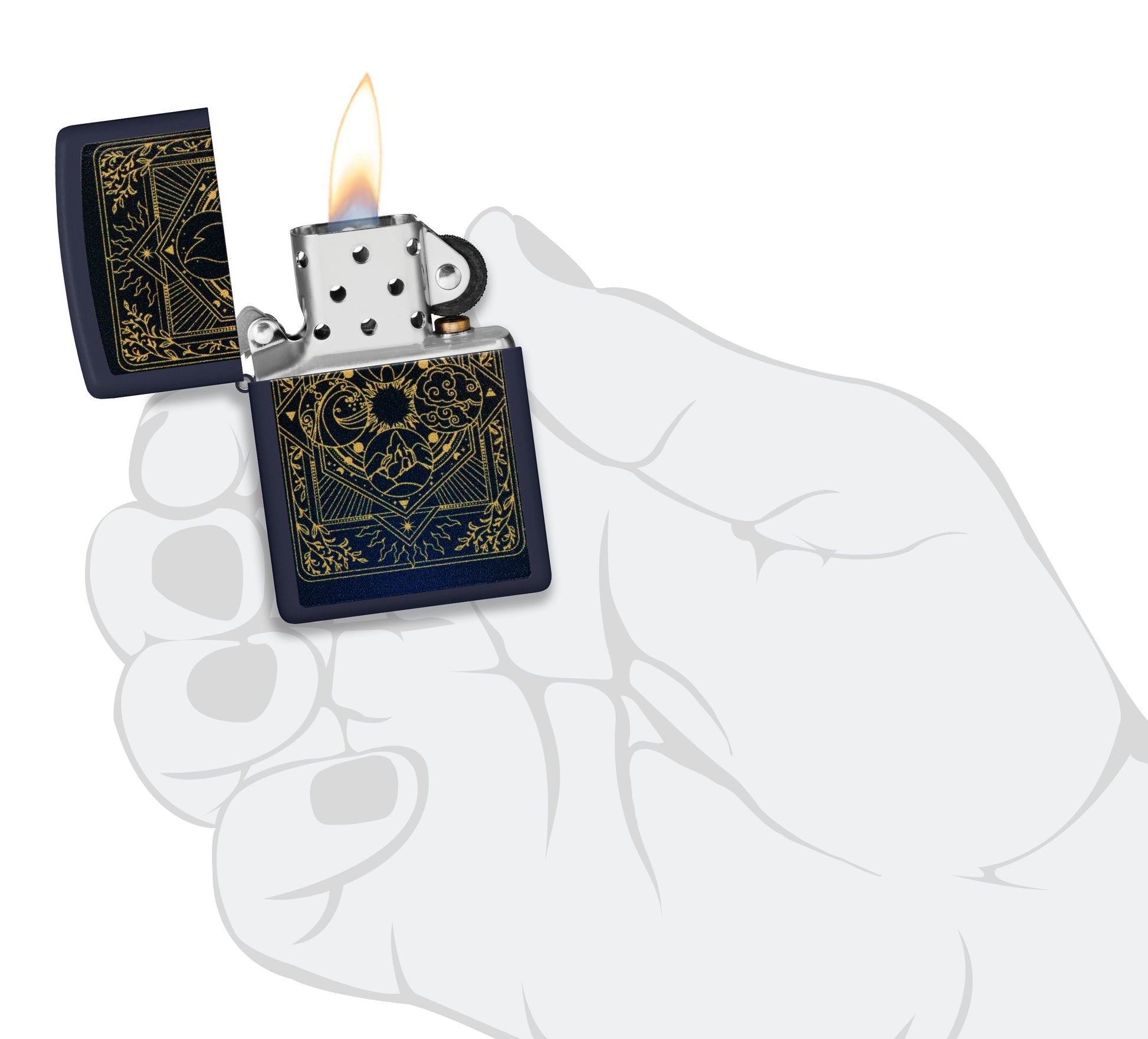 Mit diesem verträumten Feuerzeug in Navy Matte können Sie Ihre Liebe zur Natur zeigen. Das klassische Zippo Flammensymbol im komplizierten Color Image-Design repräsentiert das Element Feuer – eine Ode an die Elemente der Erde.