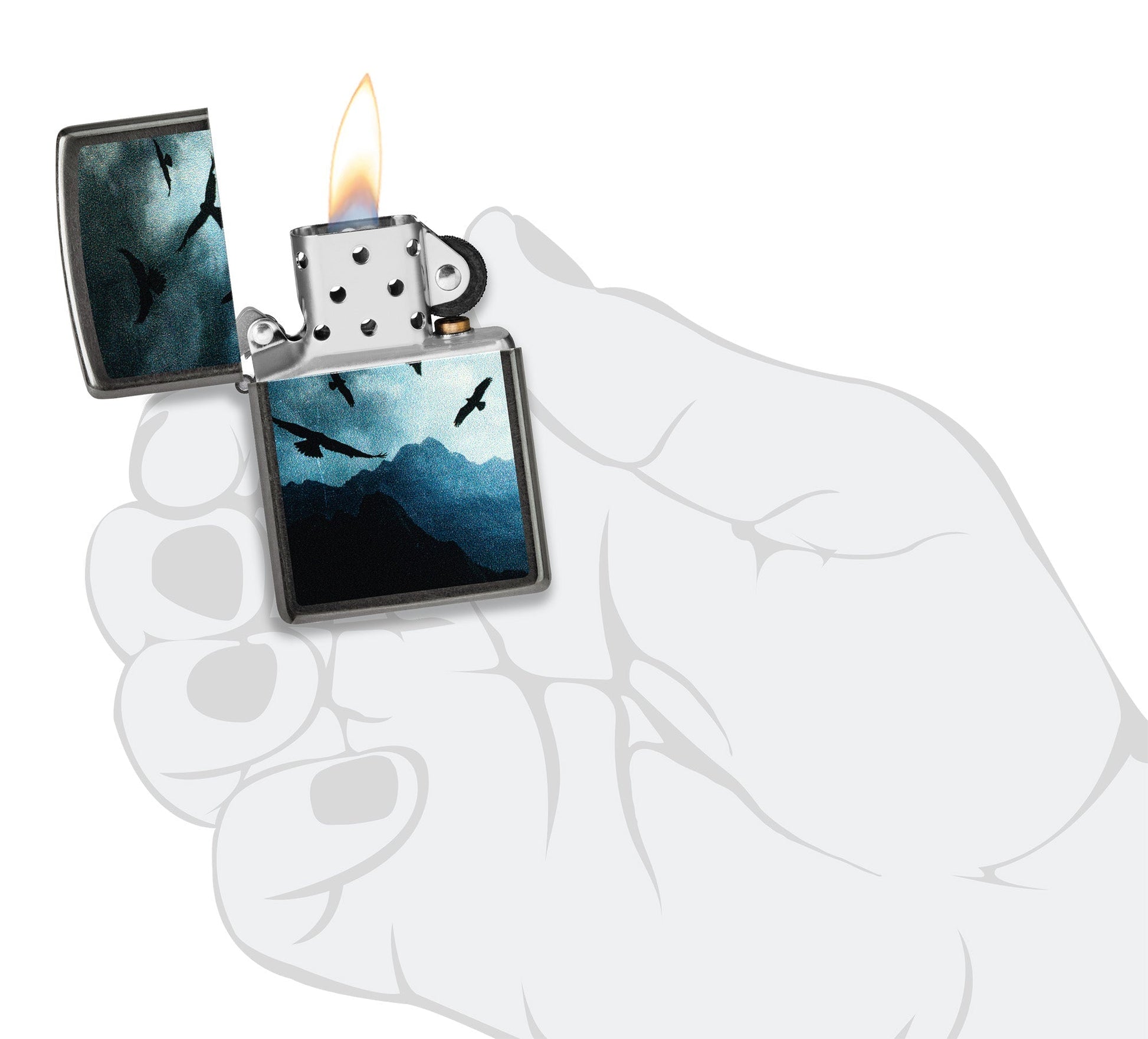 Eine Schar Falken fliegt über eine bewölkte Berglandschaft auf diesem klassischen Feuerzeug in Grau in einem ruhigen Farbbilddesign.