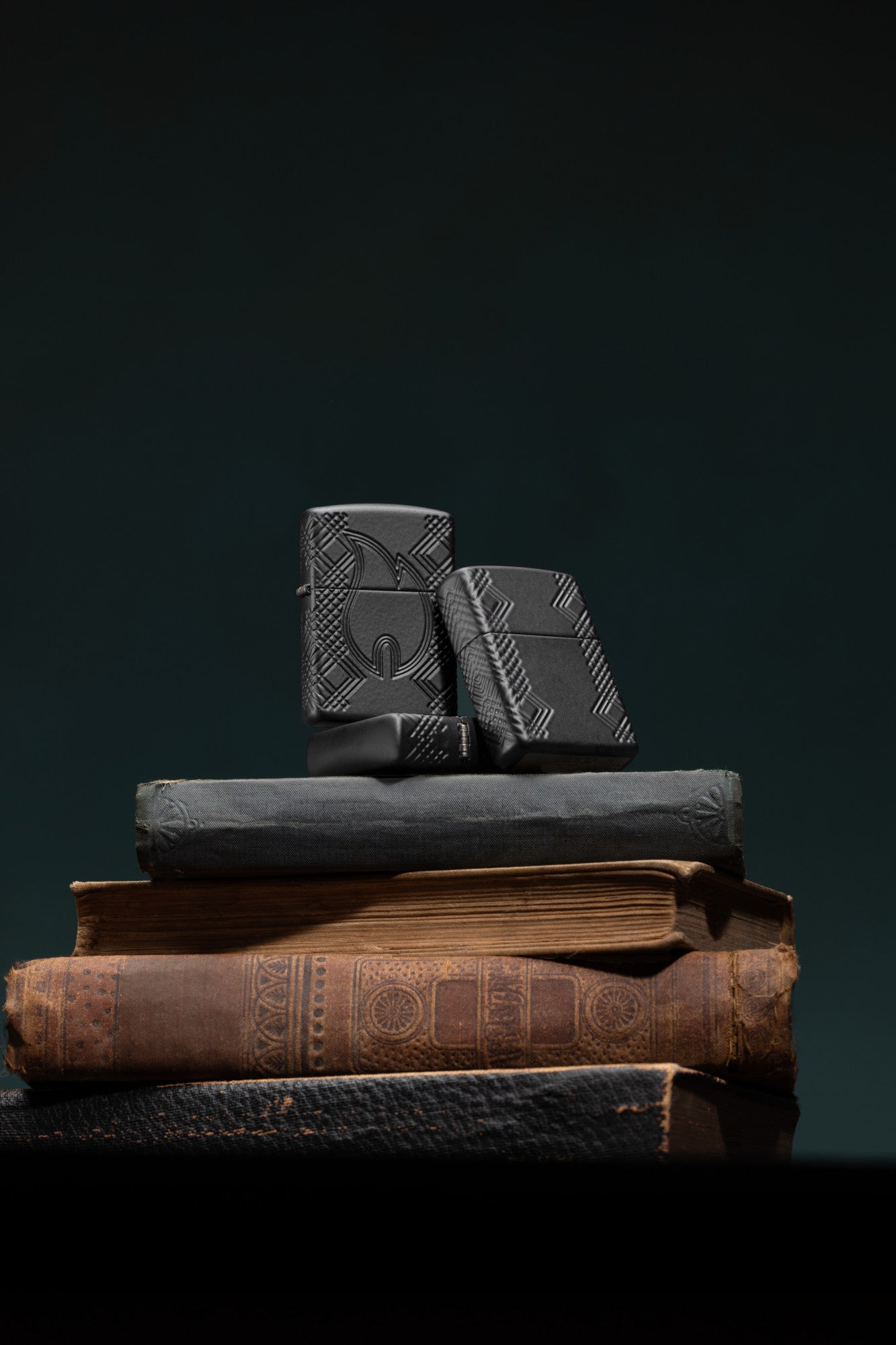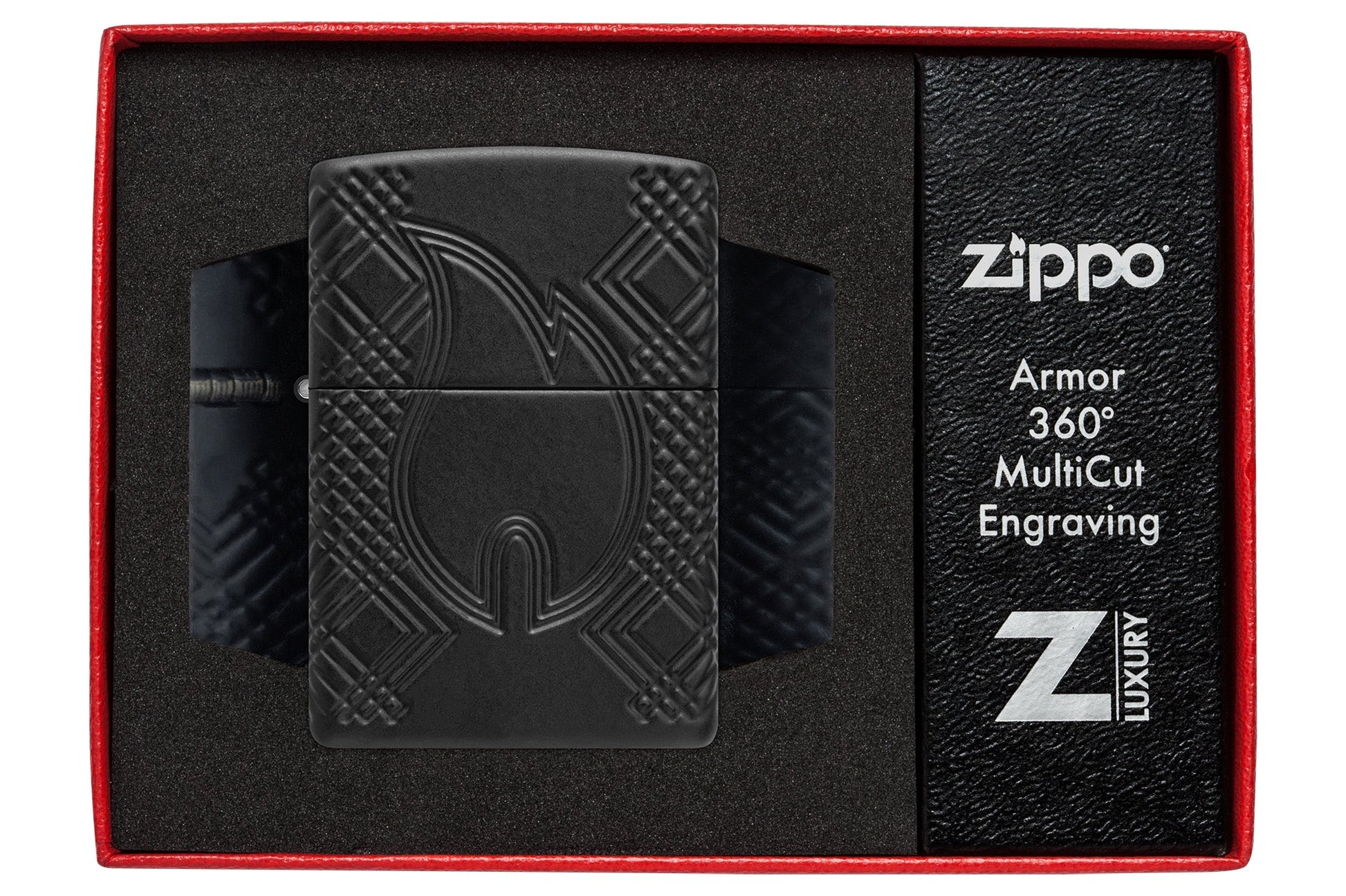 Das Zippo Flammensymbol ist auf diesem Armor®-Feuerzeug in mattem Schwarz mit edlem MultiCut-Design von einem reich strukturierten Nietenmotiv umgeben, das sich um alle Seiten des Feuerzeugs zieht.