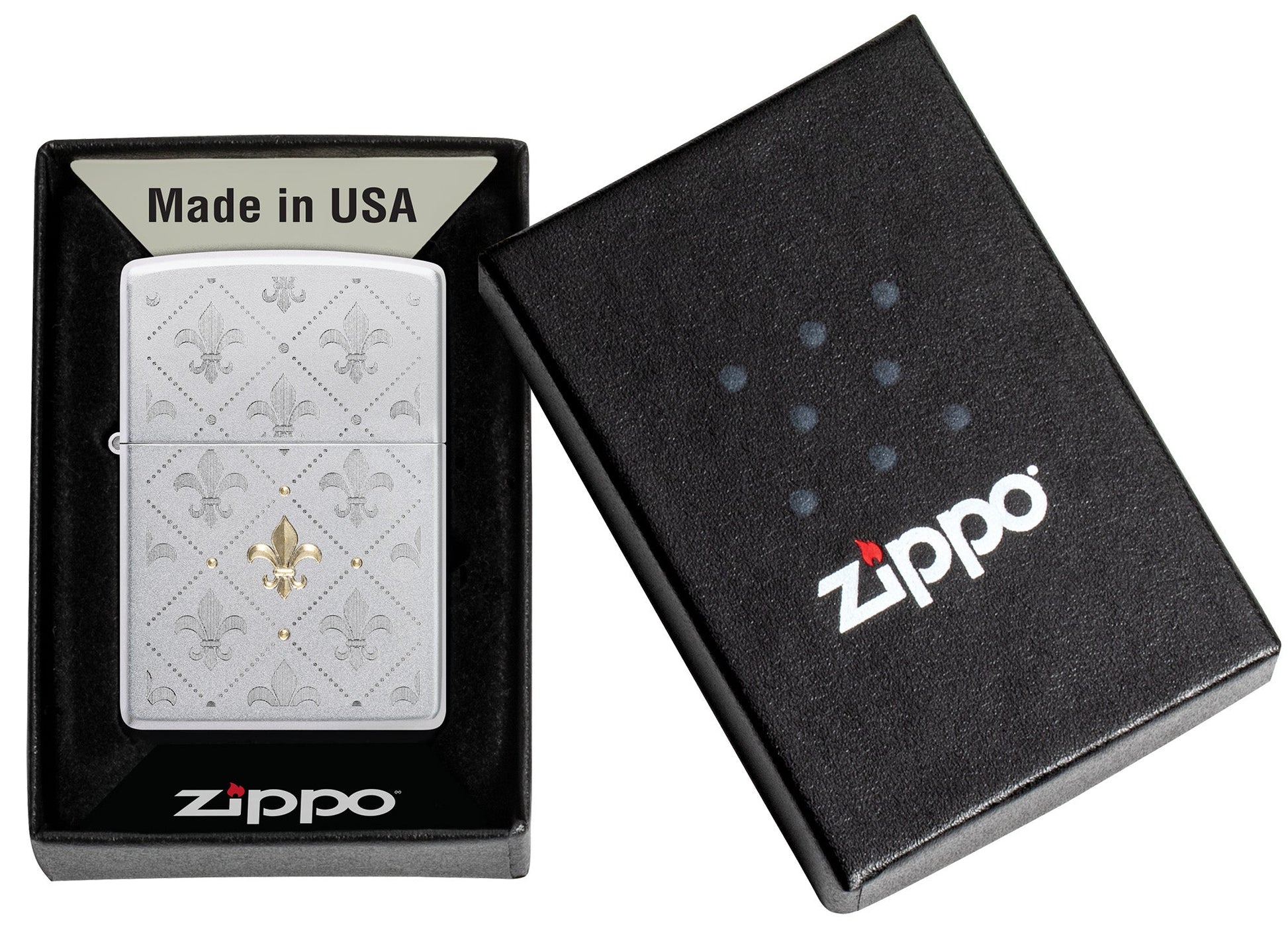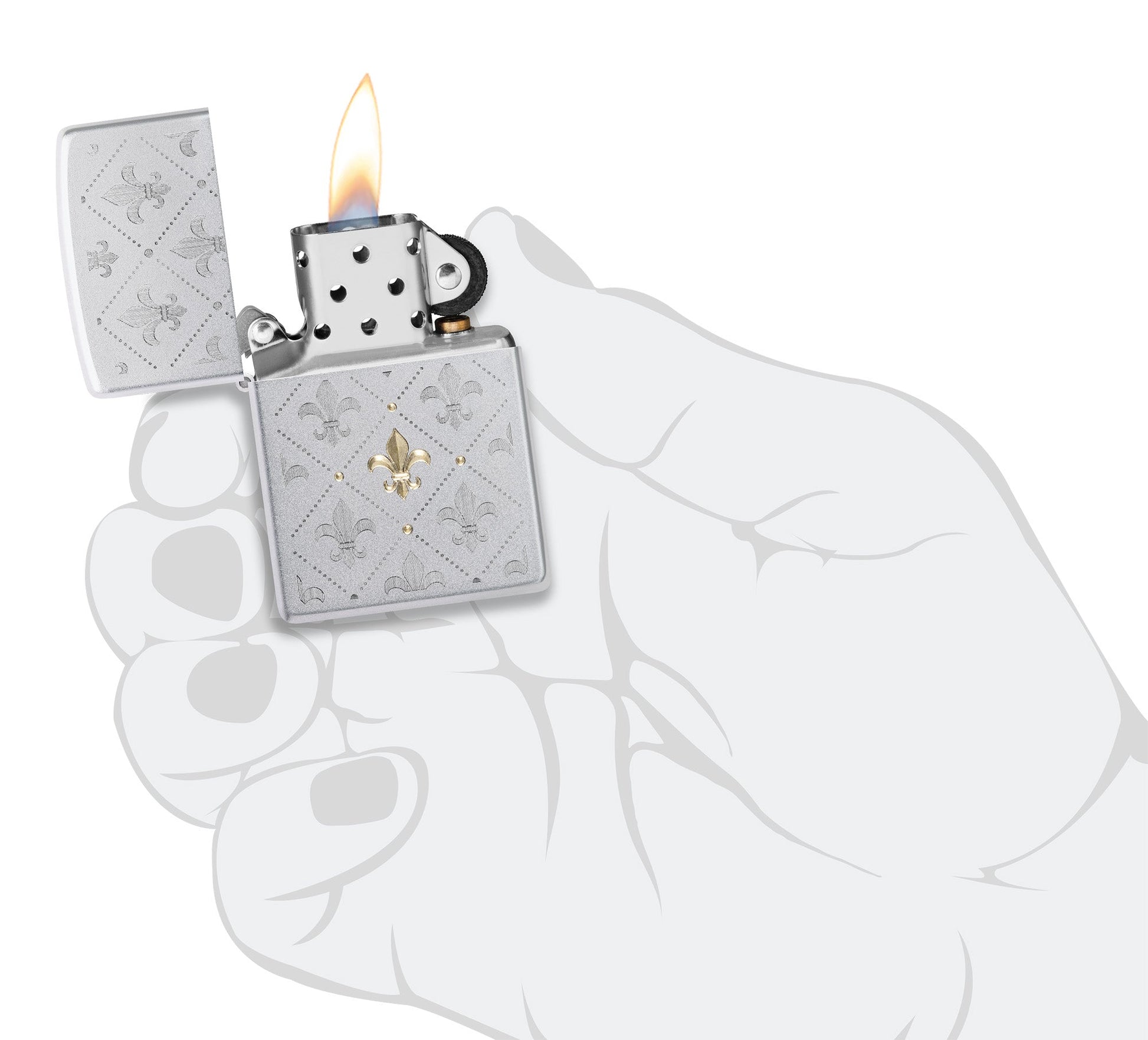 Die Lilie (Fleur de Lis), ein Symbol für Einheit und Widerstandsfähigkeit, ziert dieses klassische Feuerzeug aus satiniertem Chrom mit einem faszinierenden Motiv in einem attraktiven zweifarbigen Design, das einen luxuriösen Kontrast bildet.
