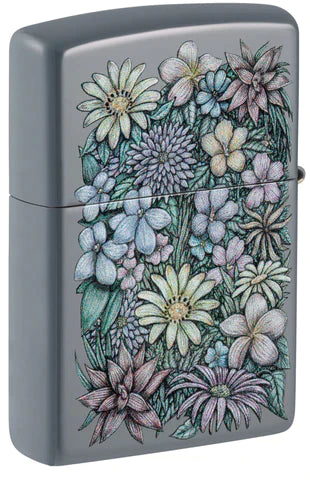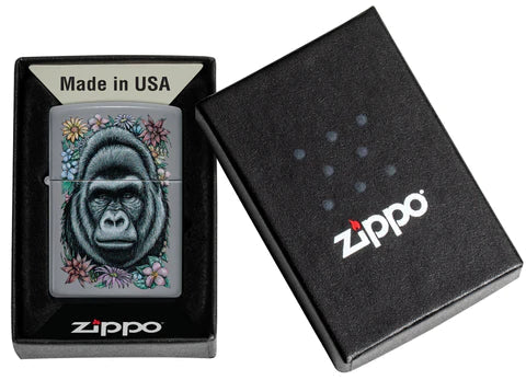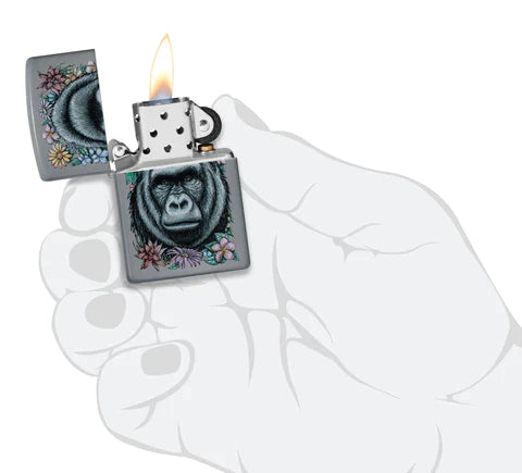 Ein mächtiger und doch ruhiger Gorilla, der für Stärke, Weisheit und einen nährenden Geist steht, ist der Mittelpunkt dieses glatten Flat Grey Feuerzeugs. Der sanfte Riese ist umgeben von zarten Blumen und Pflanzen in diesem beruhigenden zweiseitigen Farbbild-Design.
