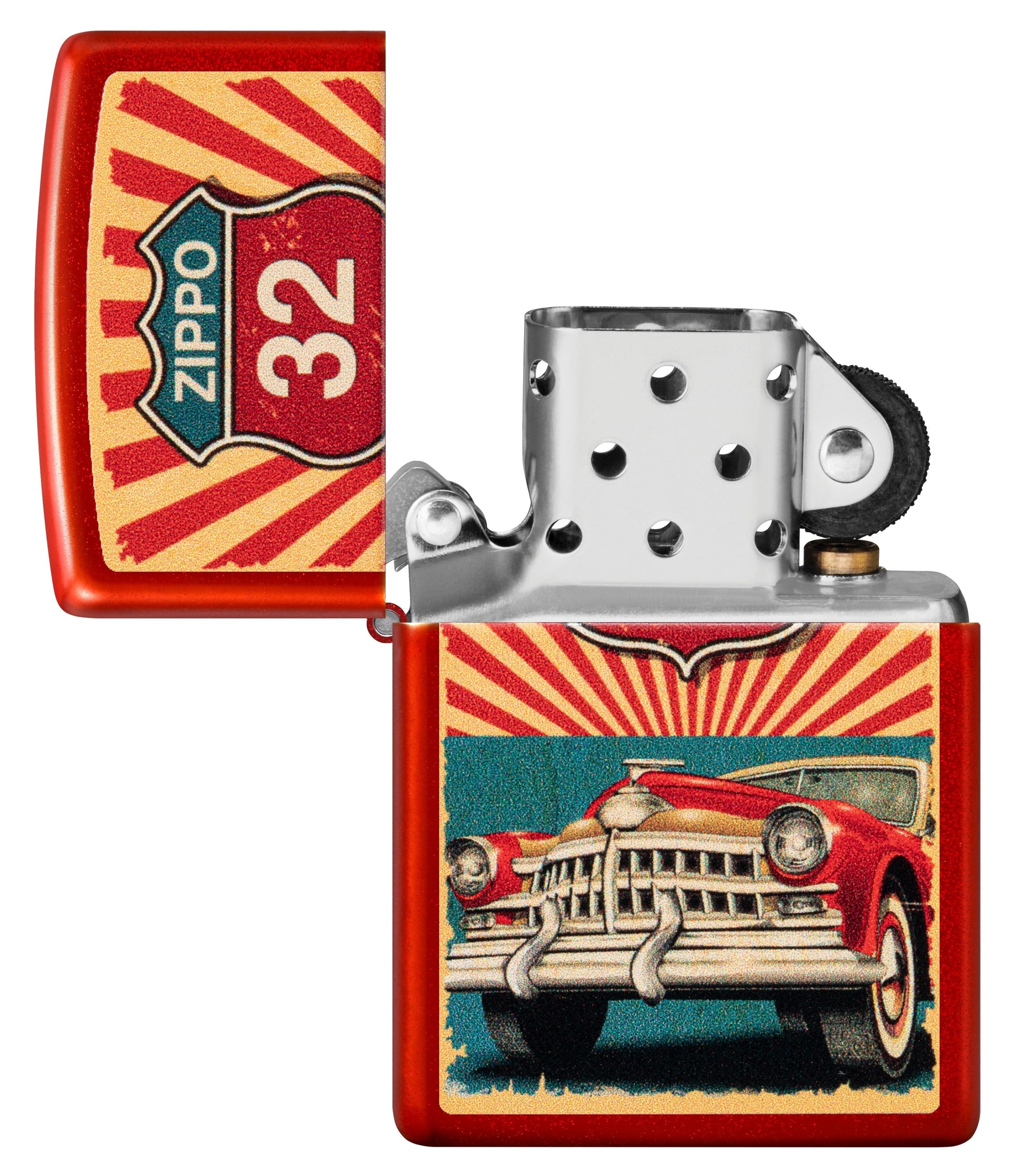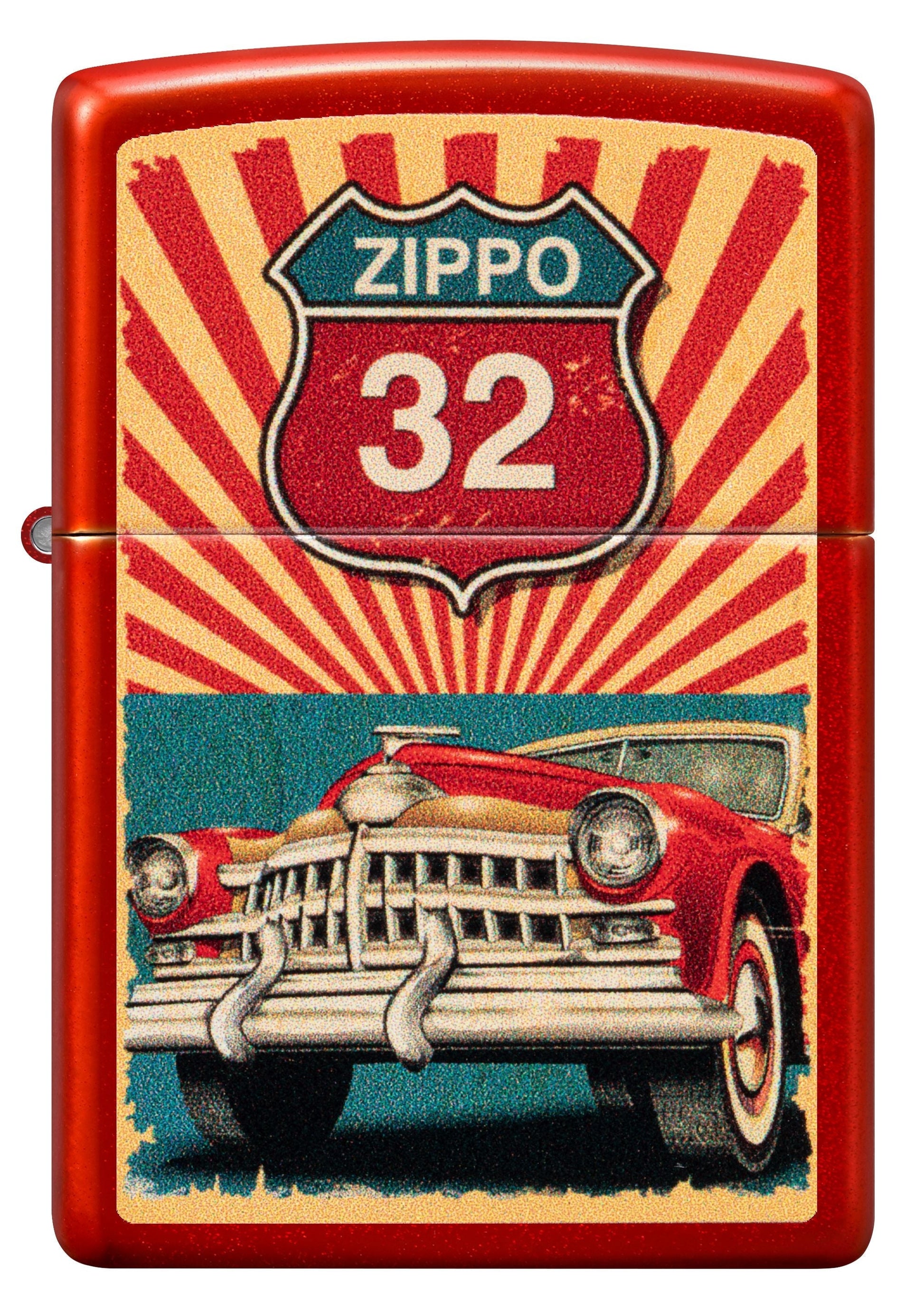 Mit diesem klassischen Feuerzeug in Metallic Red können Sie auf die Straße. Das abenteuerliche Color Image-Motiv zeigt einen klassischen Cruiser unter einem von Zippo inspirierten Straßenschild.