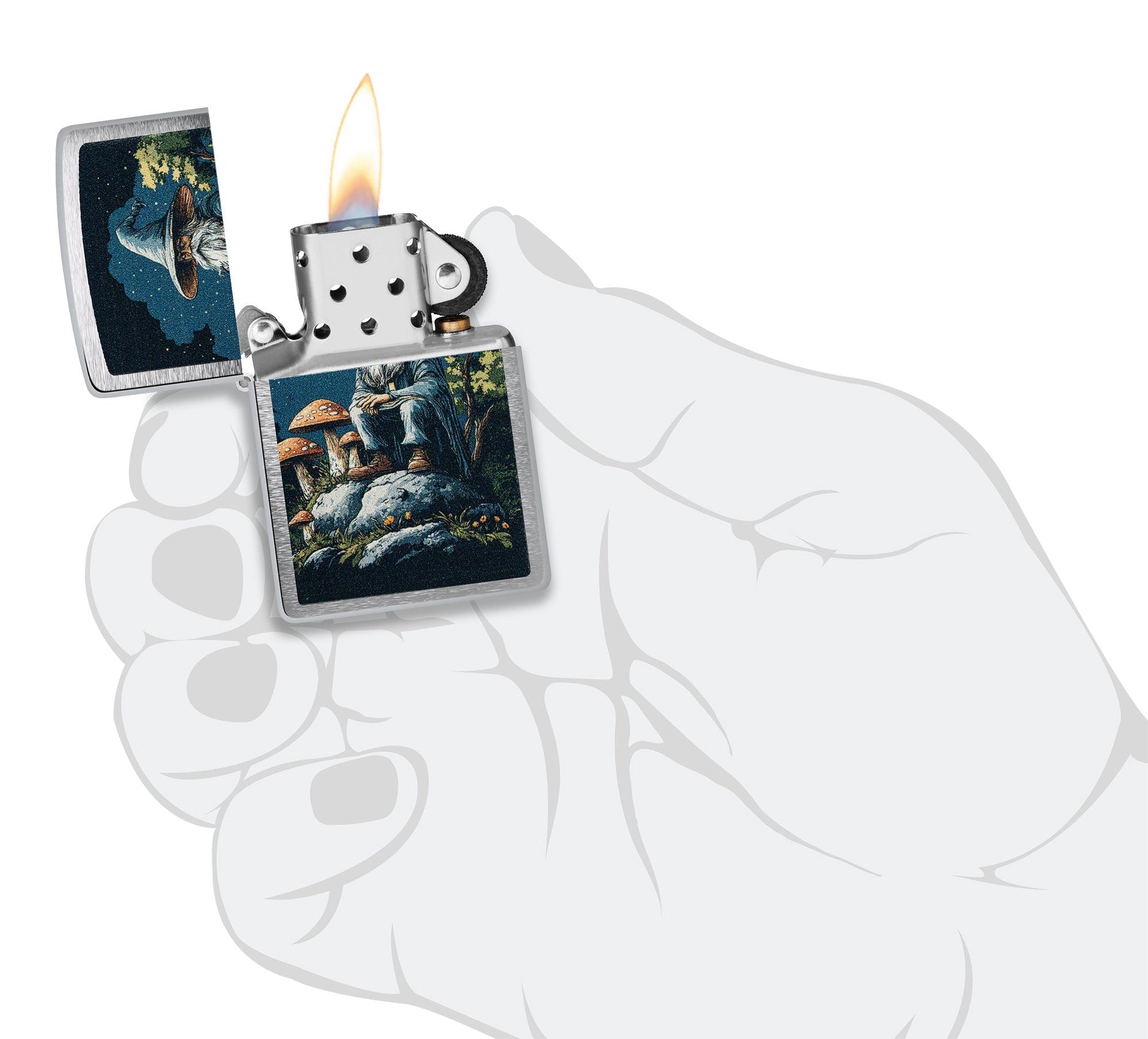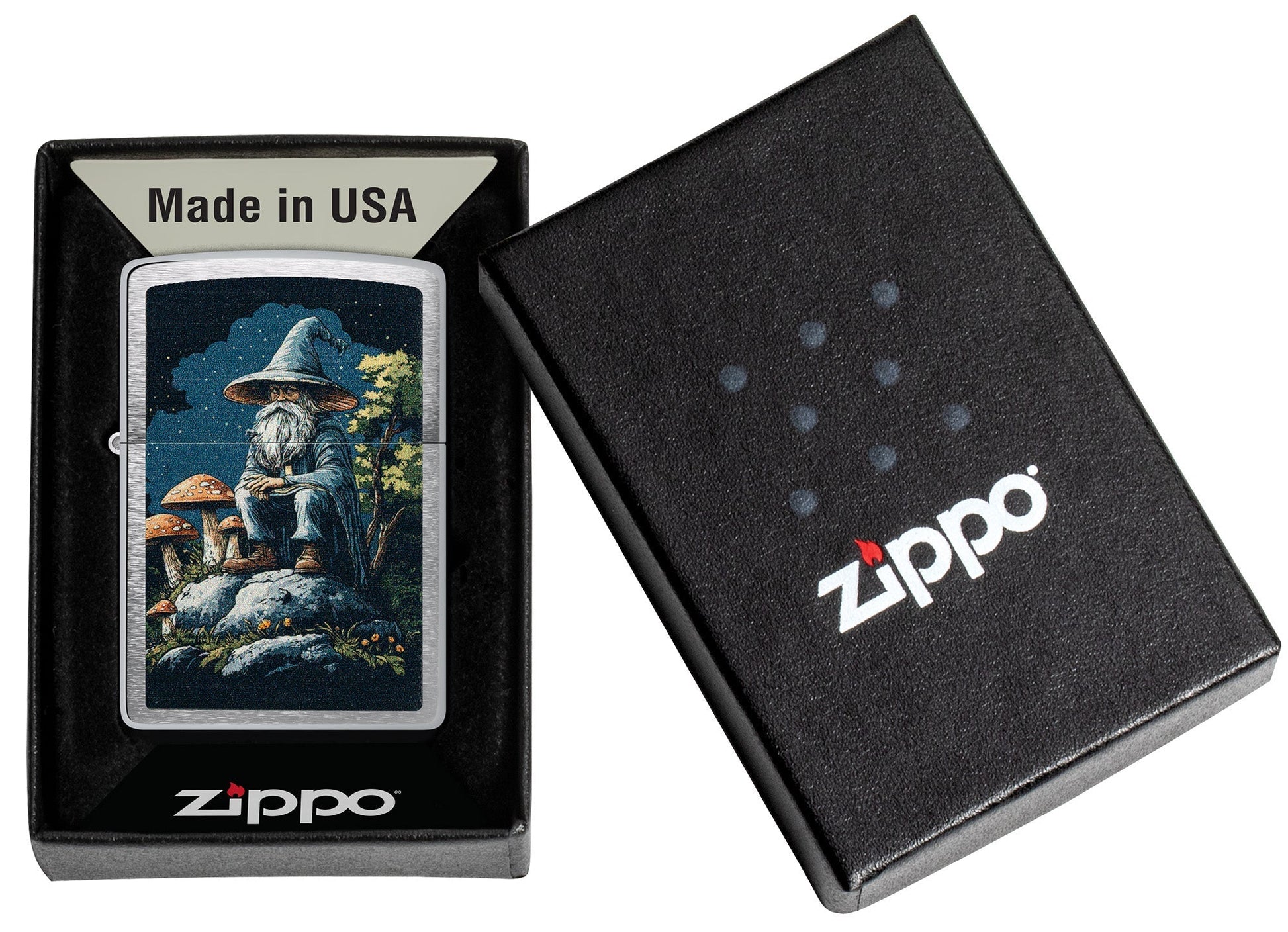 Wie aus einem Märchenbuch sitzt ein alter, von der Witterung gezeichneter Zauberer zwischen Pilzen und Blattwerk in einem verspielten Farbbilddesign auf der Oberfläche dieses klassischen Feuerzeugs in gebürstetem Chrom.