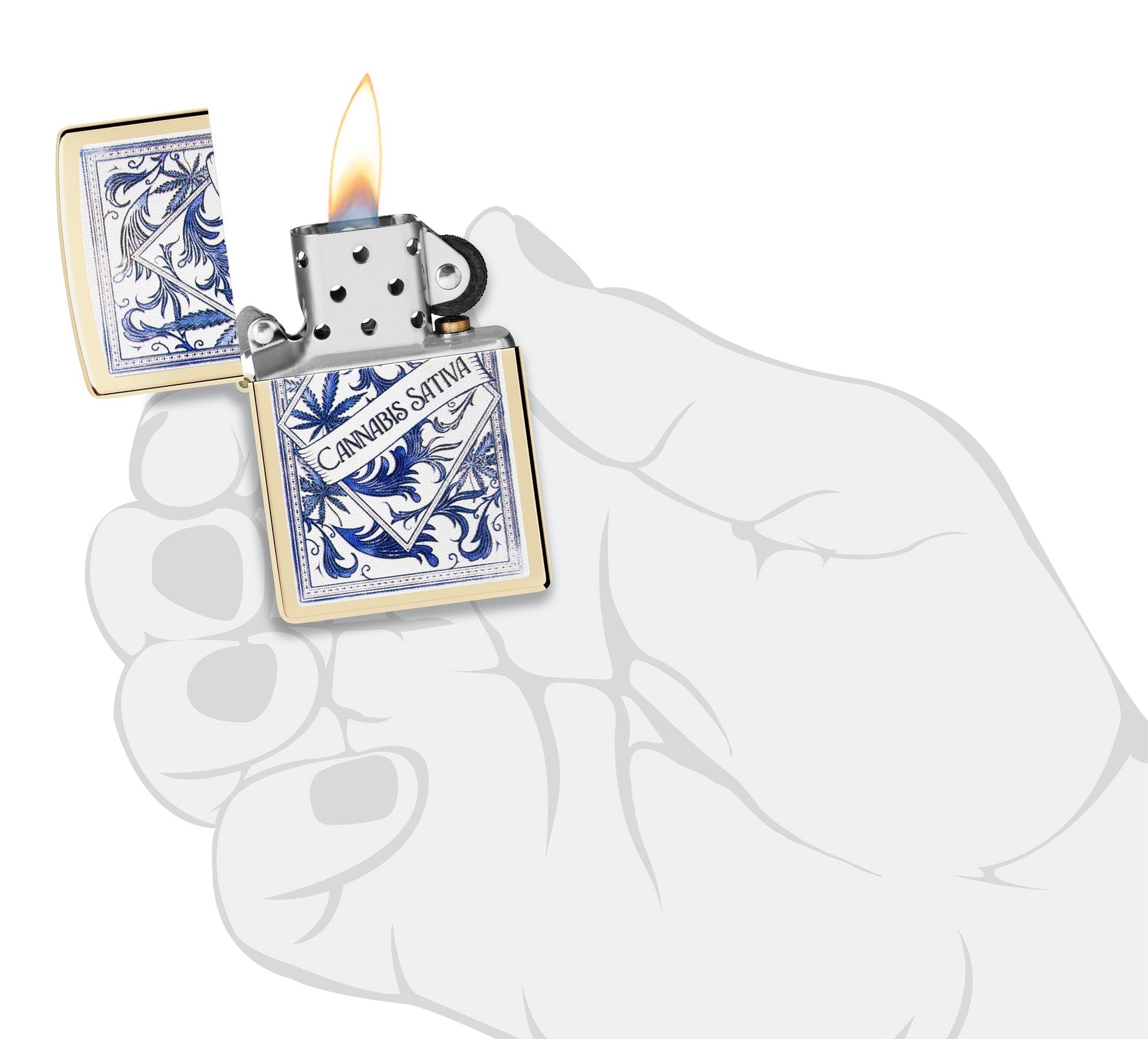 Dieses klassische Feuerzeug in Champagner mit ruhigen Blautönen und wogenden Pflanzenmotiven zeigt ein elegantes Apothekeretikett für Cannabis Sativa in einem beruhigenden Farbbilddesign.