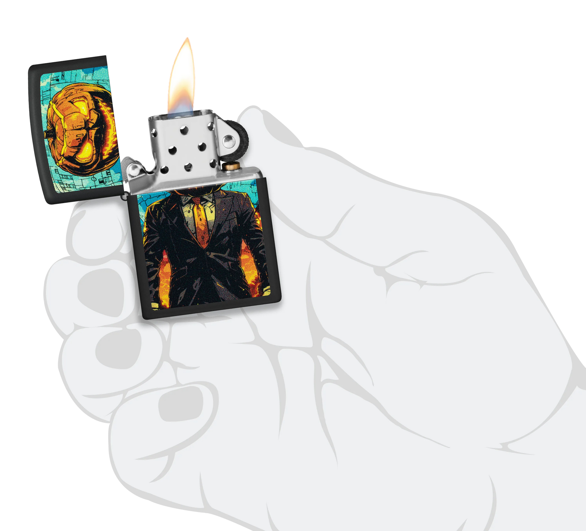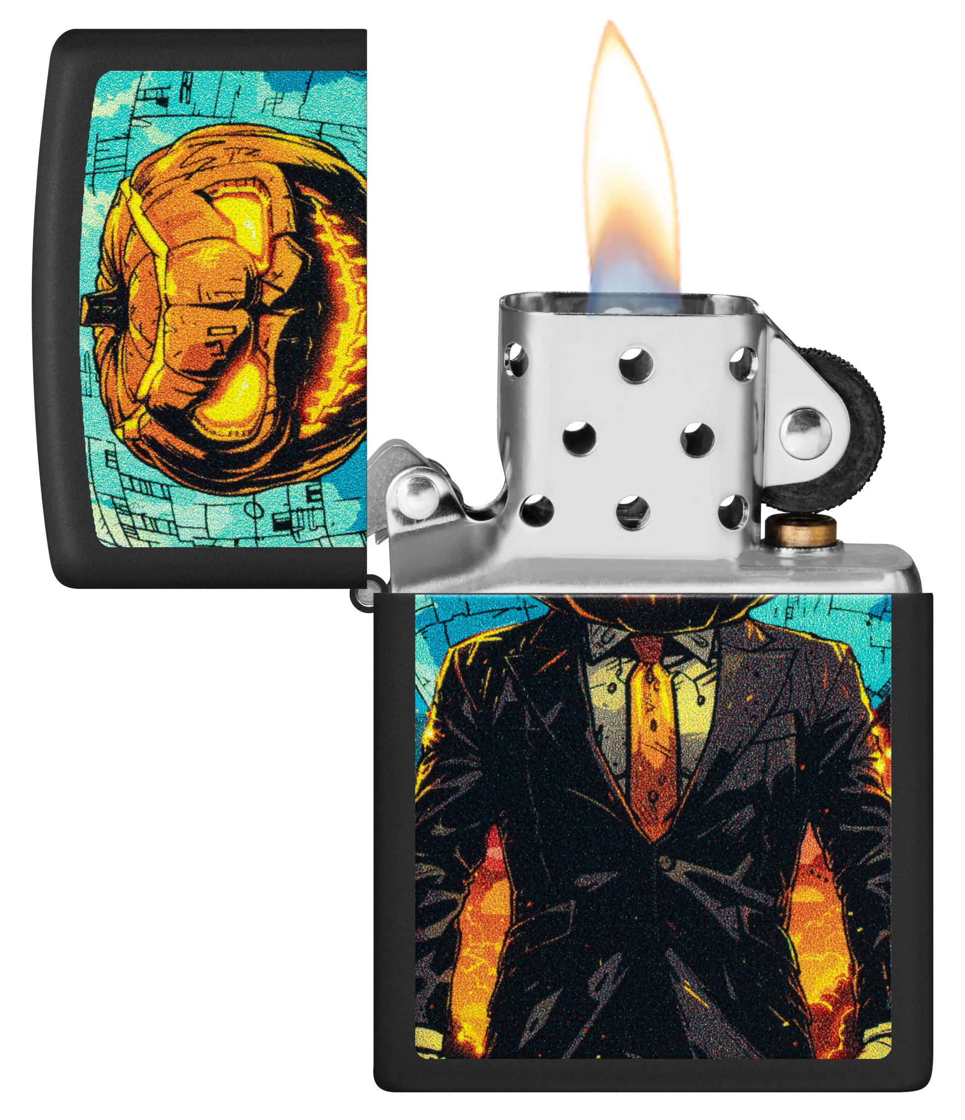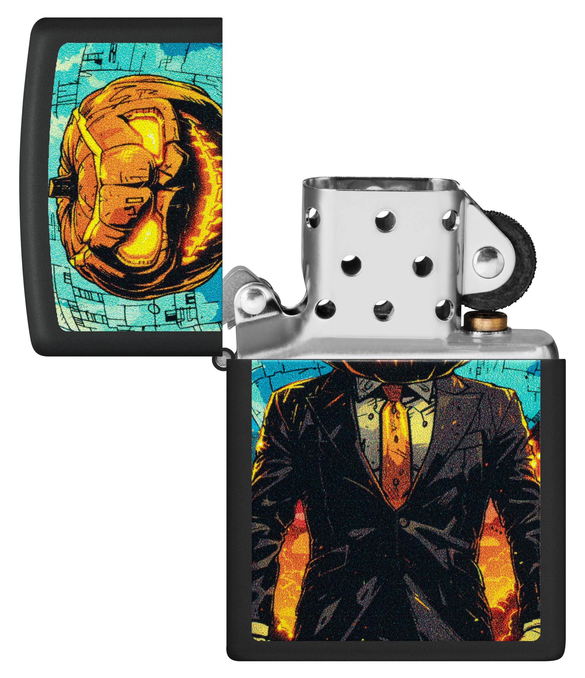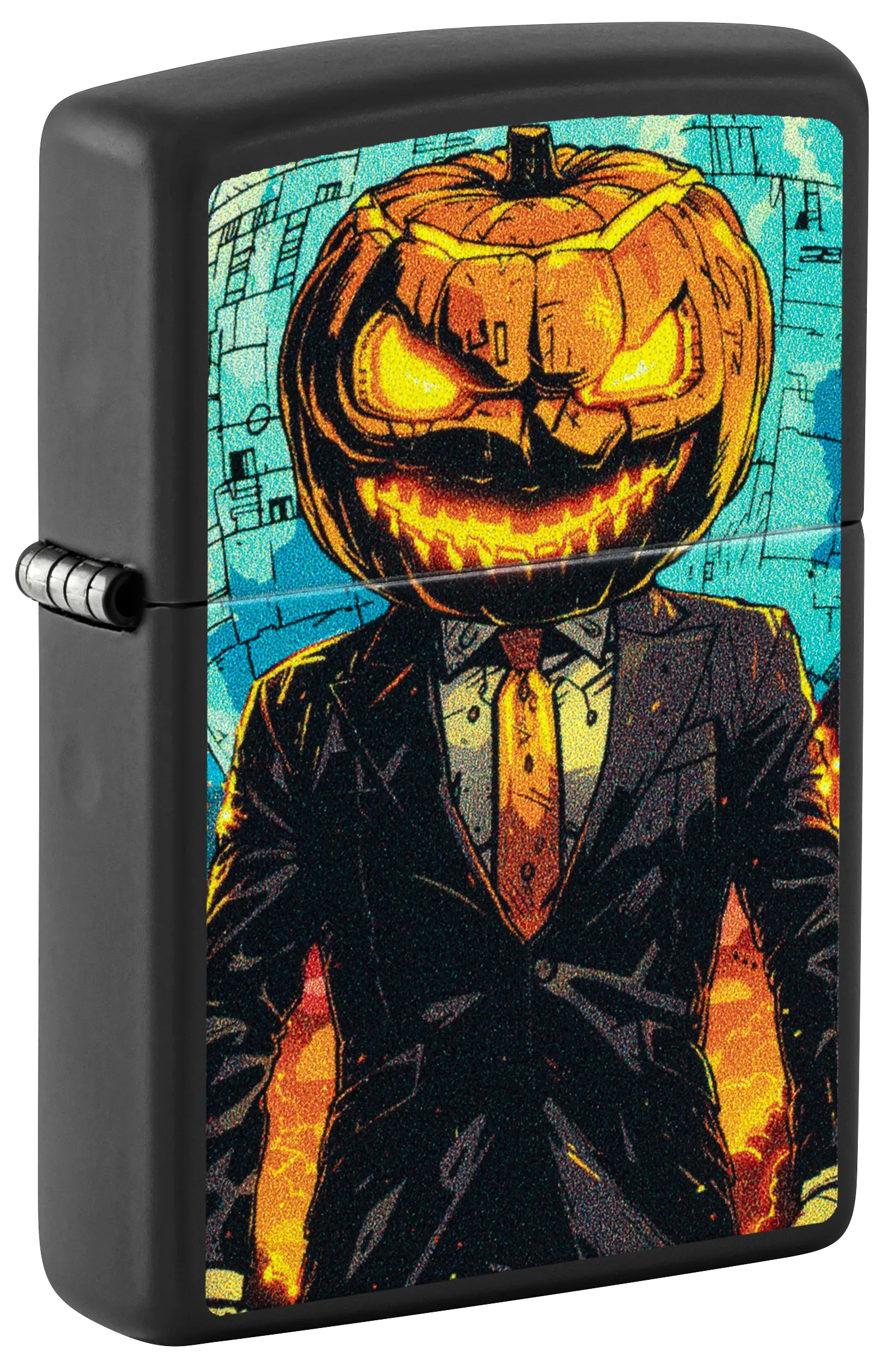 Auf diesem klassischen Feuerzeug in Black Matte in einem gespenstischen Color Image-Design nimmt eine grinsende Kürbislaterne menschliche Gestalt an.