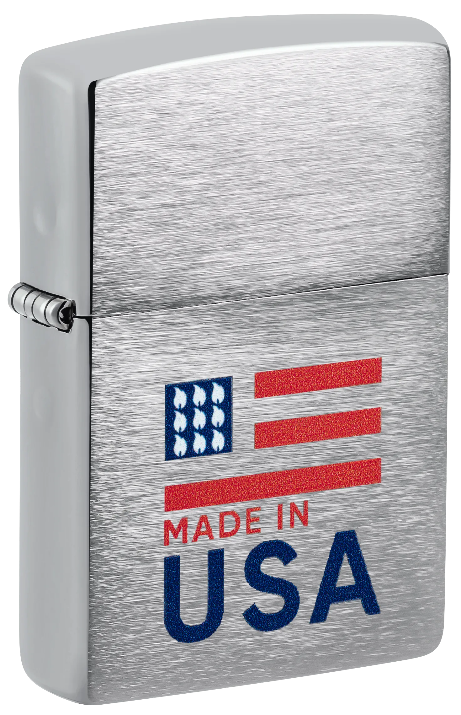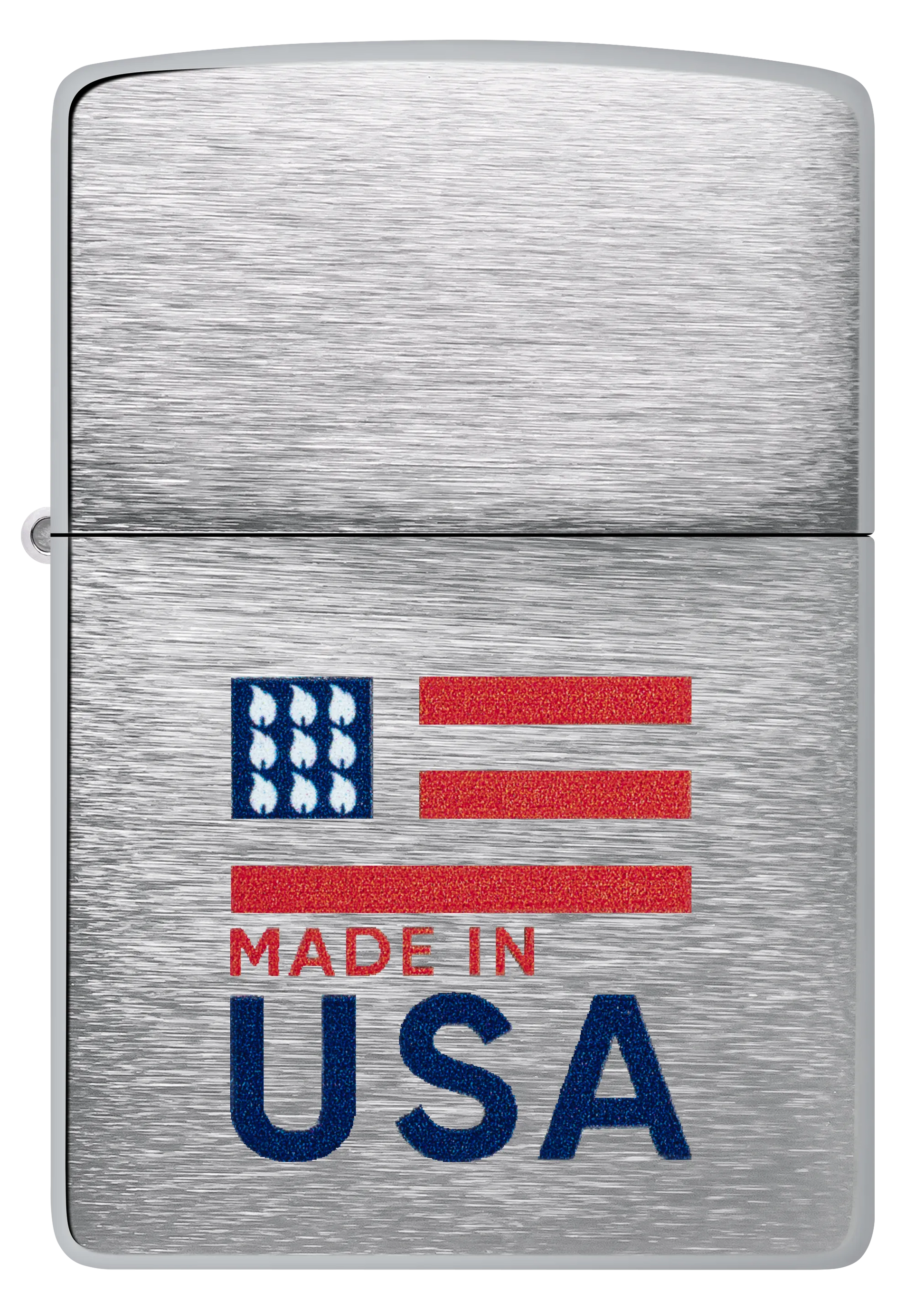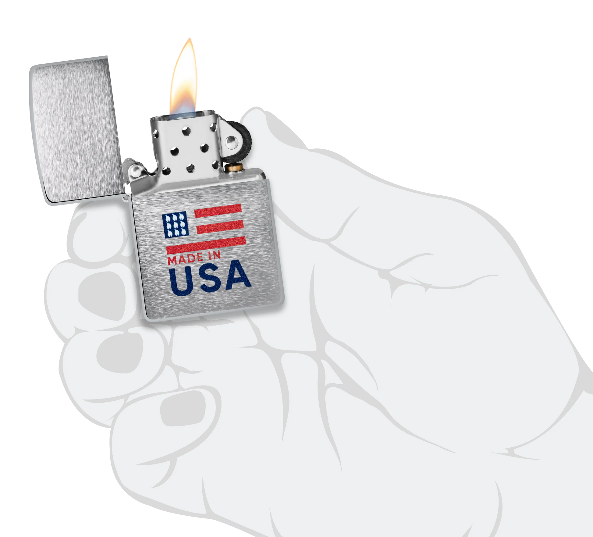 Wie der Name es sagt, wird dieses klassische Feuerzeug in Brushed Chrome in den USA hergestellt. Das patriotische Color Image-Motiv zeigt über der Aufschrift eine minimalistische Darstellung der amerikanischen Flagge.