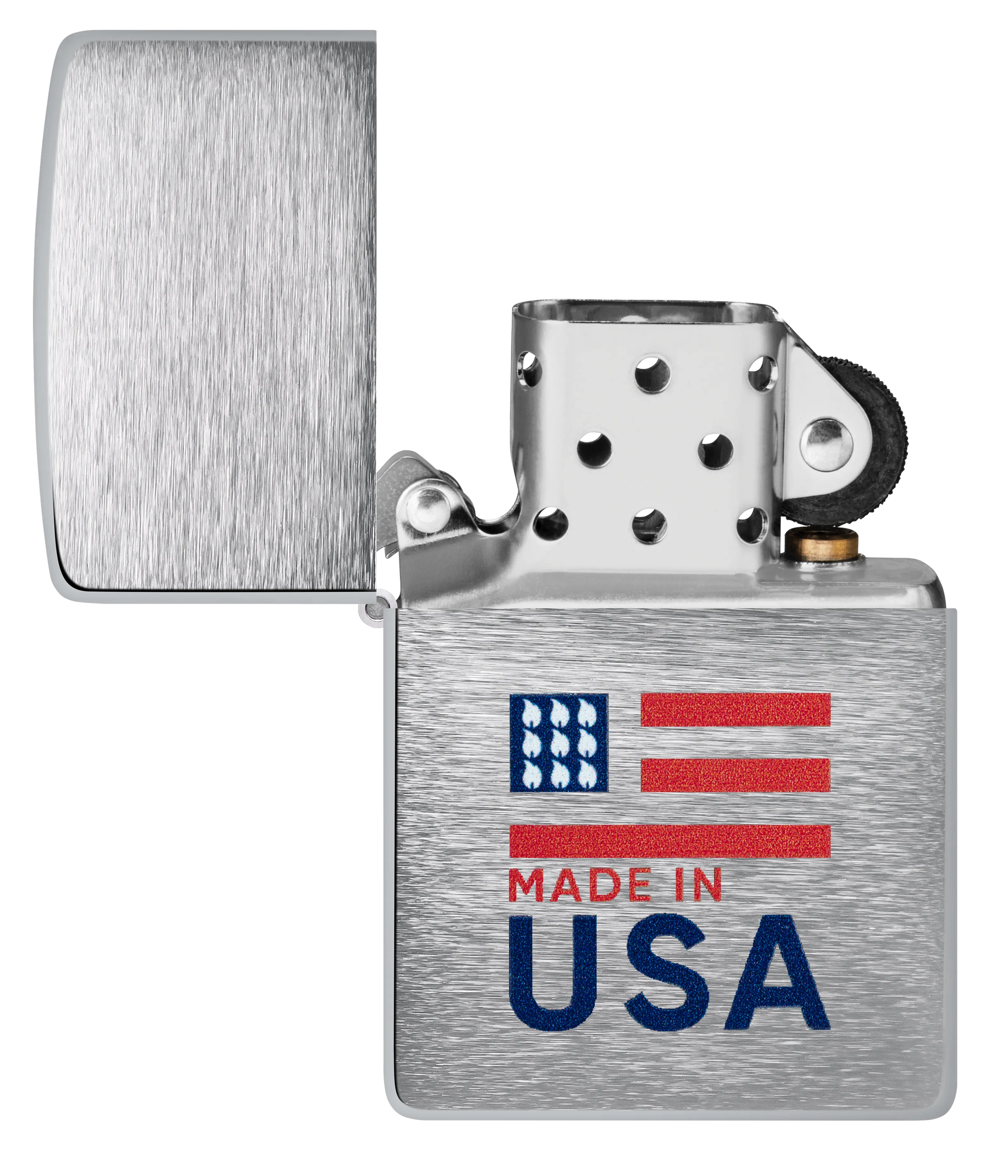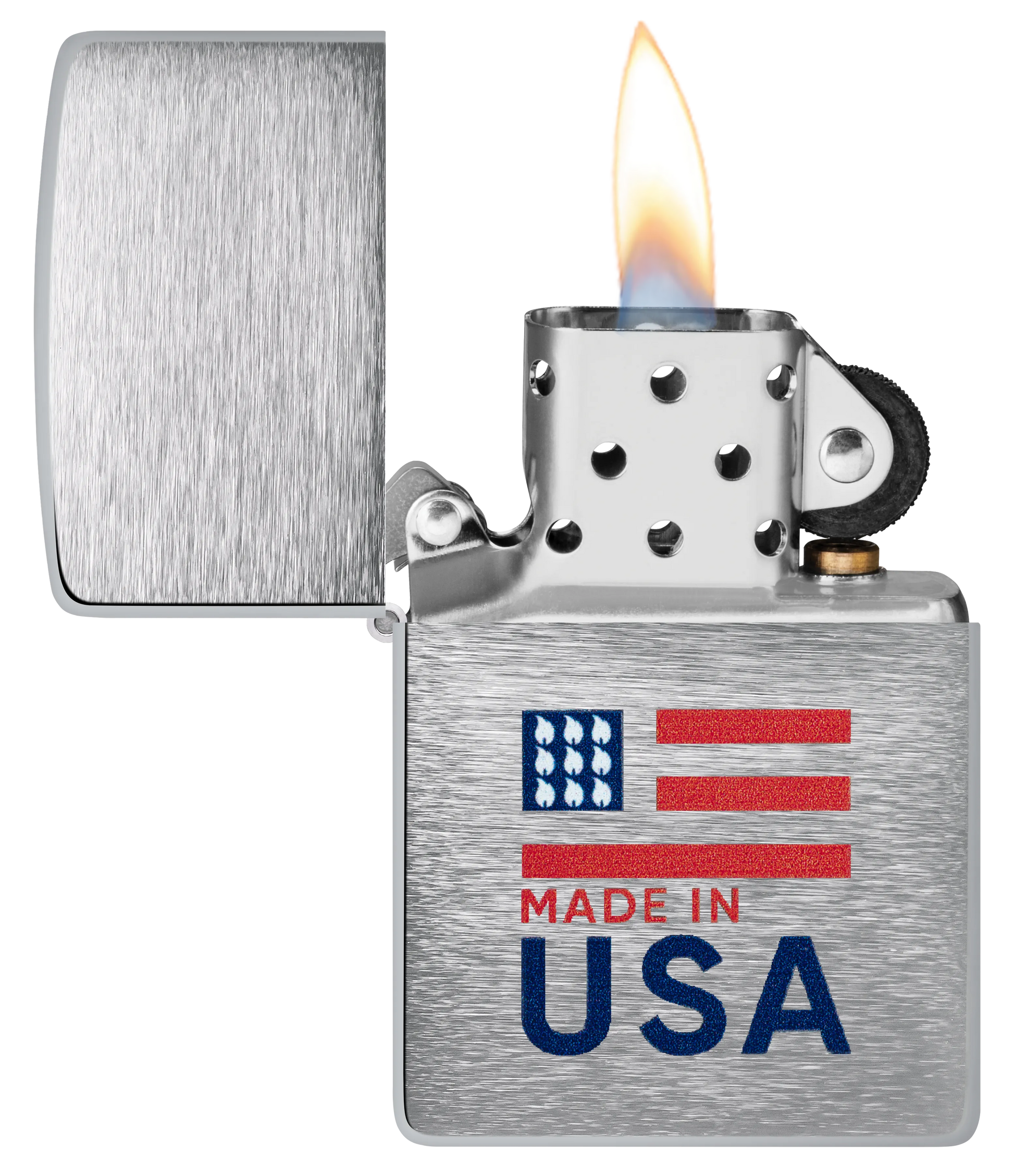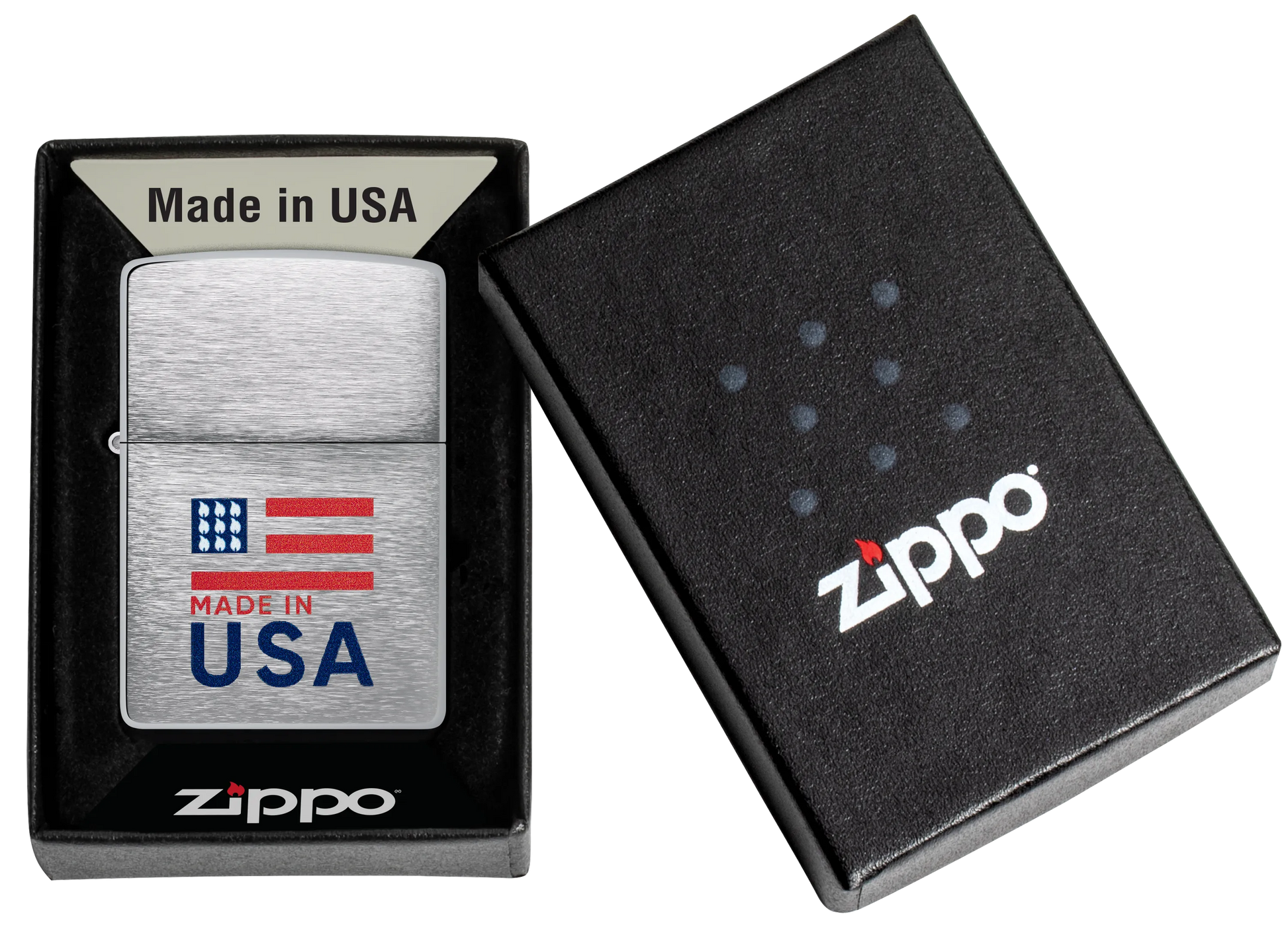 Wie der Name es sagt, wird dieses klassische Feuerzeug in Brushed Chrome in den USA hergestellt. Das patriotische Color Image-Motiv zeigt über der Aufschrift eine minimalistische Darstellung der amerikanischen Flagge.