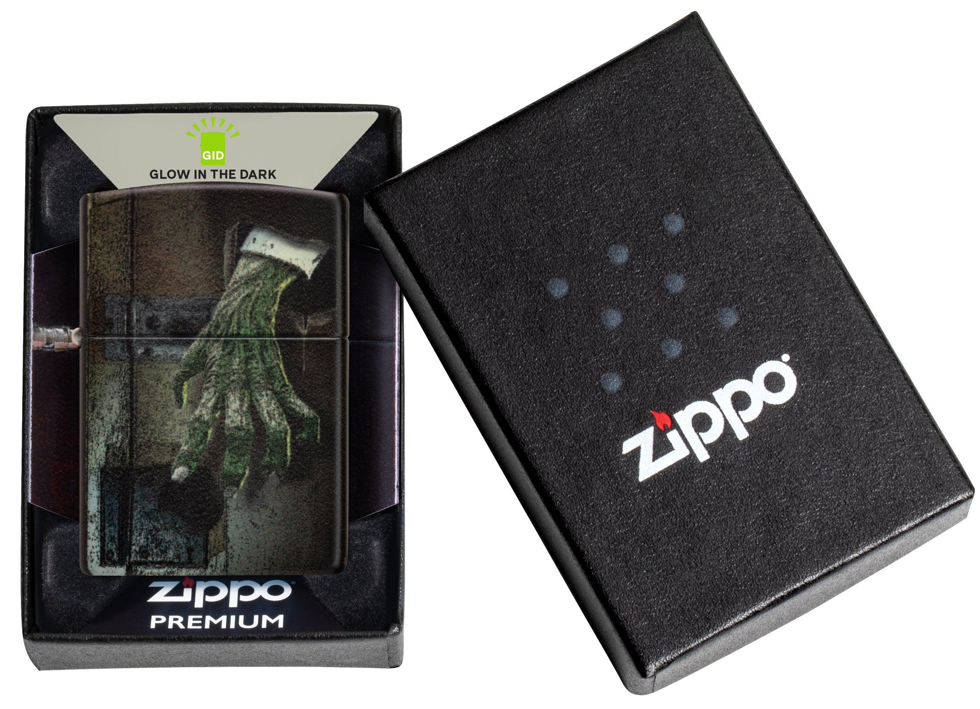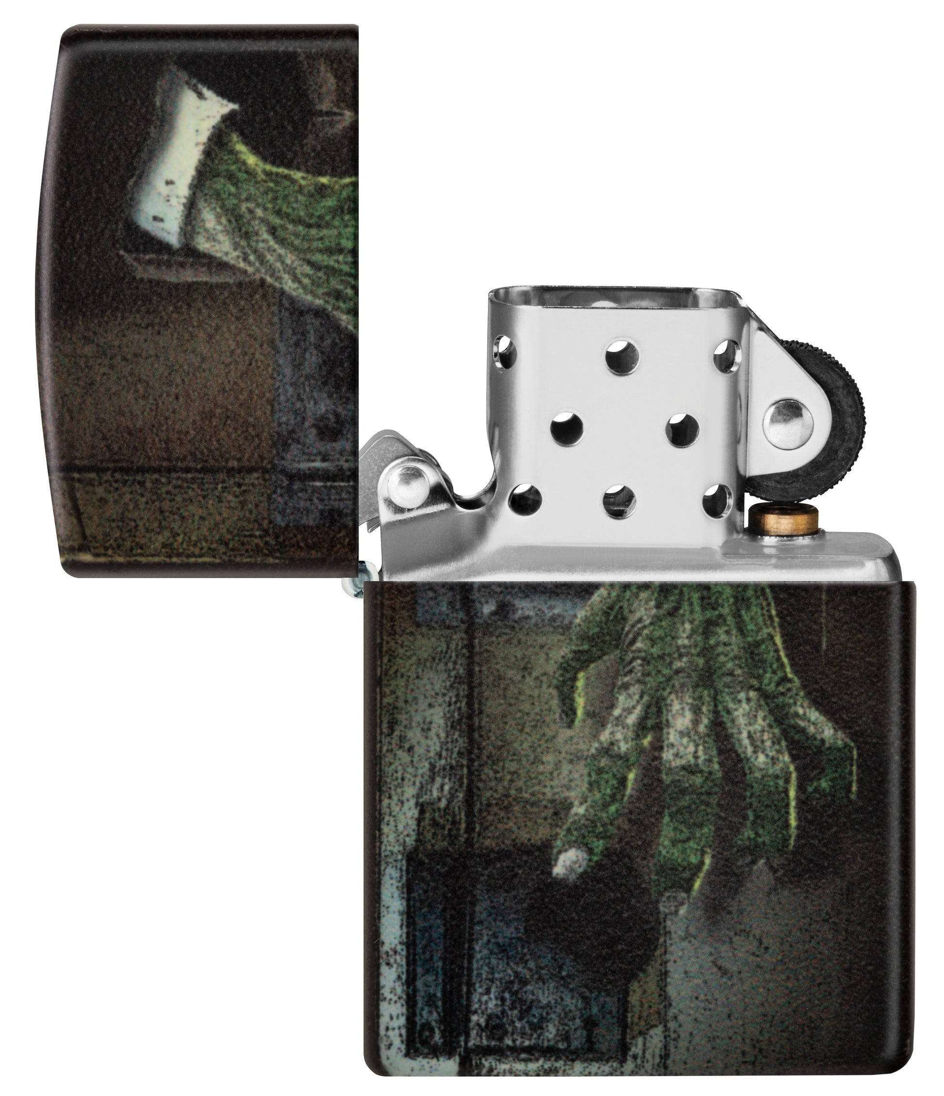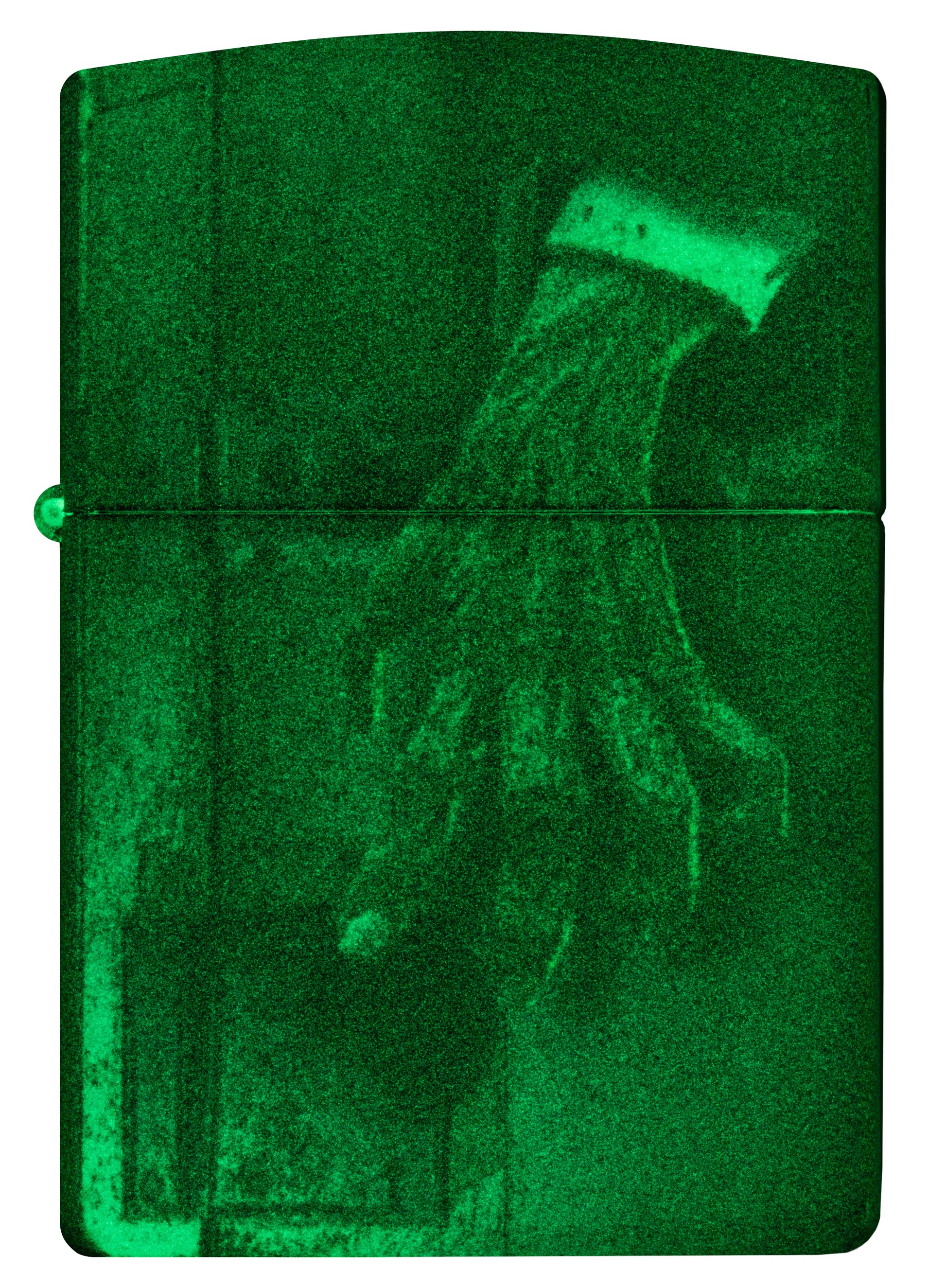 Ein gruseliger grüner Daumen sprengt die Schlösser dieses furchterregenden Glow in the Dark-Feuerzeugs. Das zweiseitige Design leuchtet, nachdem es nur wenige Minuten lang einem hellen Licht ausgesetzt wurde.