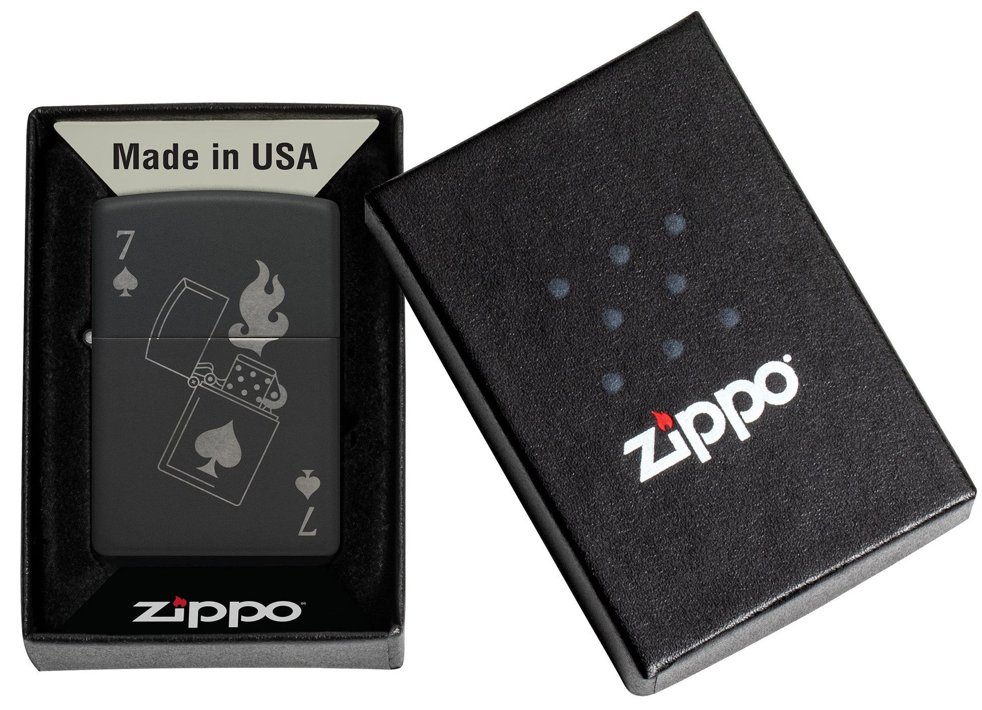 Verleihe deiner Sammlung mit diesem klassischen Feuerzeug in mattem Schwarz einen Hauch von Nostalgie. Das Lasergravurdesign lässt die Chromtöne des Feuerzeuggehäuses unter dem glatten Finish durchscheinen und zeigt ein flammendes, windfestes Feuerzeug auf einer Pik-Sieben-Spielkarte.