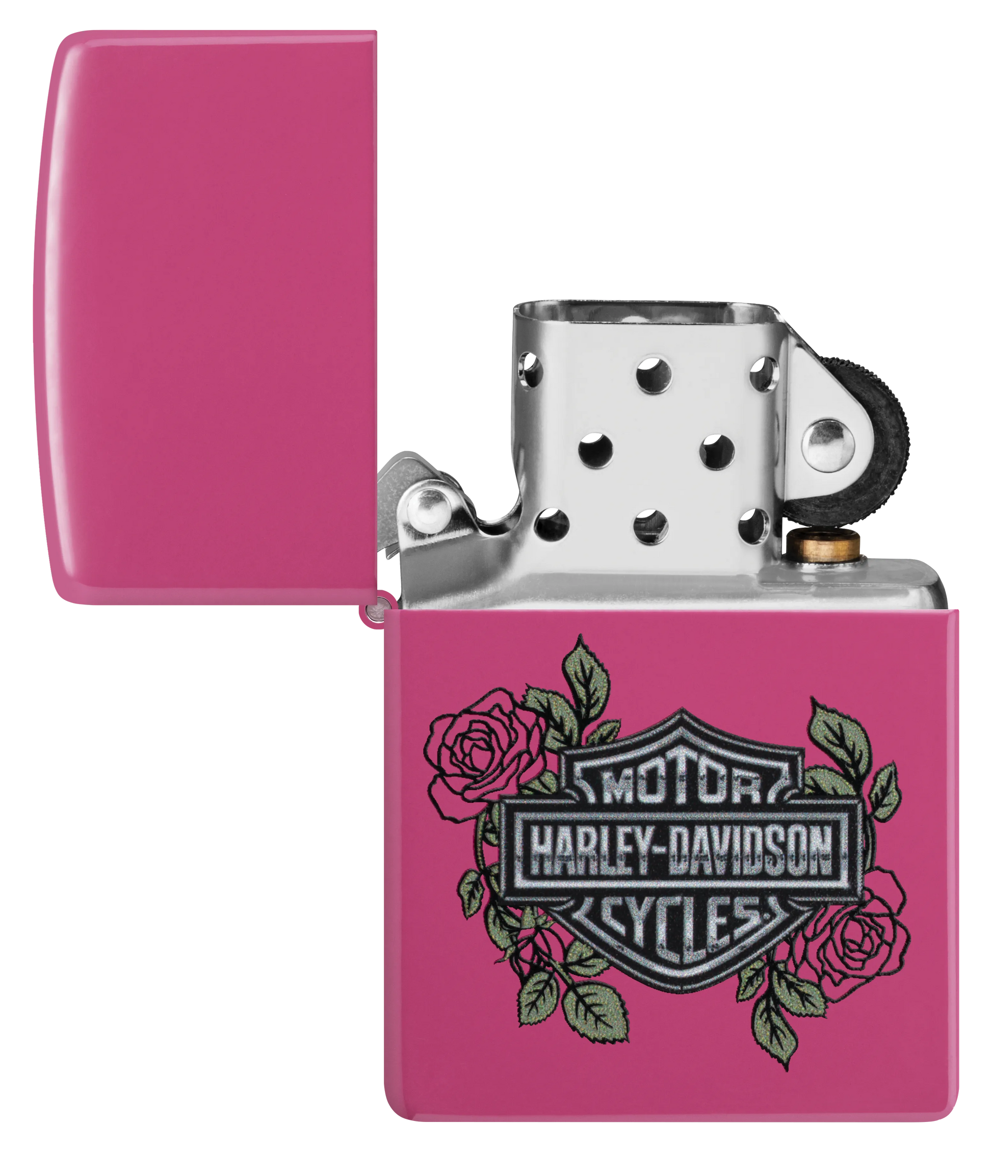 Dynamische Rosen schmücken das ikonische Harley-Davidson Bar-and-Shield-Logo in kräftigem Color Image-Design auf diesem Frequency-Feuerzeug in leuchtendem Pink.