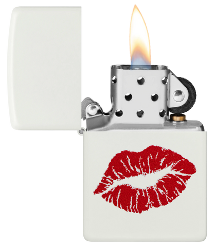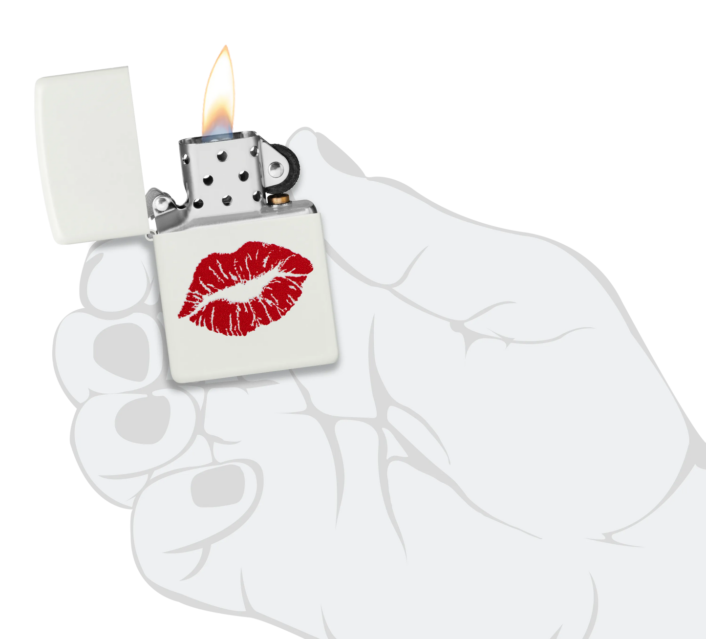 Dieses klassische White Matte-Feuerzeug ist mit einem Kuss versiegelt und zeigt einen leuchtend roten Lippenstiftabdruck in einem hübschen Color Image-Design.