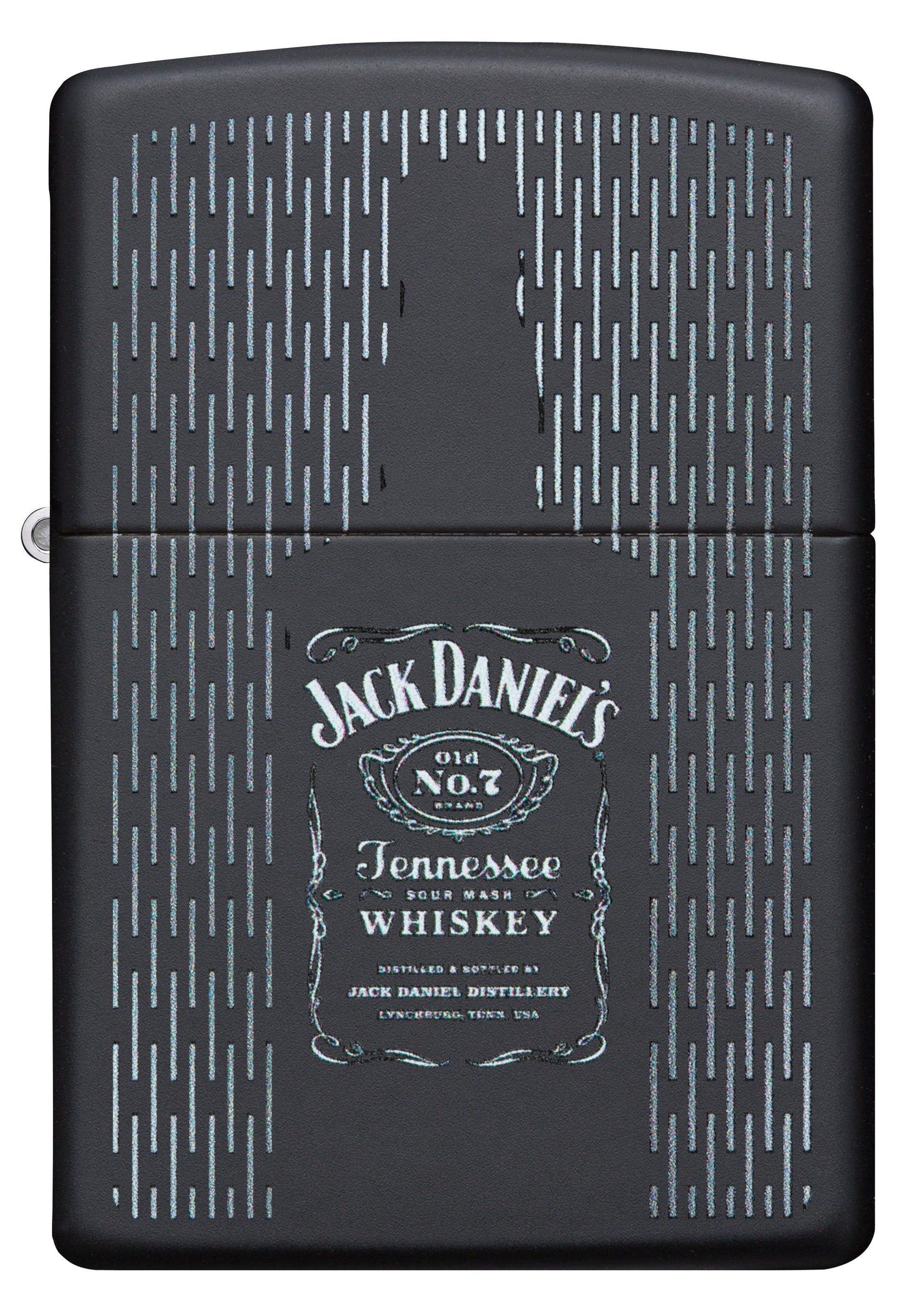 Dieses klassische Black Matte-Feuerzeug zeigt eine minimalistische Jack Daniels®-Flasche in einem monochromen Color Image-Design.