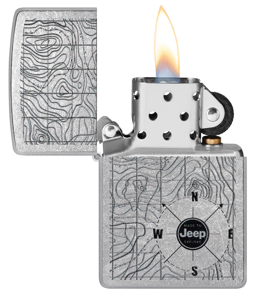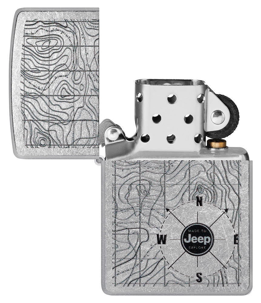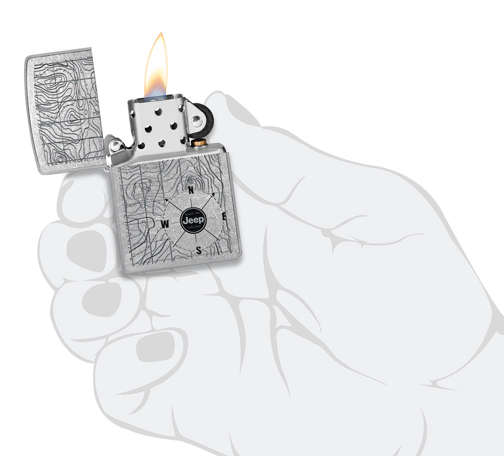 Erobern Sie die Natur mit diesem geländetauglichen Street Chrome-Feuerzeug. Das aufwendige Color Image-Design zeigt das Jeep® Logo über einem klassischen topografischen Kartenmotiv, das Sie zu Ihrem nächsten Abenteuer einlädt.