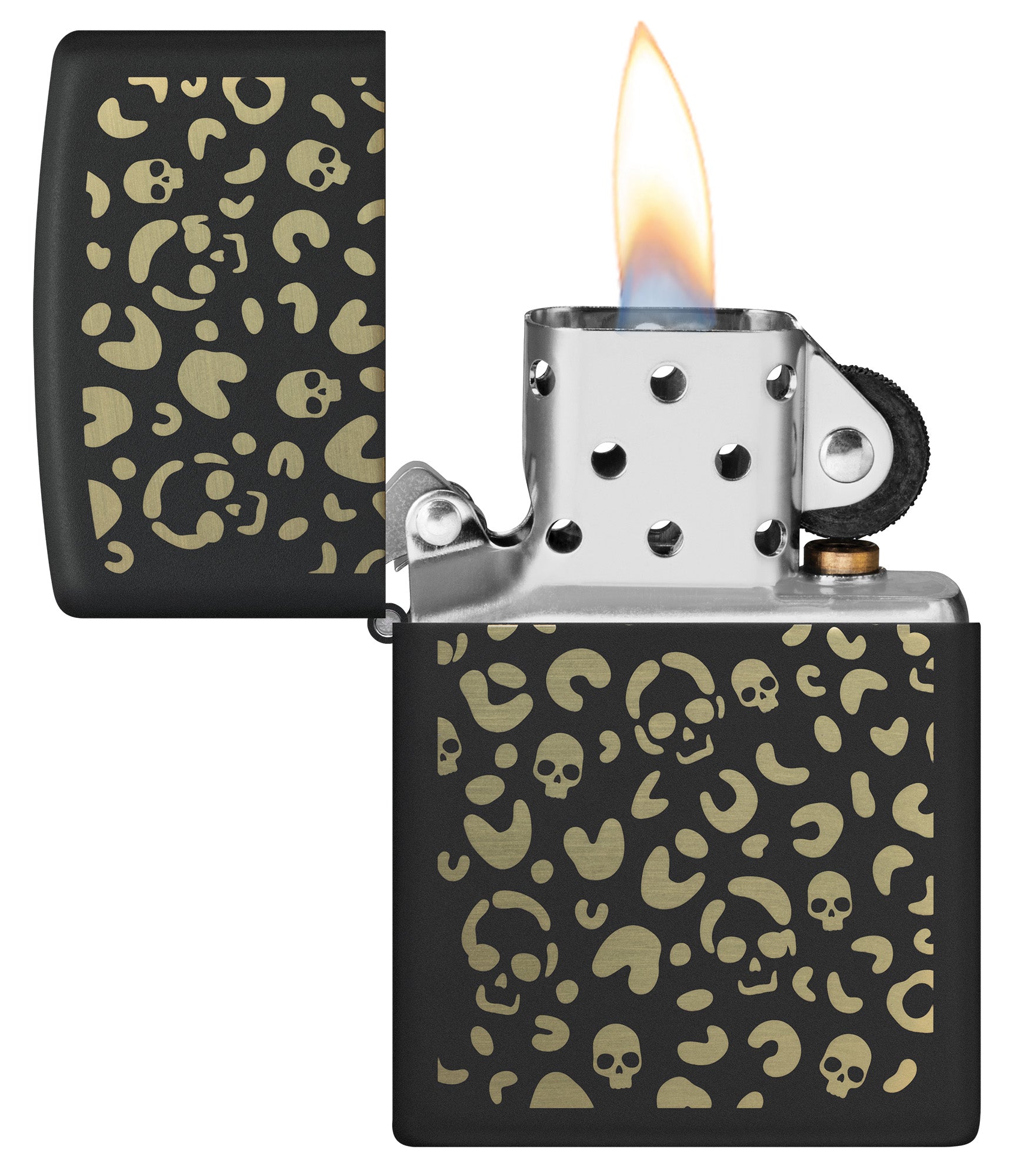 Dieses Feuerzeug in mattem Schwarz zeigt eines der edelsten Muster der Natur mit einer unheimlichen Besonderheit. Das Lasergravurdesign sieht auf den ersten Blick wie ein normales Leopardenmuster aus, offenbart aber bei genauerem Hinsehen verborgene Totenschädel.