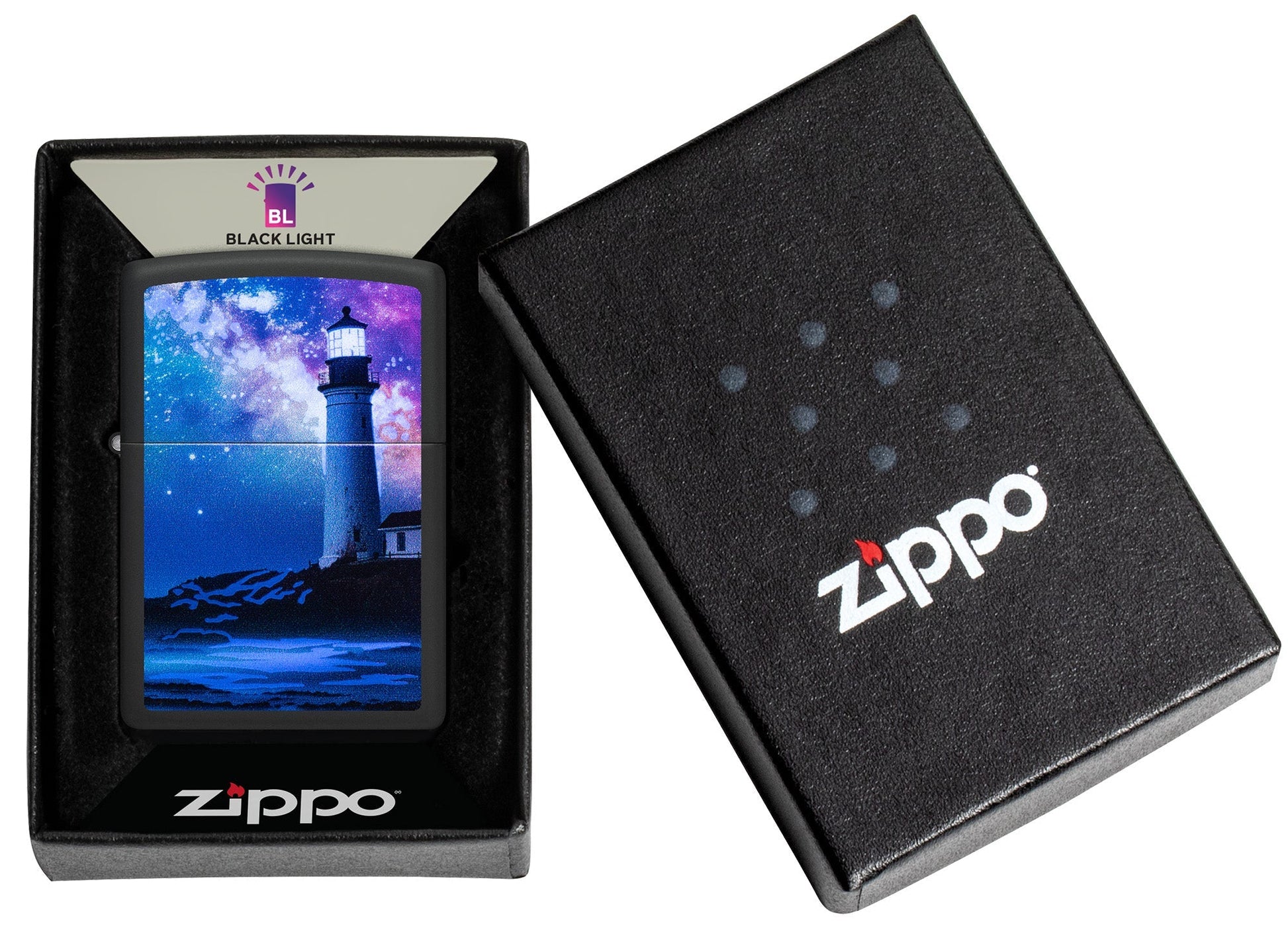 Vor der Kulisse eines strahlenden Sternenhimmels erhebt sich ein einsamer Leuchtturm auf der Oberfläche dieses klassischen Feuerzeugs in mattem Schwarz in einem ruhigen Farbbilddesign, das dank unseres speziellen Schwarzlichtverfahrens unter ultraviolettem Licht leuchtet.