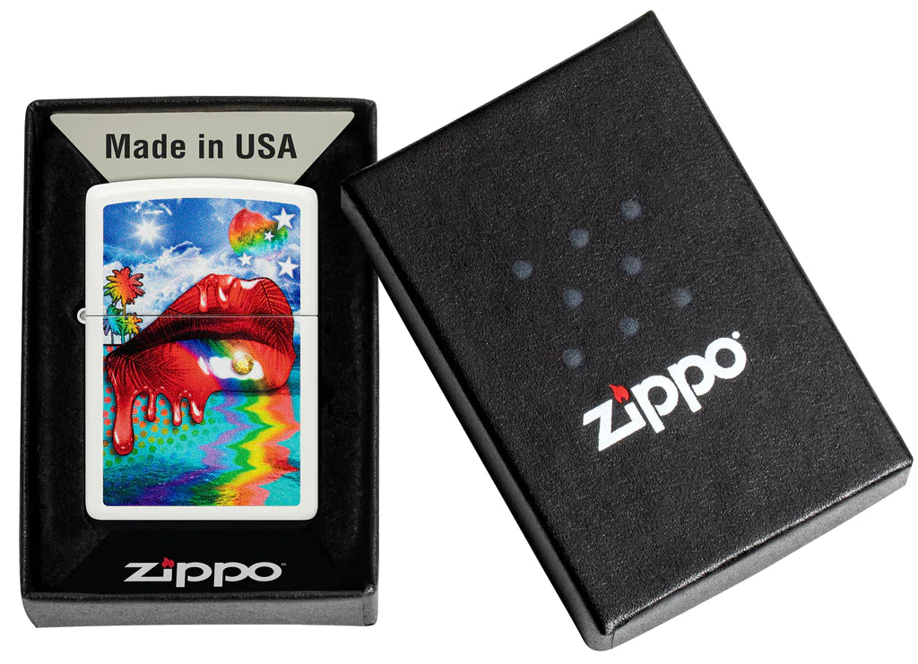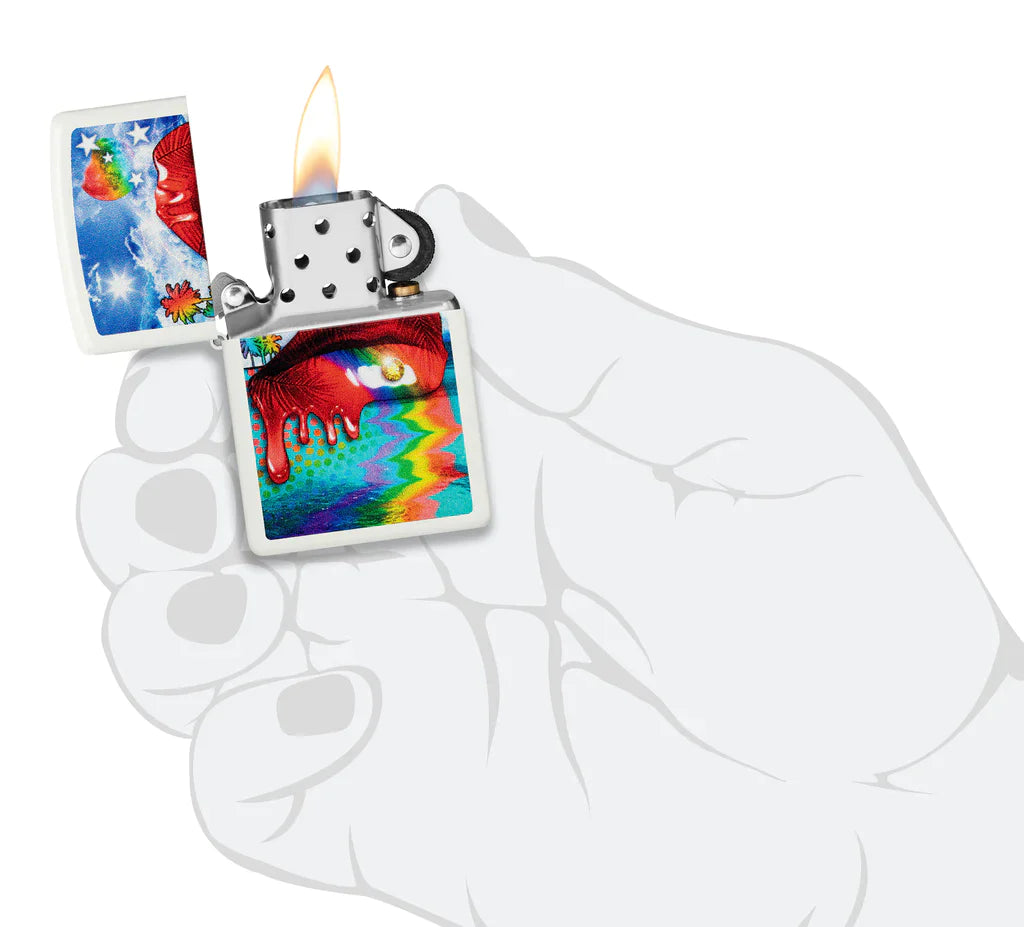 Ein Paar glitzernder Lippen verschmilzt unter einem schillernden Himmel auf diesem mattweißen Feuerzeug mit dem herrlich surrealen Color Image-Motiv. Das Feuerzeug ist in einer Geschenkbox verpackt. Für eine optimale Leistung füllen Sie das Feuerzeug mit Zippo-Benzin.