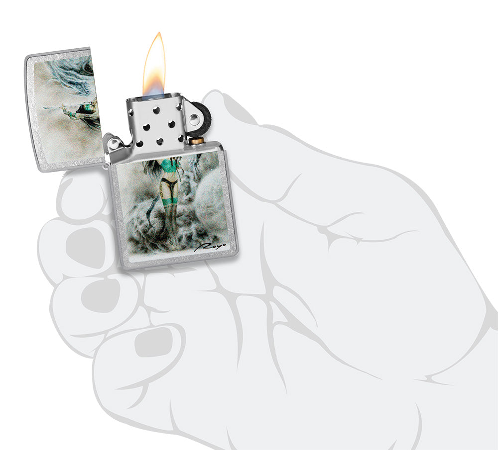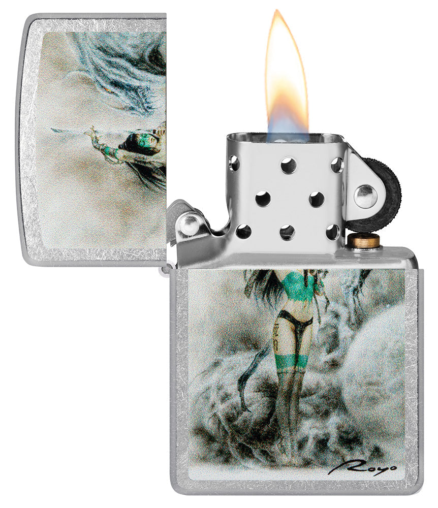 Die ikonische, traumartige Kunst von Luis Royo zeigt sich auf diesem klassischen Feuerzeug in Street Chrome. Dargestellt in seinem ikonischen Stil und wiedergegeben durch unser Farbbild-Verfahren, steht ein stoischer Krieger in herrlicher Detailtiefe einem wilden Drachen entschlossen gegenüber.