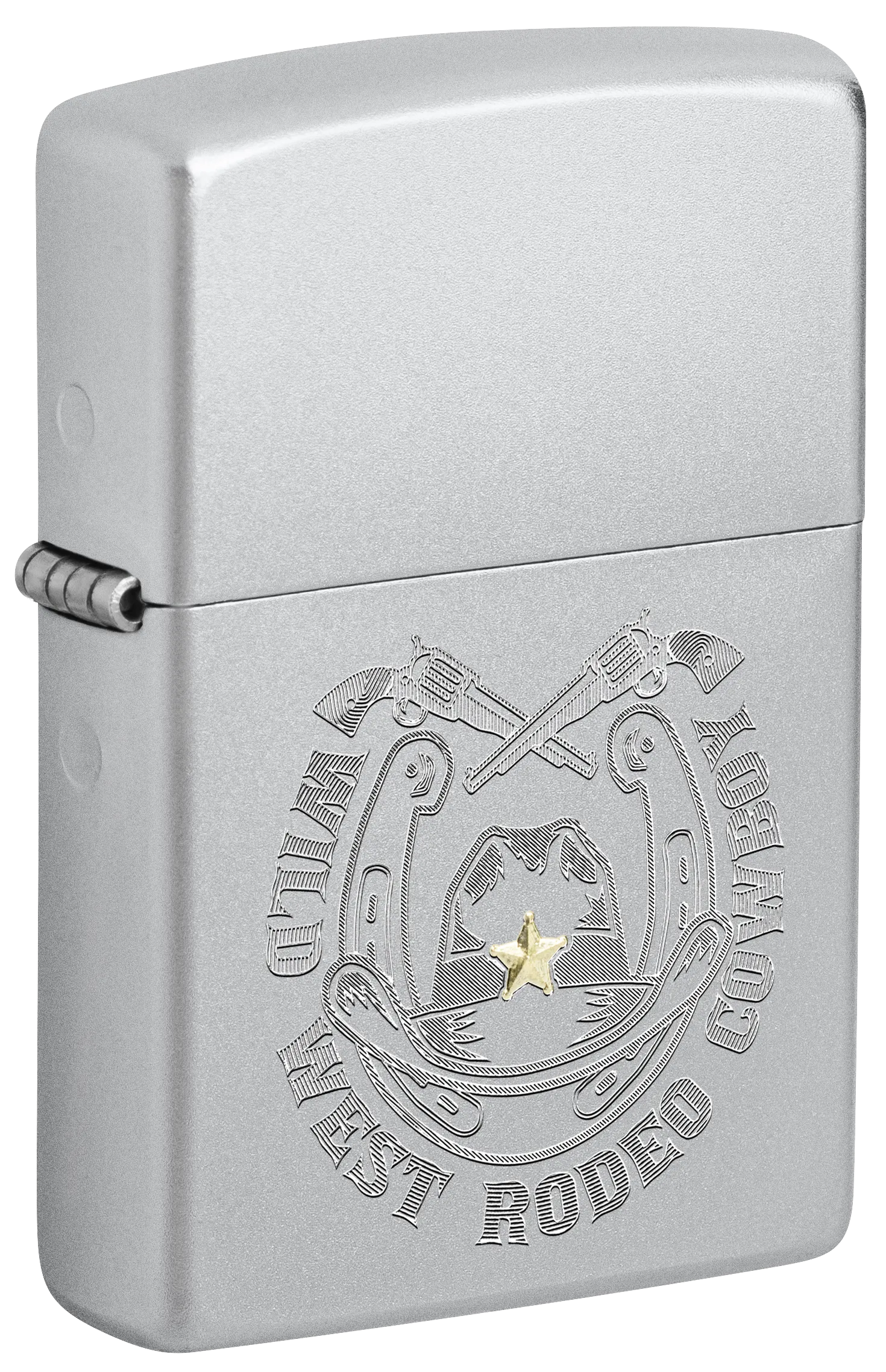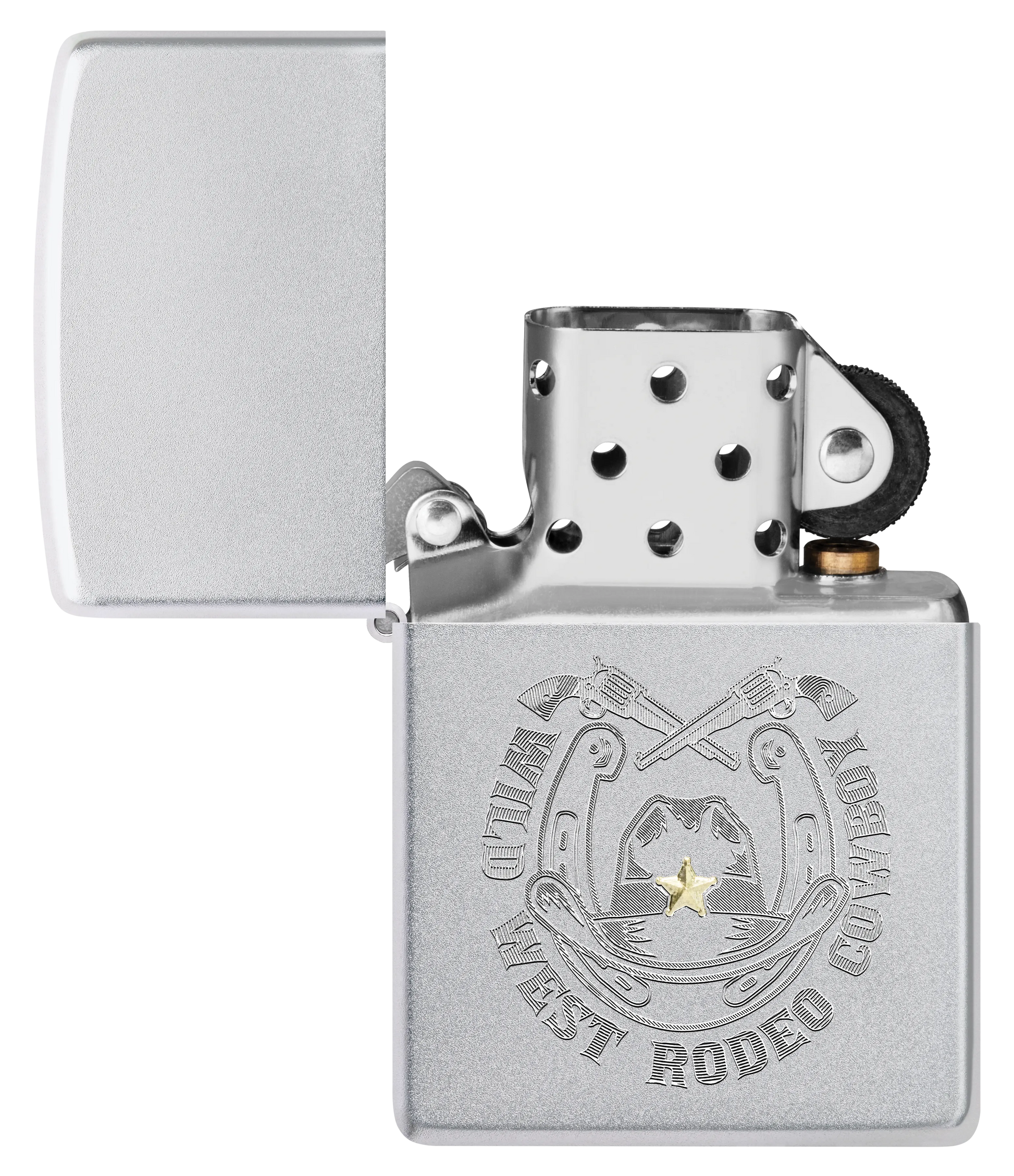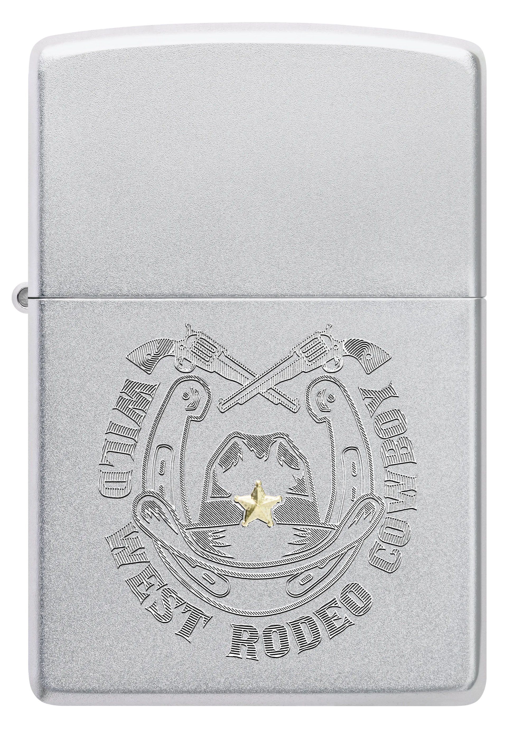 Mit diesem klassischen Feuerzeug in Satin Chrome bringst du einen Hauch Wilden Westen in deine Sammlung. Das von einem glänzenden Messingstern getragene Auto Two-Tone-Design, zeigt eine Art Wappen aus einem Hut, Pistolen, einem Hufeisen und der Aufschrift „Wild West Rodeo Cowboy“.
