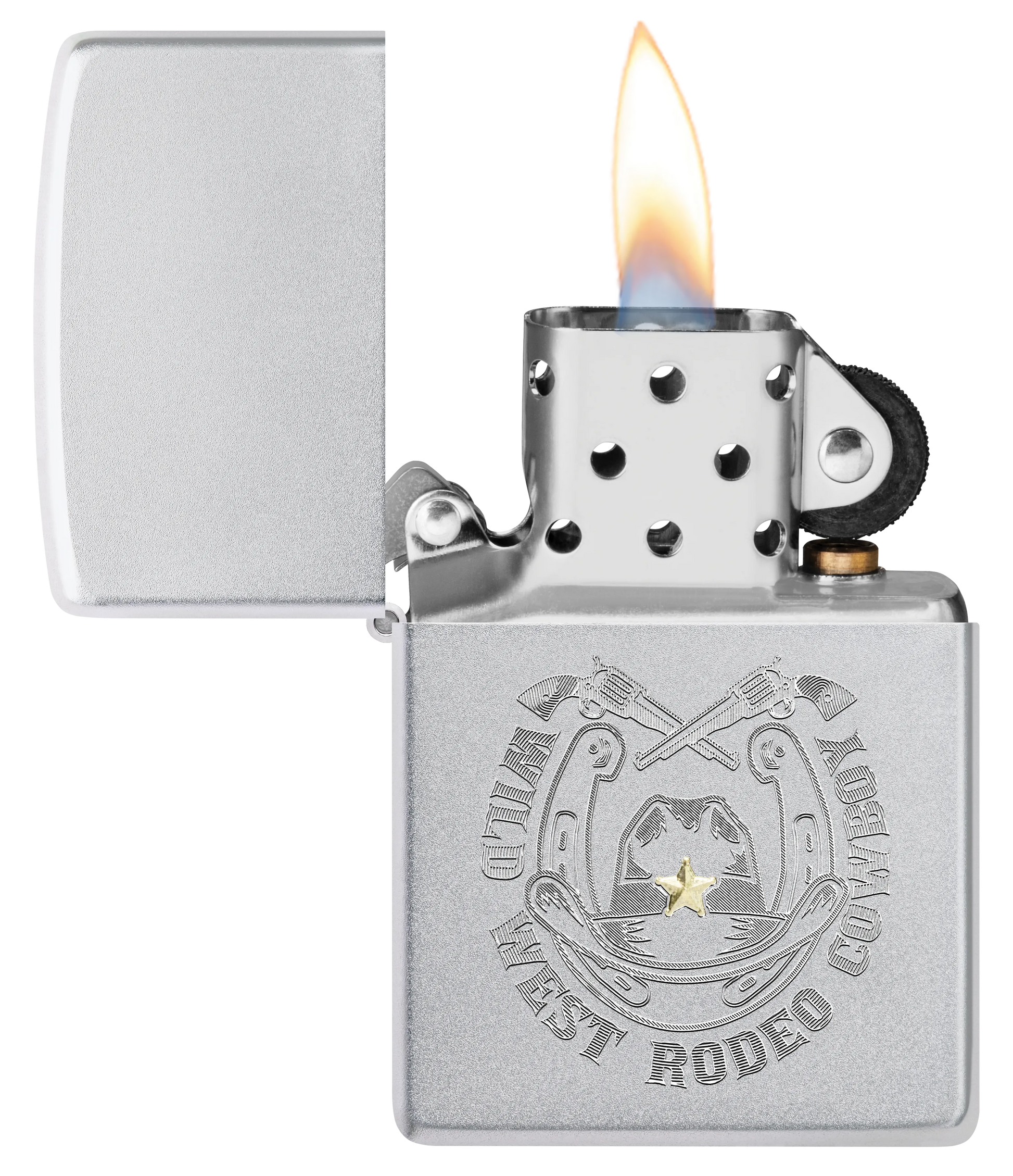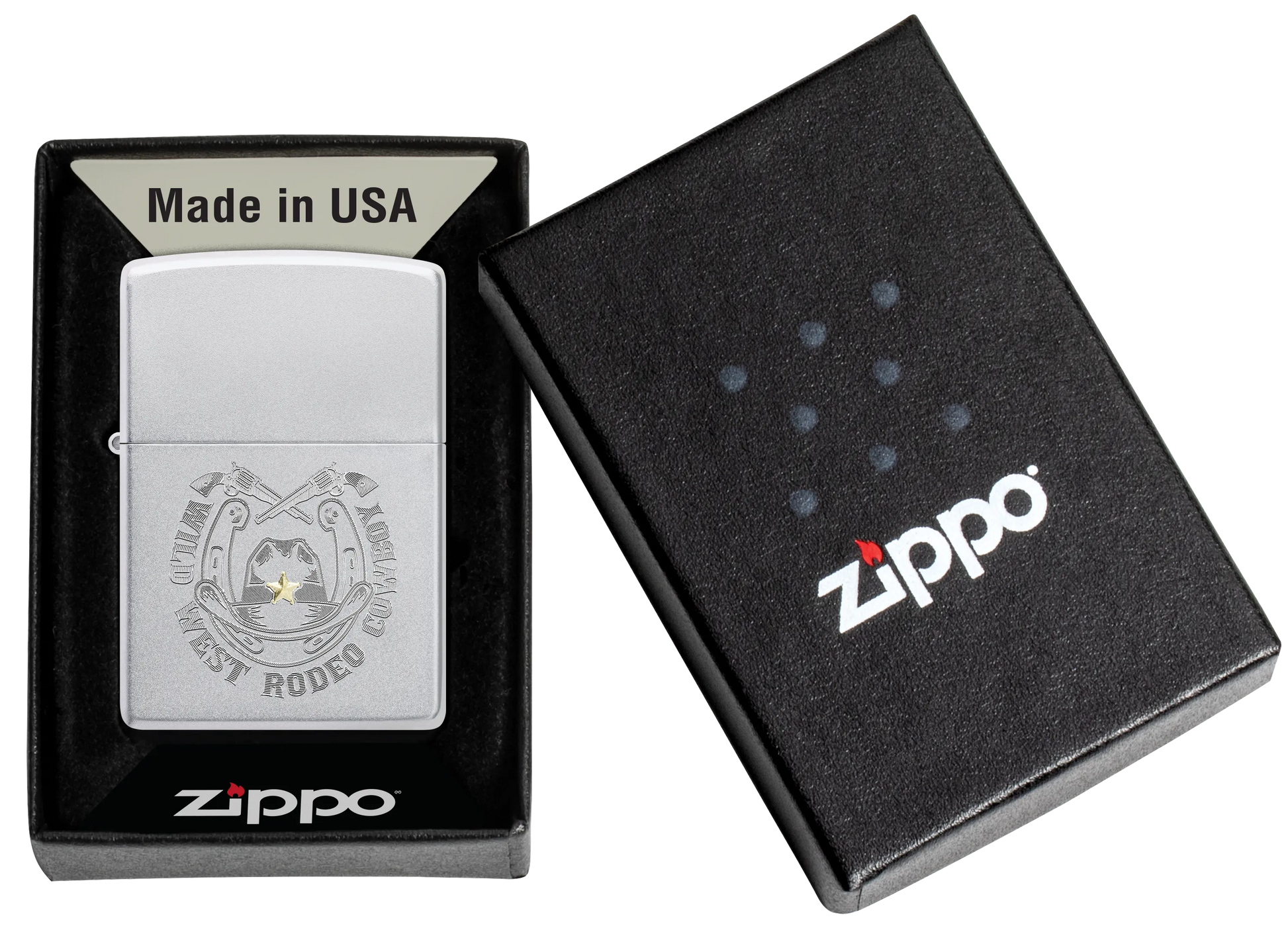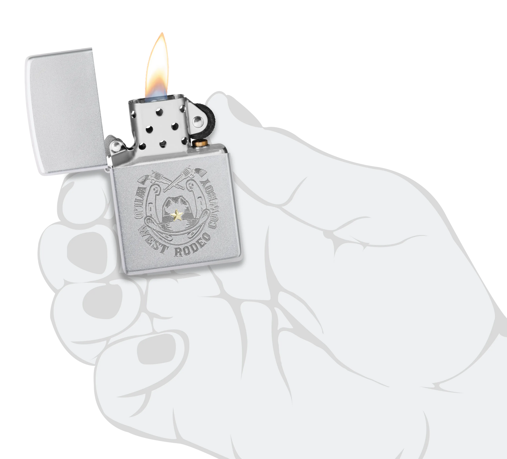 Mit diesem klassischen Feuerzeug in Satin Chrome bringst du einen Hauch Wilden Westen in deine Sammlung. Das von einem glänzenden Messingstern getragene Auto Two-Tone-Design, zeigt eine Art Wappen aus einem Hut, Pistolen, einem Hufeisen und der Aufschrift „Wild West Rodeo Cowboy“.