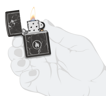 Surrounded by realistic-looking marble veining, the Zippo flame icon appears on the surface of this classic High Polish Black lighter in a mesmerizing Photo Image design.